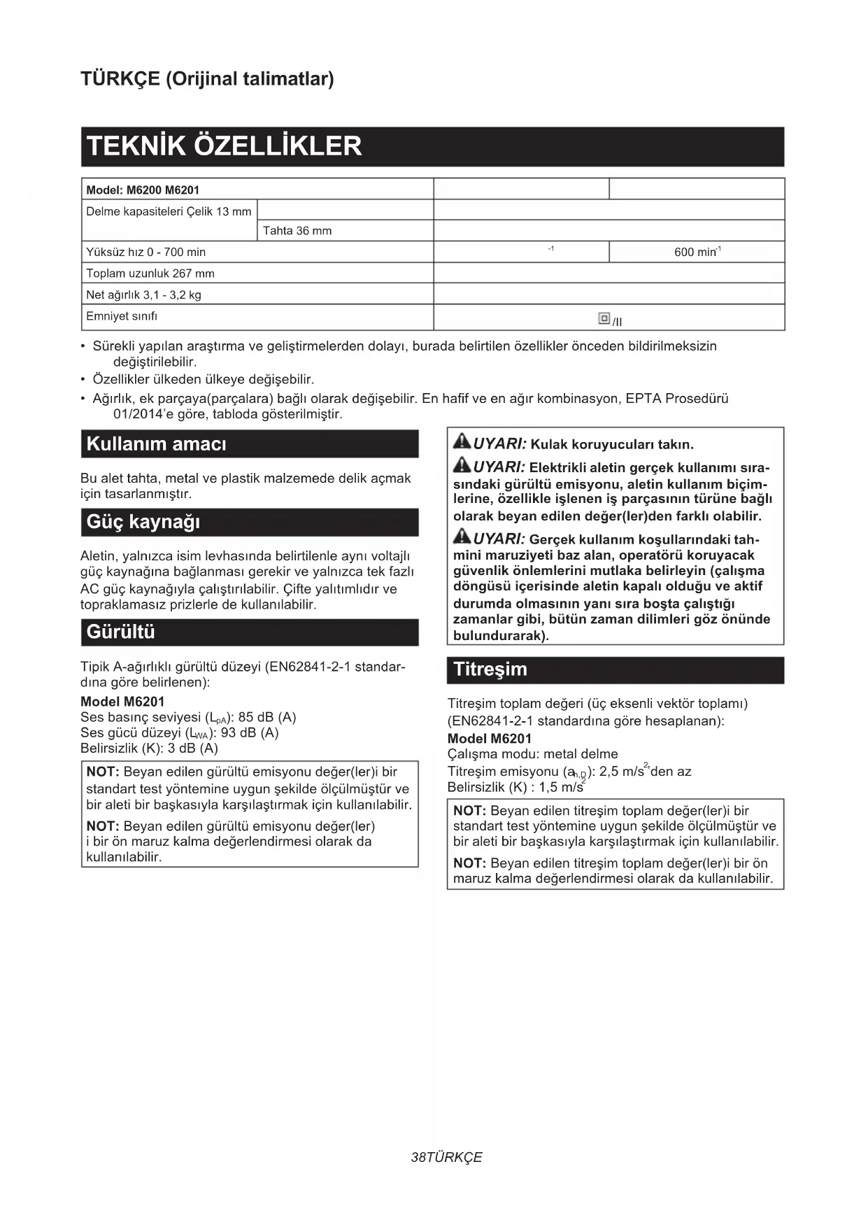 - Ağırlık, ek parçaya(parçalara) bağlı olarak değişebilir. En hafif ve en ağır kombinasyon, EPTA Prosedürü 01/2014’e göre, tabloda gösterilmiştir. Kullanım amacı Bu alet tahta, metal ve plastik malzemede delik açmak için tasarlanmıştır. Güç kaynağı Aletin, yalnızca isim levhasında belirtilenle aynı voltajlı güç kaynağına bağlanması gerekir ve yalnızca tek fazlı AC güç kaynağıyla çalıştırılabilir. Çifte yalıtımlıdır ve topraklamasız prizlerle de kullanılabilir. Gürültü Tipik A-ağırlıklı gürültü düzeyi (EN62841-2-1 standar- dına göre belirlenen): Model M6201 Ses basınç seviyesi (L