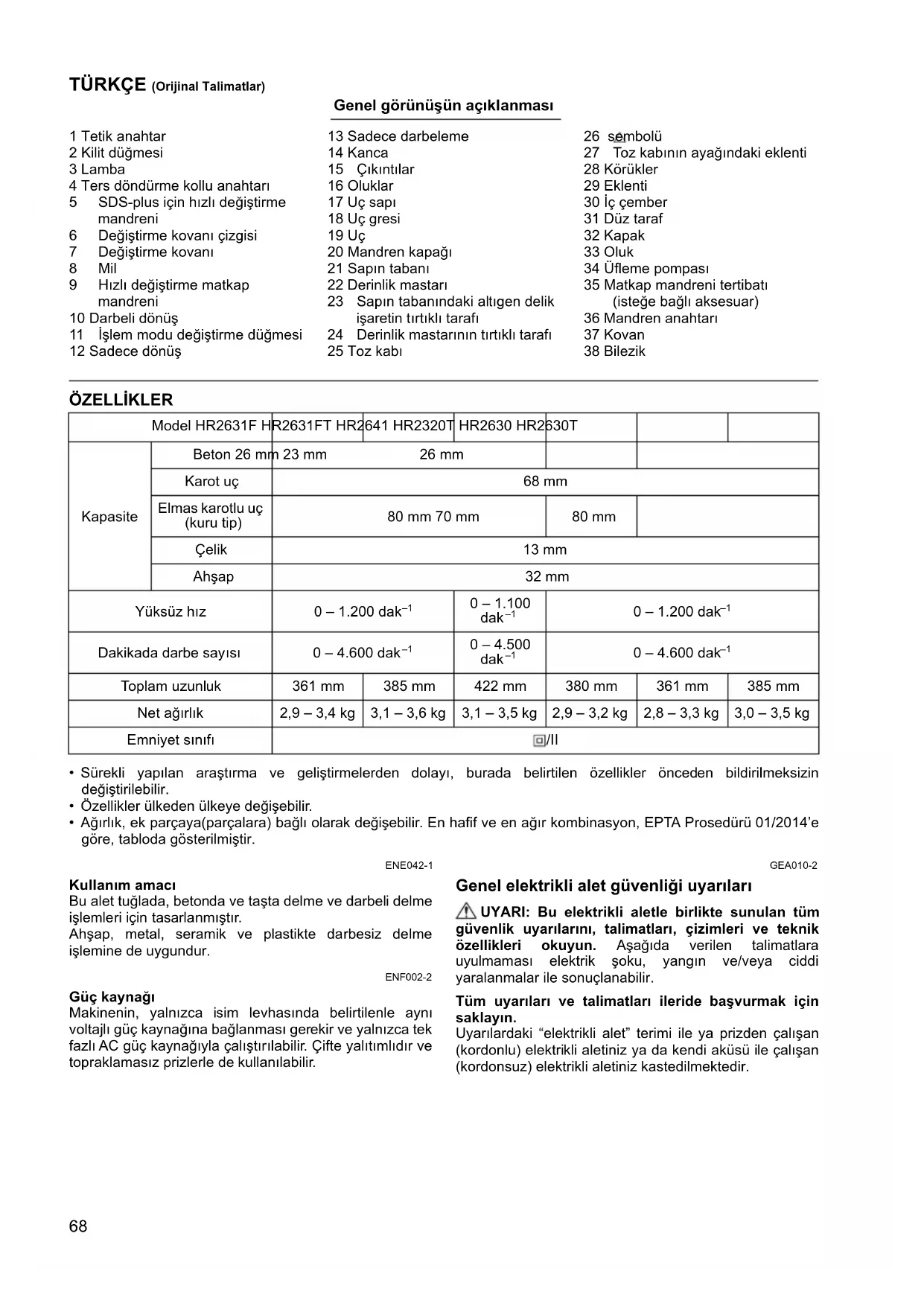 - Ağırlık, ek parçaya(parçalara) bağlı olarak değişebilir. En hafif ve en ağır kombinasyon, EPTA Prosedürü 01/2014’e göre, tabloda gösterilmiştir. ENE042-1 Kullanım amacı Bu alet tuğlada, betonda ve taşta delme ve darbeli delme işlemleri için tasarlanmıştır. Ahşap, metal, seramik ve plastikte darbesiz delme işlemine de uygundur. ENF002-2 Güç kaynağı Makinenin, yalnızca isim levhasında belirtilenle aynı voltajlı güç kaynağına bağlanması gerekir ve yalnızca tek fazlı AC güç kaynağıyla çalıştırılabilir. Çifte yalıtımlıdır ve topraklamasız prizlerle de kullanılabilir. GEA010-2 Genel elektrikli alet güvenliği uyarıları UYARI: Bu elektrikli aletle birlikte sunulan tüm güvenlik uyarılarını, talimatları, çizimleri ve teknik özellikleri okuyun. Aşağıda verilen talimatlara uyulmaması elektrik şoku, yangın ve/veya ciddi yaralanmalar ile sonuçlanabilir. Tüm uyarıları ve talimatları ileride başvurmak için saklayın. Uyarılardaki “elektrikli alet” terimi ile ya prizden çalışan (kordonlu) elektrikli aletiniz ya da kendi aküsü ile çalışan (kordonsuz) elektrikli aletiniz kastedilmektedir. Model HR2631F HR2631FT HR2641 HR2320T HR2630 HR2630T Kapasite Beton 26 mm 23 mm 26 mm Karot uç 68 mm Elmas karotlu uç (kuru tip) 80 mm 70 mm 80 mm Çelik 13 mm Ahşap 32 mm Yüksüz hız 0 – 1.200 dak
