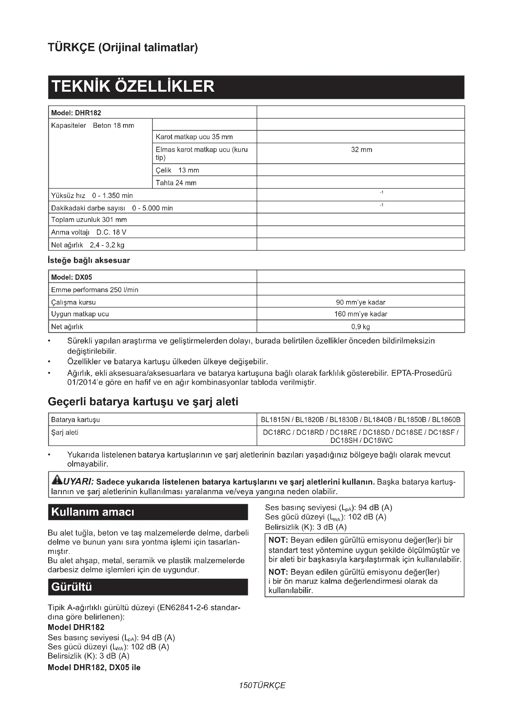 - Yukarıdalistelenenbataryakartuşlarınınveşarjaletlerininbazılarıyaşadığınızbölgeyebağlıolarakmevcut olmayabilir. UYARI: Sadece yukarıda listelenen batarya kartuşlarını ve şarj aletlerini kullanın.Başkabataryakartuş- larınınveşarjaletlerininkullanılmasıyaralanmave/veyayangınanedenolabilir. Kullanım amacı Bualettuğla,betonvetaşmalzemelerdedelme,darbeli delmevebununyanısırayontmaişlemiiçintasarlan- mıştır. Bualetahşap,metal,seramikveplastikmalzemelerde darbesizdelmeişlemleriiçindeuygundur. Gürültü TipikA-ağırlıklıgürültüdüzeyi(EN62841-2-6standar- dınagörebelirlenen): Model DHR182 Sesbasınçseviyesi(L