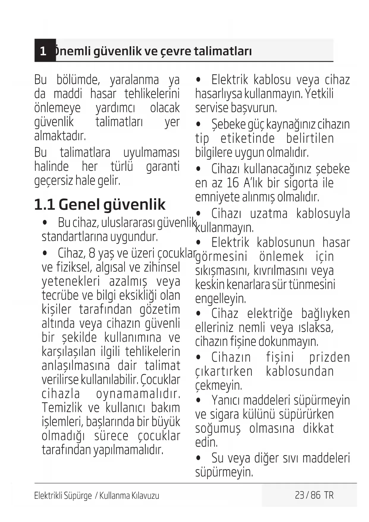 Can ve mal güvenliğiyle ilgili tehlikeli durumlar konusunda uyarılar. Elektrik çarpmasına karşı koruma sınıfı. Bu ürün çevreye saygılı modern tesislerde doğaya zarar vermeden üretilmiştir.AEEE Yönetmeliğine Uygundur.PCB içermez.Menşei P.R.C.22 / 86 TR Elektrikli Süpürge / Kullanma Kılavuzu İÇİNDEKİLER 1 Önemli güvenlik ve çevre talimatları 23