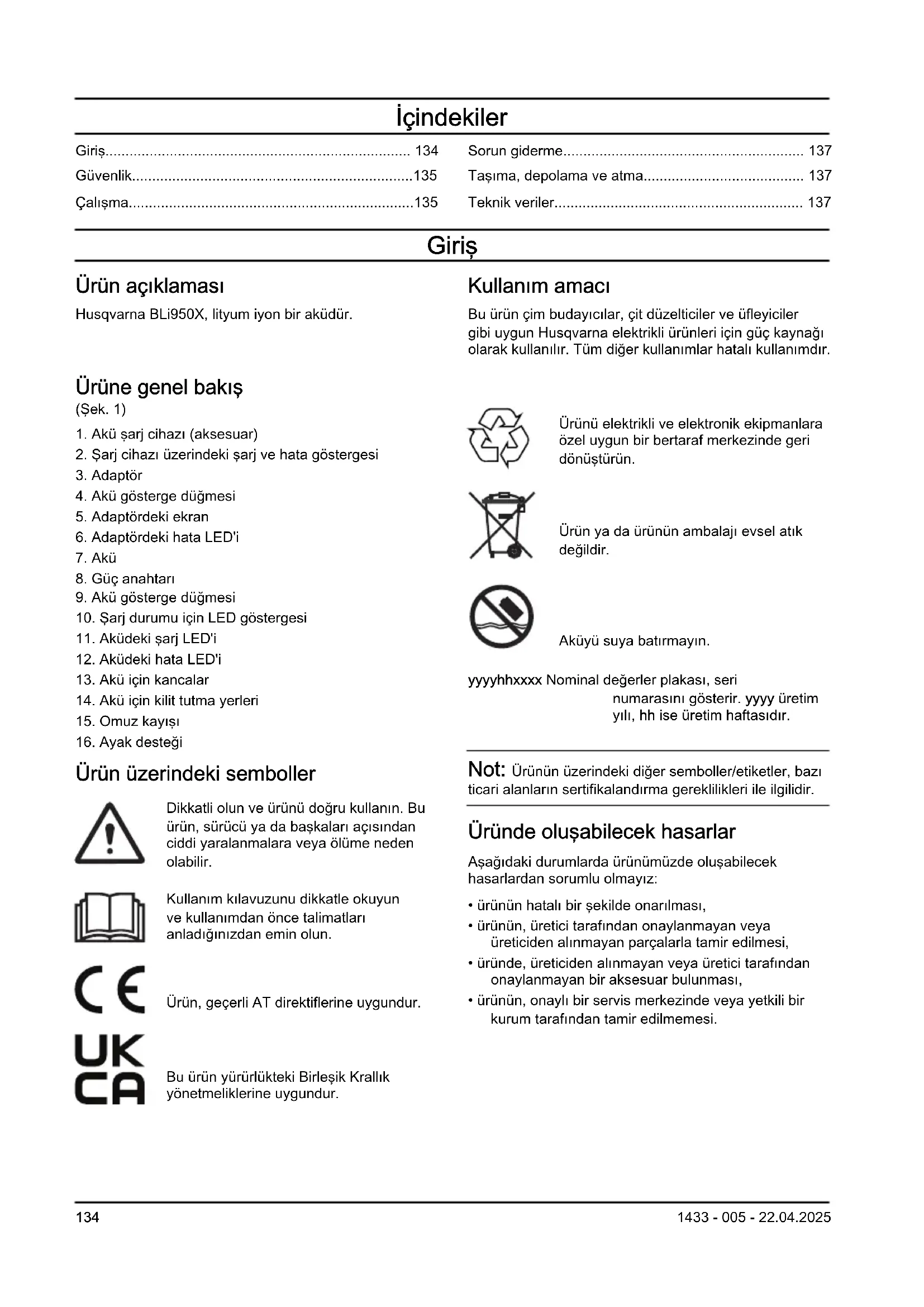 1433 - 005 - 22.04.2025Güvenlik Güvenlik tanımları Kılavuzdaki önemli kısımları vurgulamak için uyarılar ve notlar kullanılmıştır. UYARI: Kılavuzdaki talimatlara uyulmadığı takdirde operatör veya çevredeki kişiler için ciddi yaralanma veya ölüm tehlikesi varsa kullanılır. DİKKAT: Kılavuzdaki talimatlara uyulmadığı takdirde ürünün, diğer malzemelerin veya çevrenin zarar görme riski olduğunda kullanılır. Not: Belirli bir durumda bilgi verilmesi gerektiğinde kullanılır. Önemli güvenlik talimatları UYARI: Tüm güvenlik uyarılarını ve talimatları okuyun. Uyarılar ve talimatların göz ardı edilmesi elektrik çarpmasına, yangına ve/veya ciddi yaralanmalara neden olabilir. Not: Tüm uyarı ve talimatları saklayın.