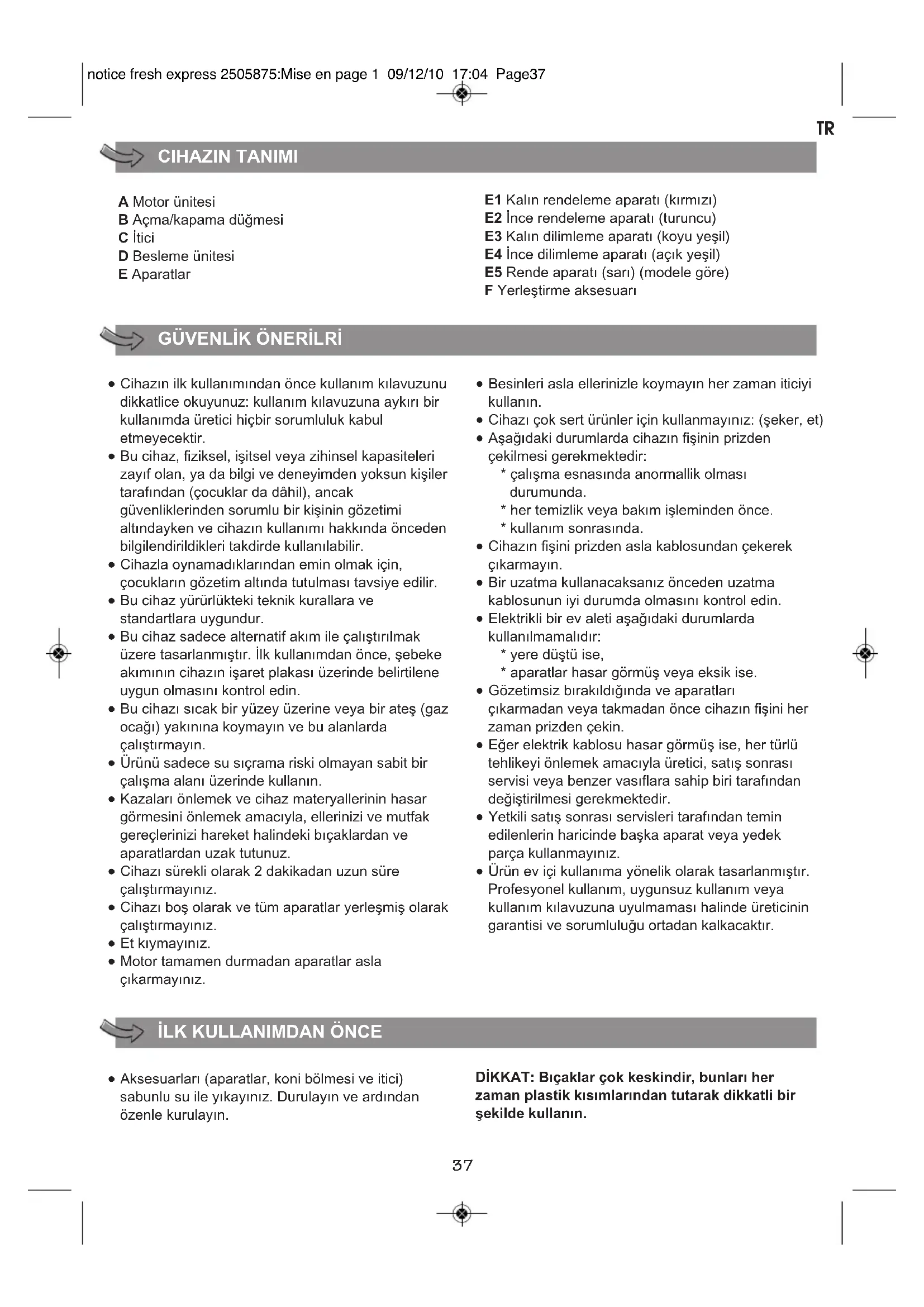 E1 Kalın rendeleme aparatı (kırmızı) E2 İnce rendeleme aparatı (turuncu) E3 Kalın dilimleme aparatı (koyu yeşil) E4 İnce dilimleme aparatı (açık yeşil) E5 Rende aparatı (sarı) (modele göre) F Yerleştirme aksesuarı ● Cihazın ilk kullanımından önce kullanım kılavuzunu dikkatlice okuyunuz: kullanım kılavuzuna aykırı bir kullanımda üretici hiçbir sorumluluk kabul etmeyecektir. ● Bu cihaz, fiziksel, işitsel veya zihinsel kapasiteleri zayıf olan, ya da bilgi ve deneyimden yoksun kişiler tarafından (çocuklar da dâhil), ancak güvenliklerinden sorumlu bir kişinin gözetimi altındayken ve cihazın kullanımı hakkında önceden bilgilendirildikleri takdirde kullanılabilir. ● Cihazla oynamadıklarından emin olmak için, çocukların gözetim altında tutulması tavsiye edilir. ● Bu cihaz yürürlükteki teknik kurallara ve standartlara uygundur. ● Bu cihaz sadece alternatif akım ile çalıştırılmak üzere tasarlanmıştır. İlk kullanımdan önce, şebeke akımının cihazın işaret plakası üzerinde belirtilene uygun olmasını kontrol edin. ● Bu cihazı sıcak bir yüzey üzerine veya bir ateş (gaz ocağı) yakınına koymayın ve bu alanlarda çalıştırmayın. ● Ürünü sadece su sıçrama riski olmayan sabit bir çalışma alanı üzerinde kullanın. ● Kazaları önlemek ve cihaz materyallerinin hasar görmesini önlemek amacıyla, ellerinizi ve mutfak gereçlerinizi hareket halindeki bıçaklardan ve aparatlardan uzak tutunuz. ● Cihazı sürekli olarak 2 dakikadan uzun süre çalıştırmayınız. ● Cihazı boş olarak ve tüm aparatlar yerleşmiş olarak çalıştırmayınız. ● Et kıymayınız. ● Motor tamamen durmadan aparatlar asla çıkarmayınız. ● Besinleri asla ellerinizle koymayın her zaman iticiyi kullanın. ● Cihazı çok sert ürünler için kullanmayınız: (şeker, et) ● Aşağıdaki durumlarda cihazın fişinin prizden çekilmesi gerekmektedir: