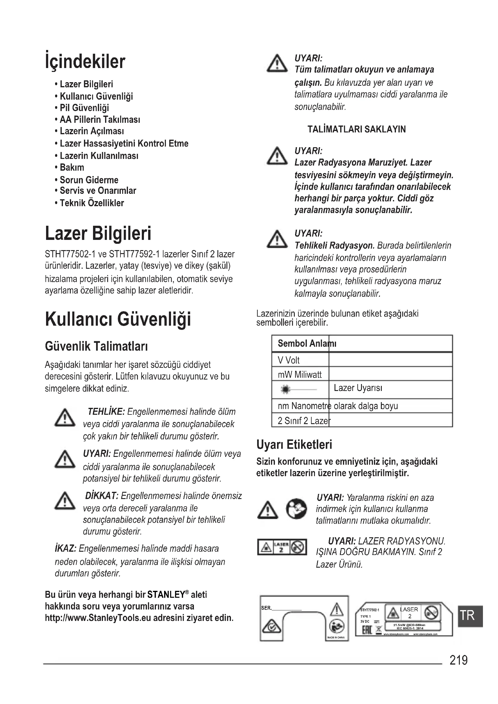 - Teknik Özellikler Lazer Bilgileri STHT77502-1 ve STHT77592-1 lazerler Sınıf 2 lazer ürünleridir. Lazerler, yatay (tesviye) ve dikey (şakül) hizalama projeleri için kullanılabilen, otomatik seviye ayarlama özelliğine sahip lazer aletleridir. Kullanıcı Güvenliği Güvenlik Talimatları Aşağıdaki tanımlar her işaret sözcüğü ciddiyet derecesini gösterir. Lütfen kılavuzu okuyunuz ve bu simgelere dikkat ediniz. TEHLİKE: Engellenmemesi halinde ölüm veya ciddi yaralanma ile sonuçlanabilecek çok yakın bir tehlikeli durumu gösterir. UYARI: Engellenmemesi halinde ölüm veya ciddi yaralanma ile sonuçlanabilecek potansiyel bir tehlikeli durumu gösterir. DİKKAT: Engellenmemesi halinde önemsiz veya orta dereceli yaralanma ile sonuçlanabilecek potansiyel bir tehlikeli durumu gösterir. İKAZ: Engellenmemesi halinde maddi hasara neden olabilecek, yaralanma ile ilişkisi olmayan durumları gösterir. Bu ürün veya herhangi bir STANLEY