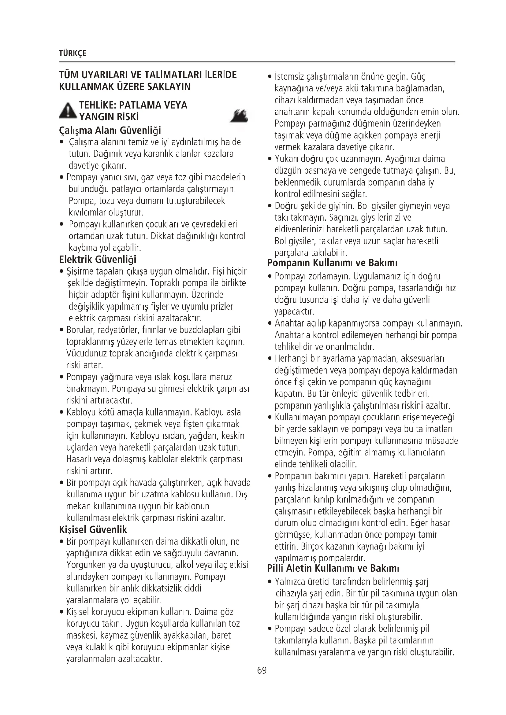 - Kötü kullanım koşullarında aküden sıvı çıkabilir; bu tür sıvılara temas etmekten kaçının. Kazara temas olursa temas eden kısmı suyla yıkayın. Sıvı gözlere temas ederse mutlaka tıbbi yardım alın. Aküden çıkan sıvı tahrişe veya yanıklara neden olabilir. Servis Pompaya yalnızca aynı yedek parçalar kullanılarak kalifiye bir tamirci tarafından bakım yaptırın. Bu, pompanın güvenli bir şekilde kullanılmasını sağlar. UYARI: Pompadan gelen basınçlı havanın solunması güvenli değildir. Pompadan veya pompaya bağlı bir solunum cihazından gelen havayı asla solumayın..