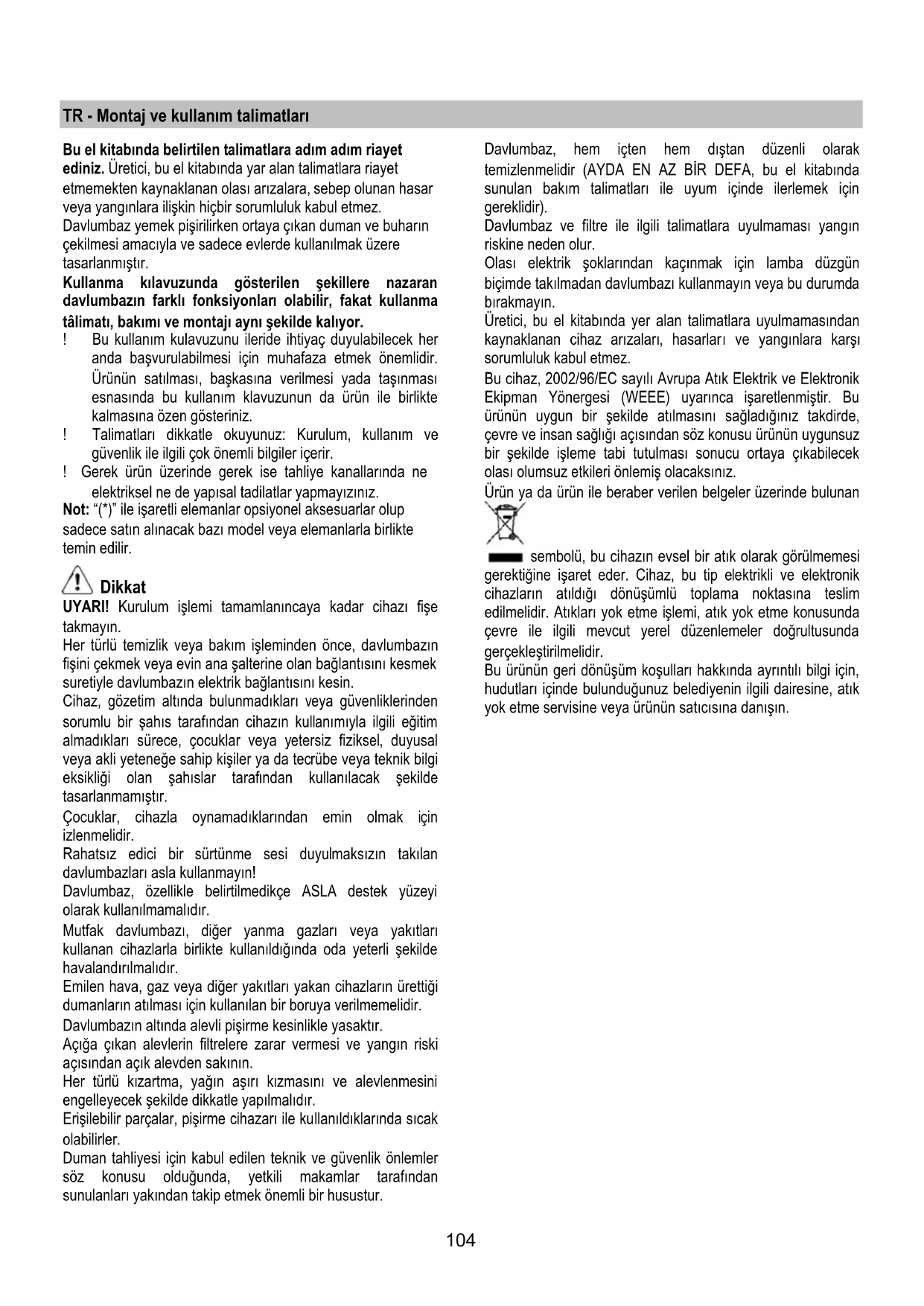 Pritisnite u trajanju od 3 sekunde tipku, isključuje se elektronika za upravljanje kuhinjskom napom. Ova funkcija može biti korisna za vrijeme čišćenja proizvoda. Da biste uključili elektroniku dovoljno je ponoviti proceduru. U slučaju eventualnih anomalija prilikom funkcioniranja , prije nego što se obratite tehničkom servisu iskopčajte barem 5 sekundi aparat s električne mreže vadeći utikač i onda ga opet uključite. U slučaju da se te anomalije javljaju i ubuduće, obratite se tehničkom servisu.103 Održavanje Upozorenje! Prije bilo kakvog postupka čišćenja ili održavanja, iskopčajte kuhinjsku napu od napajanja strujom na način da izvadite utičnicu ili isključite opći prekidač kuće. Čišćenje Kuhinjska napa se treba često čistiti ( barem isto tako često kao i filtri za uklanjanje masnoće), u unutrašnjosti i izvana. Koristite ovlaženu krpu s neutralnim deterdžentima u tekućem stanju. Izbjegavajte uporabu proizvoda koji bi mogli grebati. NE KORISTITE ALKOHOL! Pozor: Nepoštivanje pravila o čišćenju aparata i pravila o zamjeni filtara povećava rizik od požara. Stoga se preporučuje poštivanje sugeriranih uputstava. Otklanjamo bilo kakvu odgovornost za eventualne kvarove na motoru, požar izazvan neodgovarajućim održavanjem ili nepoštivanjem navedenih upozorenja. Filtar za masnoću Slika 19-25 Zadržava čestice masnoće koje se stvaraju prilikom kuhanja. Trebate ga očistiti jedan put na mjesec (ili kada indikator prepunjavanja filtra to pokazuje – ukoliko model koji ste kupili predviđa takvu mogućnost), upotrebljavajući blage deterdžente, ručno ili u perilici posuđa na niskoj temperaturi i uključite kratki ciklus. Nakon pranja u perilici posuđa filtar za uklanjanje masnoće bii mogao djelovati isprano i izgubiti boju ali njegove karakteristike filtriranja se ni u kojem slučaju ne mijenjaju. Da biste skinuli filtar za uklanjanje masnoće povucite ručicu na opruge koja se otkvači. Karbonski filtar (samo za filtracijsku verziju) Slika 23 Zadržava neugodne mirise koji se stvaraju prilikom kuhanja. Karbonski filtar se može oprati svako dva mjeseca ( ili kada sustav indikacije zasićenja filtara- ako je predviđen na modelu kojeg imate- prikazuje potrebu za time) u toploj vodi i prikladnim deterdžentima ili u perilici posuđa na temperaturi od 65°C ( u slučaju da se radi o pranju u perilici posuđa obavite kompletan ciklus pranja bez posuđa unutra). Odstranite višak vode bez da time oštetite filtar, nakon čega ga trebate staviti u pećnicu u trajanju od 10 minuta na 100°C da bi se definitivo osušio. Zamijenite madraščić svako 3 godine ili kada primijetite da je tkanina oštećena. Zamjena Lampe Kuhinjska napa je opremljena sustavom rasvjete koji se bazira na tehnologiji INDIKACIONIH SVJETALA. INDIKACIONA SVJETLA garantiraju optimalnu rasvjetu te trajnost 10 puta veću od tradicionalnih lampi a omogućuju i uštedu od 90% električne energije. Per la sostituzione rivolgersi al servizio assistenza tecnica.104 TR - Montaj ve kullanım talimatları Bu el kitabında belirtilen talimatlara adım adım riayet ediniz. Üretici, bu el kitabında yar alan talimatlara riayet etmemekten kaynaklanan olası arızalara, sebep olunan hasar veya yangınlara ilişkin hiçbir sorumluluk kabul etmez. Davlumbaz yemek pişirilirken ortaya çıkan duman ve buharın çekilmesi amacıyla ve sadece evlerde kullanılmak üzere tasarlanmıştır. Kullanma kılavuzunda gösterilen şekillere nazaran davlumbazın farklı fonksiyonları olabilir, fakat kullanma tâlimatı, bakımı ve montajı aynı şekilde kalıyor. ! Bu kullanım kulavuzunu ileride ihtiyaç duyulabilecek her anda başvurulabilmesi için muhafaza etmek önemlidir. Ürünün satılması, başkasına verilmesi yada taşınması esnasında bu kullanım klavuzunun da ürün ile birlikte kalmasına özen gösteriniz. ! Talimatları dikkatle okuyunuz: Kurulum, kullanım ve güvenlik ile ilgili çok önemli bilgiler içerir. ! Gerek ürün üzerinde gerek ise tahliye kanallarında ne elektriksel ne de yapısal tadilatlar yapmayızınız. Not: “(*)” ile işaretli elemanlar opsiyonel aksesuarlar olup sadece satın alınacak bazı model veya elemanlarla birlikte temin edilir. Dikkat UYARI! Kurulum işlemi tamamlanıncaya kadar cihazı fişe takmayın. Her türlü temizlik veya bakım işleminden önce, davlumbazın fişini çekmek veya evin ana şalterine olan bağlantısını kesmek suretiyle davlumbazın elektrik bağlantısını kesin. Cihaz, gözetim altında bulunmadıkları veya güvenliklerinden sorumlu bir şahıs tarafından cihazın kullanımıyla ilgili eğitim almadıkları sürece, çocuklar veya yetersiz fiziksel, duyusal veya akli yeteneğe sahip kişiler ya da tecrübe veya teknik bilgi eksikliği olan şahıslar tarafından kullanılacak şekilde tasarlanmamıştır. Çocuklar, cihazla oynamadıklarından emin olmak için izlenmelidir. Rahatsız edici bir sürtünme sesi duyulmaksızın takılan davlumbazları asla kullanmayın! Davlumbaz, özellikle belirtilmedikçe ASLA destek yüzeyi olarak kullanılmamalıdır. Mutfak davlumbazı, diğer yanma gazları veya yakıtları kullanan cihazlarla birlikte kullanıldığında oda yeterli şekilde havalandırılmalıdır. Emilen hava, gaz veya diğer yakıtları yakan cihazların ürettiği dumanların atılması için kullanılan bir boruya verilmemelidir. Davlumbazın altında alevli pişirme kesinlikle yasaktır. Açığa çıkan alevlerin filtrelere zarar vermesi ve yangın riski açısından açık alevden sakının. Her türlü kı zartma, yağın aşırı kızmasını ve alevlenmesini engelleyecek şekilde dikkatle yapılmalıdır. Erişilebilir parçalar, pişirme cihazarı ile kullanıldıklarında sıcak olabilirler. Duman tahliyesi için kabul edilen teknik ve güvenlik önlemler söz konusu olduğunda, yetkili makamlar tarafından sunulanları yakından takip etmek önemli bir husustur. Davlumbaz, hem içten hem dı