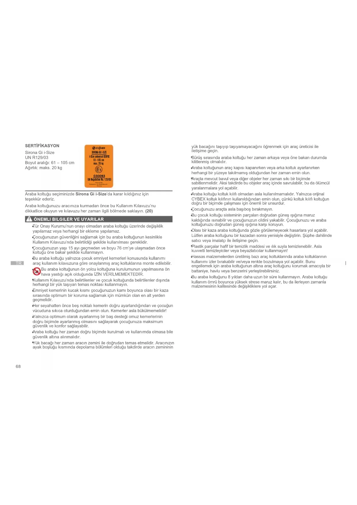 Bu bir i-Size Geliştirilmiş Çocuk Koltuğu Sistemidir. UN Düzenleme No. R129/03, araç üreticileri tarafından araç kullanım kılavuzlarında belirtildiği üzere i-Size uyumlu araç koltuğunun farklı konumlarında kullanıma yöneliktir. Aracınızda bir i-Size oturma konumu yoksa lütfen ekteki araç Tür Listesi’ni kontrol edin. Tür Listesi’nin en güncel versiyonunu www.cybex-online.com adresinden elde edebilirsiniz. ARACA KURULUM Her zaman şundan emin olun: