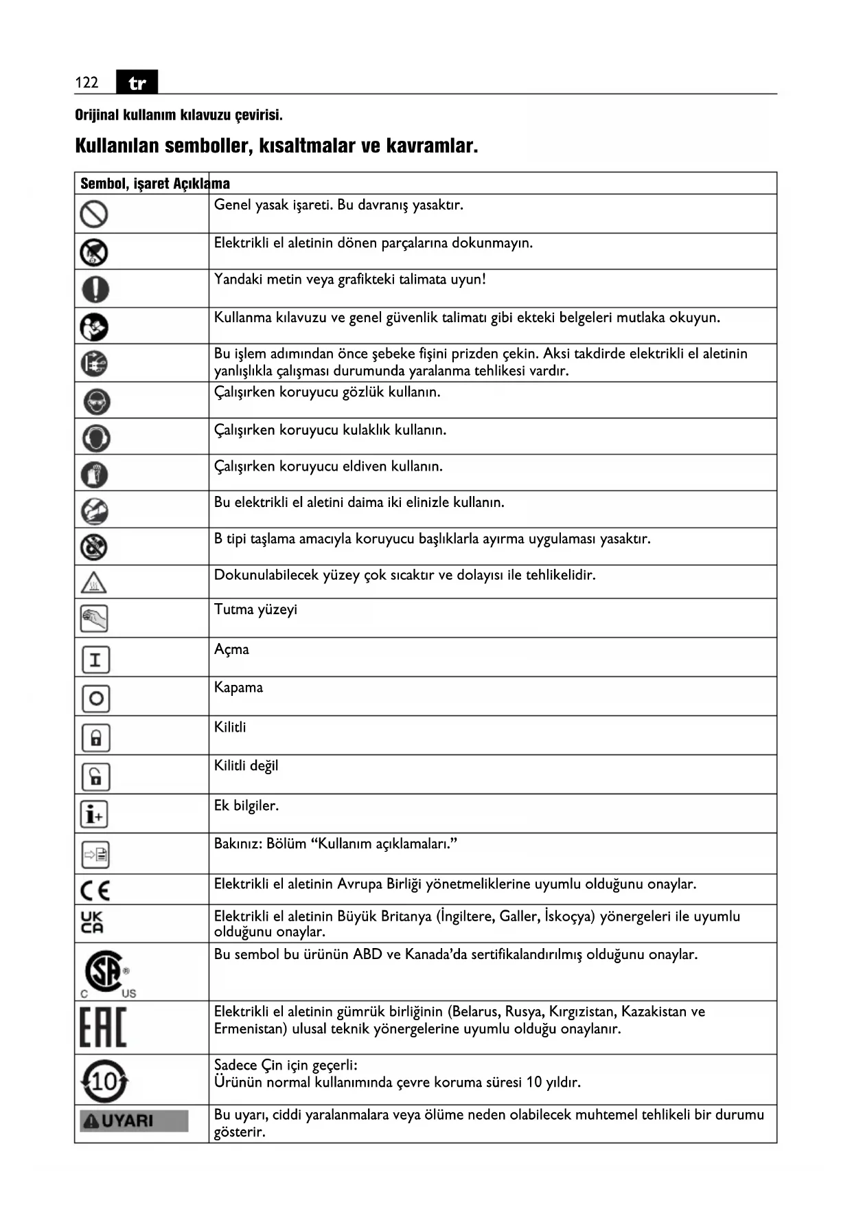 Orijinal kullanım kılavuzu çevirisi. Kullanılan semboller, kısaltmalar ve kavramlar. Sembol, işaret Açıklama Genel yasak işareti. Bu davranış yasaktır. Elektrikli el aletinin dönen parçalarına dokunmayın. Yandaki metin veya grafikteki talimata uyun! Kullanma kılavuzu ve genel güvenlik talimatı gibi ekteki belgeleri mutlaka okuyun. Bu işlem adımından önce şebeke fişini prizden çekin. Aksi takdirde elektrikli el aletinin yanlışlıkla çalışması durumunda yaralanma tehlikesi vardır. Çalışırken koruyucu gözlük kullanın. Çalışırken koruyucu kulaklık kullanın. Çalışırken koruyucu eldiven kullanın. Bu elektrikli el aletini daima iki elinizle kullanın. B tipi taşlama amacıyla koruyucu başlıklarla ayırma uygulaması yasaktır. Dokunulabilecek yüzey çok sıcaktır ve dolayısı ile tehlikelidir. Tutma yüzeyi Açma Kapama Kilitli Kilitli değil Ek bilgiler. Bakınız: Bölüm “Kullanım açıklamaları.” Elektrikli el aletinin Avrupa Birliği yönetmeliklerine uyumlu olduğunu onaylar. Elektrikli el aletinin Büyük Britanya (İngiltere, Galler, İskoçya) yönergeleri ile uyumlu olduğunu onaylar. Bu sembol bu ürünün ABD ve Kanada’da sertifikalandırılmış olduğunu onaylar. Elektrikli el aletinin gümrük birliğinin (Belarus, Rusya, Kırgızistan, Kazakistan ve Ermenistan) ulusal teknik yönergelerine uyumlu olduğu onaylanır. Sadece Çin için geçerli: Ürünün normal kullanımında çevre koruma süresi 10 yıldır. Bu uyarı, ciddi yaralanmalara veya ölüme neden olabilecek muhtemel tehlikeli bir durumu gösterir.123
