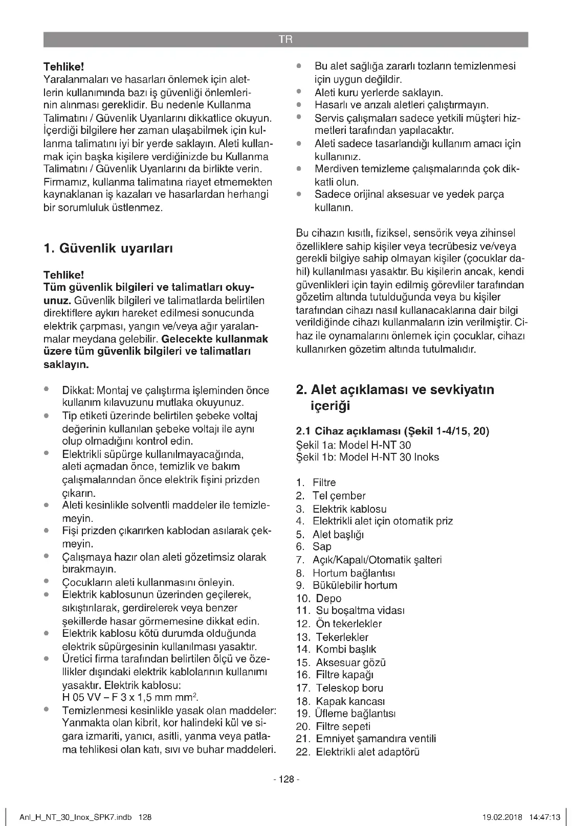 Kombi başlık (Şekil 3) Kombi başlık (14), orta ve büyük yüzeylerdeki katı ve sıvı maddelerin emilerek temizlenmesi için uygundur. Ya r ık başlığı (Şekil 3) Ya r ık başlığı (23) köşe, kenar ve zor erişilebilir yerlerdeki katı madde ve sıvıların temizlenmesi için uygundur. Anl_H_NT_30_Inox_SPK7.indb 130Anl_H_NT_30_Inox_SPK7.indb 130 19.02.2018 14:47:1319.02.2018 14:47:13TR