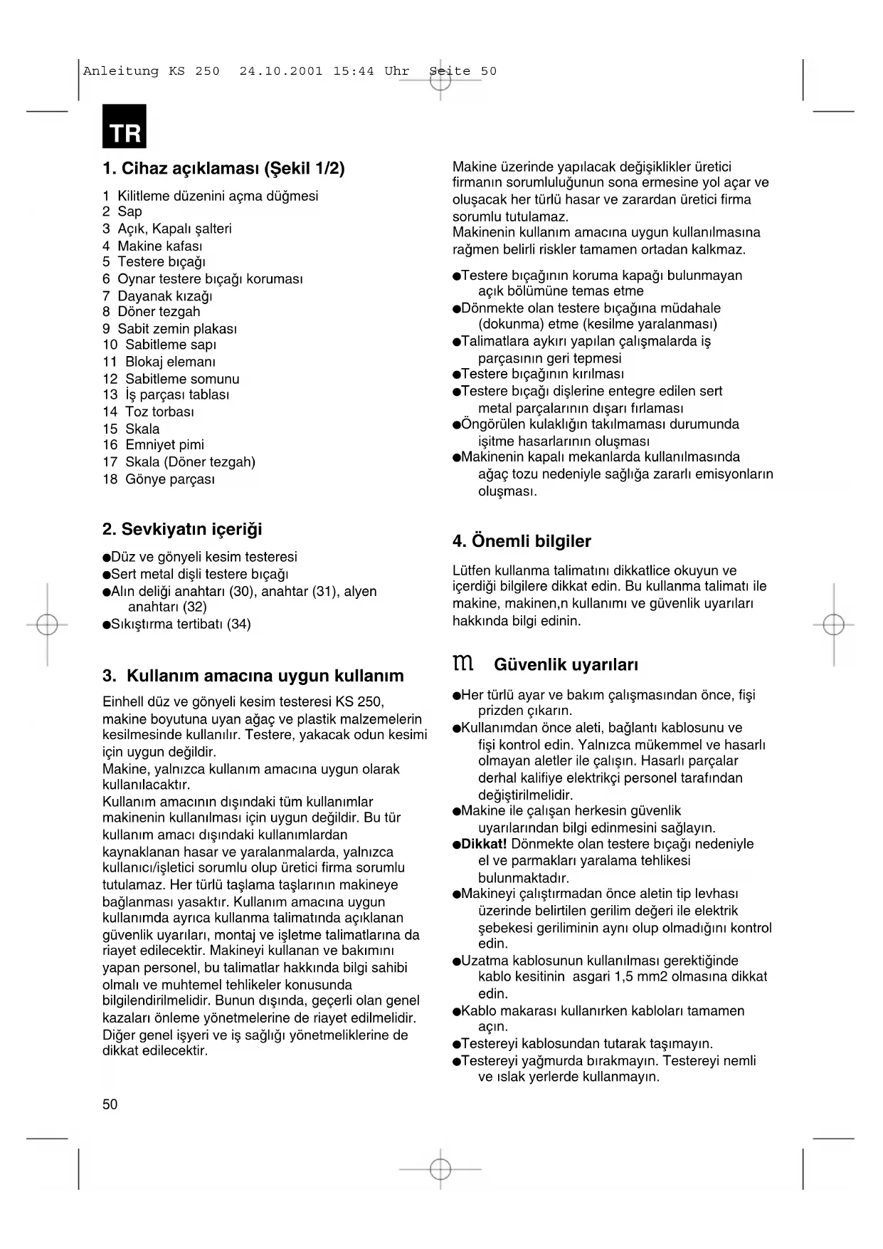 Anleitung KS 250 24.10.2001 15:44 Uhr Seite 50 ∑yi bir havaland∂rmay∂ sa©lay∂n. Yan∂c∂ s∂v∂ veya gazlar∂n yak∂n∂nda kesim yapmay∂n. Uygun iµ elbisesi giyin! Bol elbise veya tak∂lar testere b∂ça©∂na tak∂labilir. Makineyi kullanan kiµi en az 18 yaµ∂nda olmal∂d∂r, meslek e©itimi görenler en az 16 yaµ∂nda ve yaln∂zca gözetim alt∂nda çal∂µmal∂d∂r. Çocuklar∂ fiµi prize tak∂lm∂µ olan makineden uzak tutun. Elektrik kablosunu kontrol edin. Hatal∂ veya hasarl∂ elektrik kablolar∂n∂ kullanmay∂n. Çal∂µma alan∂ndaki a©aç art∂klar∂ ve di©er parçalar∂ temizleyin. Makine ile çal∂µan kiµinin dikkatini baµka yere çekmeyin. Motor ve testere b∂ça©∂ dönme yönüne dikkat edin. Makine durdurulduktan sonra testere b∂ça©∂ kesinlikle yana bast∂r∂larak frenlenmemelidir. Yaln∂zca iyi bilenmiµ, çatla©∂ bulunmayan ve deforme olmam∂µ testere b∂çaklar∂n∂ tak∂n. Makineye yaln∂zca prEN 847-1,:1996 normuna uyan tak∂mlar tak∂lacakt∂r. Hatal∂ testere b∂çaklar∂ derhal de©iµtirilecektir. Bu kullanma talimat∂nda belirtilen teknik özelliklere sahip olmayan testere b∂çaklar∂n∂ kullanmay∂n. Testere b∂ça©∂ üzerindeki ok iµareti ile makine üzerindeki ok iµareti ayn∂ yönde olmal∂d∂r. Makinenin fiµini prizden ç∂kar∂n, 45∞ ve 90∞ pozisyonlar∂nda testere b∂ça©∂n∂ elden döndürerek b∂ça©∂n hiçbir yere temas etmemesini kontrol edin. Testere b∂ça©∂n∂ koruyan tüm donan∂mlar∂n mükemmel durumda oldu©unu kontrol edin. Oynar koruma kapa©∂ aç∂k durumdayken s∂k∂µmamal∂d∂r. Makine üzerindeki emniyet donan∂mlar∂ sökülmemeli veya kullan∂lamaz duruma getirilmemelidir. Hasarl∂ veya hatal∂ emniyet donan∂mlar∂ derhal de©iµtirilecektir. Güvenli bir µekilde elde tutulamayacak kadar küçük olan malzemeleri kesmeyin. ∑µ parças∂n∂ yanl∂µ tutma pozisyonunda tutmay∂n, aksi takdirde elin aniden kaymas∂ durumunda her iki elinizle testere b∂ça©∂na girersiniz. Uzun iµ parçalar∂n∂n kesilmesinde makinenin devrilmesini önlemek için ilave bir tabla (masa, sehpa, vs.) kullan∂n. Dübel gibi yuvarlak malzemeler daima uygun bir donan∂m ile s∂k∂larak kesilecektir. Kesilecek iµ parças∂nda çivi veha di©er yabanc∂ madde bulunmamal∂d∂r. Kesim yaparken daima testere b∂ça©∂n∂n yan∂nda durun. Makineye duruncaya kadar yüklenmeyin. ∑µ parças∂n∂n kaymas∂n∂ veya dönmesini önlemek için iµ parças∂n∂ daima kuvvetlice çal∂µma plakas∂na ve dayanak k∂za©∂na bast∂r∂n. Kesilen parçalar∂n testere b∂ça©∂n∂n yan∂ndan al∂nabilmesini sa©lay∂n. Aksi takdirde bu parçalar testere b∂ça©∂na kap∂larak d∂µar∂ f∂rlat∂labilir Kesinlikle birden fazla iµ parças∂n∂ bir defada kesmeyin. Testere b∂ça©∂ dönerken kesinlikle k∂ym∂k, talaµ veya s∂k∂µm∂µ a©aç parçalar∂n∂ ç∂karmaya çal∂µmay∂n. Ar∂zalar∂ tamir etmek veya s∂k∂µm∂µ a©aç parçalar∂n∂ ç∂karmak için daima makineyi kapat∂n, fiµi prizden ç∂kar∂n. Ayar, ölçüm ve temizleme çal∂µmalar∂ yaln∂zca motor durdu©unda yap∂lacakt∂r. Fiµi prizden ç∂kar∂n. Makineyi çal∂µt∂rmadan önce anahtar ve ayar tak∂mlar∂n∂n ç∂kar∂l∂p ç∂kar∂lmad∂©∂n∂ kontrol edin. ∑µ yerini terk etmeden önce motoru kapat∂n ve fiµi prizden ç∂kar∂n. Elektrik tesisatlar∂, tamir ve bak∂m çal∂µmalar∂ yaln∂zca kalifiye personel taraf∂ndan yap∂lacakt∂r. Tamir ve bak∂m çal∂µmalar∂ tamamland∂ktan sonra tüm koruma ve güvenlik donan∂mlar∂ tekrar yerlerine monte edilecektir. Üretici firman∂n güvenlik, iµ ve bak∂m uyar∂lar∂na riayet edilecek ve teknik özellikler bölümünde belirtilen boyutlara uyulacakt∂r. Geçerli kazalar∂ önleme yönetmelikleri ve di©er genel iµ güvenli©i yönetmeliklerine riayet edilecektir. Meslek odalar∂n∂n ilgili broµürlerine dikkat edin (VBG 7j). Her çal∂µmaya baµlad∂©∂n∂zda toz emme donan∂m∂n∂ ba©lay∂n. Makinenin kapal∂ mekanlarda çal∂µt∂r∂lmas∂ yaln∂zca uygun bir aspiratör donan∂m∂ ile yap∂lacakt∂r. Testere, elektrik gerilimi 230 V olan korumal∂ ve en az 10 A ile sigortalanm∂µ prize tak∂lacakt∂r. Düµük güçlü makineleri a©∂r iµlerde kullanmay∂n. Kabloyu kullan∂m amac∂ d∂µ∂nda kullanmay∂n. Ayakta sa©lam ve dengeli durun. Aletin muhtemel hasarlar∂ olup olmad∂©∂n∂ kontrol edin! Aleti kullanmaya devam etmeden önce koruma donan∂mlar∂ ve hafif hasarl∂ parçalar∂n fonksiyonlar∂ yerine getirip getirmediklerini kontrol edin.