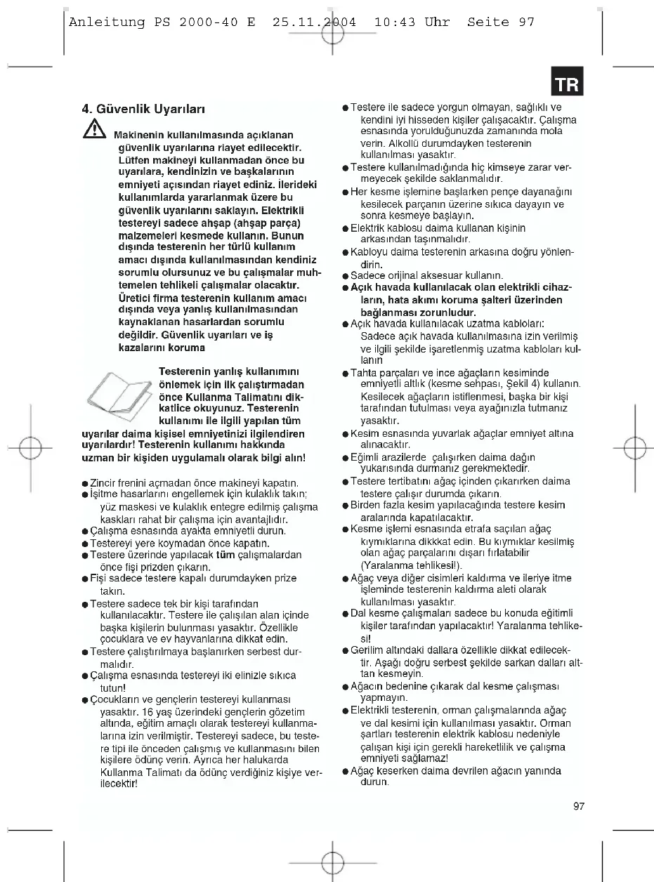 Anleitung PS 2000-40 E 25.11.2004 10:43 Uhr Seite 964. Güvenlik Uyar∂lar∂ Makinenin kullan∂lmas∂nda aç∂klanan güvenlik uyar∂lar∂na riayet edilecektir. Lütfen makineyi kullanmadan önce bu uyar∂lara, kendinizin ve baµkalar∂n∂n emniyeti aç∂s∂ndan riayet ediniz. ∑lerideki kullan∂mlarda yararlanmak üzere bu güvenlik uyar∂lar∂n∂ saklay∂n. Elektrikli testereyi sadece ahµap (ahµap parça) malzemeleri kesmede kullan∂n. Bunun d∂µ∂nda testerenin her türlü kullan∂m amac∂ d∂µ∂nda kullan∂lmas∂ndan kendiniz sorumlu olursunuz ve bu çal∂µmalar muh- temelen tehlikeli çal∂µmalar olacakt∂r. Üretici firma testerenin kullan∂m amac∂ d∂µ∂nda veya yanl∂µ kullan∂lmas∂ndan kaynaklanan hasarlardan sorumlu de©ildir. Güvenlik uyar∂lar∂ ve iµ kazalar∂n∂ koruma Testerenin yanl∂µ kullan∂m∂n∂ önlemek için ilk çal∂µt∂rmadan önce Kullanma Talimat∂n∂ dik- katlice okuyunuz. Testerenin kullan∂m∂ ile ilgili yap∂lan tüm uyar∂lar daima kiµisel emniyetinizi ilgilendiren uyar∂lard∂r! Testerenin kullan∂m∂ hakk∂nda uzman bir kiµiden uygulamal∂ olarak bilgi al∂n! Zincir frenini açmadan önce makineyi kapat∂n. ∑µitme hasarlar∂n∂ engellemek için kulakl∂k tak∂n; yüz maskesi ve kulakl∂k entegre edilmiµ çal∂µma kasklar∂ rahat bir çal∂µma için avantajl∂d∂r. Çal∂µma esnas∂nda ayakta emniyetli durun. Testereyi yere koymadan önce kapat∂n. Testere üzerinde yap∂lacak tüm çal∂µmalardan önce fiµi prizden ç∂kar∂n. Fiµi sadece testere kapal∂ durumdayken prize tak∂n. Testere sadece tek bir kiµi taraf∂ndan kullan∂lacakt∂r. Testere ile çal∂µ∂lan alan içinde baµka kiµilerin bulunmas∂ yasakt∂r. Özellikle çocuklara ve ev hayvanlar∂na dikkat edin. Testere çal∂µt∂r∂lmaya baµlan∂rken serbest dur- mal∂d∂r. Çal∂µma esnas∂nda testereyi iki elinizle s∂k∂ca tutun! Çocuklar∂n ve gençlerin testereyi kullanmas∂ yasakt∂r. 16 yaµ üzerindeki gençlerin gözetim alt∂nda, e©itim amaçl∂ olarak testereyi kullanma- lar∂na izin verilmiµtir. Testereyi sadece, bu teste- re tipi ile önceden çal∂µm∂µ ve kullanmas∂n∂ bilen kiµilere ödünç verin. Ayr∂ca her halukarda Kullanma Talimat∂ da ödünç verdi©iniz kiµiye ver- ilecektir! Testere ile sadece yorgun olmayan, sa©l∂kl∂ ve kendini iyi hisseden kiµiler çal∂µacakt∂r. Çal∂µma esnas∂nda yoruldu©unuzda zaman∂nda mola verin. Alkollü durumdayken testerenin kullan∂lmas∂ yasakt∂r. Testere kullan∂lmad∂©∂nda hiç kimseye zarar ver- meyecek µekilde saklanmal∂d∂r. Her kesme iµlemine baµlarken pençe dayana©∂n∂ kesilecek parçan∂n üzerine s∂k∂ca dayay∂n ve sonra kesmeye baµlay∂n. Elektrik kablosu daima kullanan kiµinin arkas∂ndan taµ∂nmal∂d∂r. Kabloyu daima testerenin arkas∂na do©ru yönlen- dirin. Sadece orijinal aksesuar kullan∂n. Aç∂k havada kullan∂lacak olan elektrikli cihaz- lar∂n, hata ak∂m∂ koruma µalteri üzerinden ba©lanmas∂ zorunludur. Aç∂k havada kullan∂lacak uzatma kablolar∂: Sadece aç∂k havada kullan∂lmas∂na izin verilmiµ ve ilgili µekilde iµaretlenmiµ uzatma kablolar∂ kul- lan∂n Tahta parçalar∂ ve ince a©açlar∂n kesiminde emniyetli altl∂k (kesme sehpas∂, Ωekil 4) kullan∂n. Kesilecek a©açlar∂n istiflenmesi, baµka bir kiµi taraf∂ndan tutulmas∂ veya aya©∂n∂zla tutman∂z yasakt∂r. Kesim esnas∂nda yuvarlak a©açlar emniyet alt∂na al∂nacakt∂r. E©imli arazilerde çal∂µ∂rken daima da©∂n yukar∂s∂nda durman∂z gerekmektedir. Testere tertibat∂n∂ a©aç içinden ç∂kar∂rken daima testere çal∂µ∂r durumda ç∂kar∂n. Birden fazla kesim yap∂laca©∂nda testere kesim aralar∂nda kapat∂lacakt∂r. Kesme iµlemi esnas∂nda etrafa saç∂lan a©aç k∂ym∂klar∂na dikkkat edin. Bu k∂ym∂klar kesilmiµ olan a©aç parçalar∂n∂ d∂µar∂ f∂rlatabilir (Yaralanma tehlikesi!). A©aç veya di©er cisimleri kald∂rma ve ileriye itme iµleminde testerenin kald∂rma aleti olarak kullan∂lmas∂ yasakt∂r. Dal kesme çal∂µmalar∂ sadece bu konuda e©itimli kiµiler taraf∂ndan yap∂lacakt∂r! Yaralanma tehlike- si! Gerilim alt∂ndaki dallara özellikle dikkat edilecek- tir. Aµa©∂ do©ru serbest µekilde sarkan dallar∂ alt- tan kesmeyin. A©ac∂n bedenine ç∂karak dal kesme çal∂µmas∂ yapmay∂n. Elektrikli testerenin, orman çal∂µmalar∂nda a©aç ve dal kesimi için kullan∂lmas∂ yasakt∂r. Orman µartlar∂ testerenin elektrik kablosu nedeniyle çal∂µan kiµi için gerekli hareketlilik ve çal∂µma emniyeti sa©lamaz! A©aç keserken daima devrilen a©ac∂n yan∂nda durun.