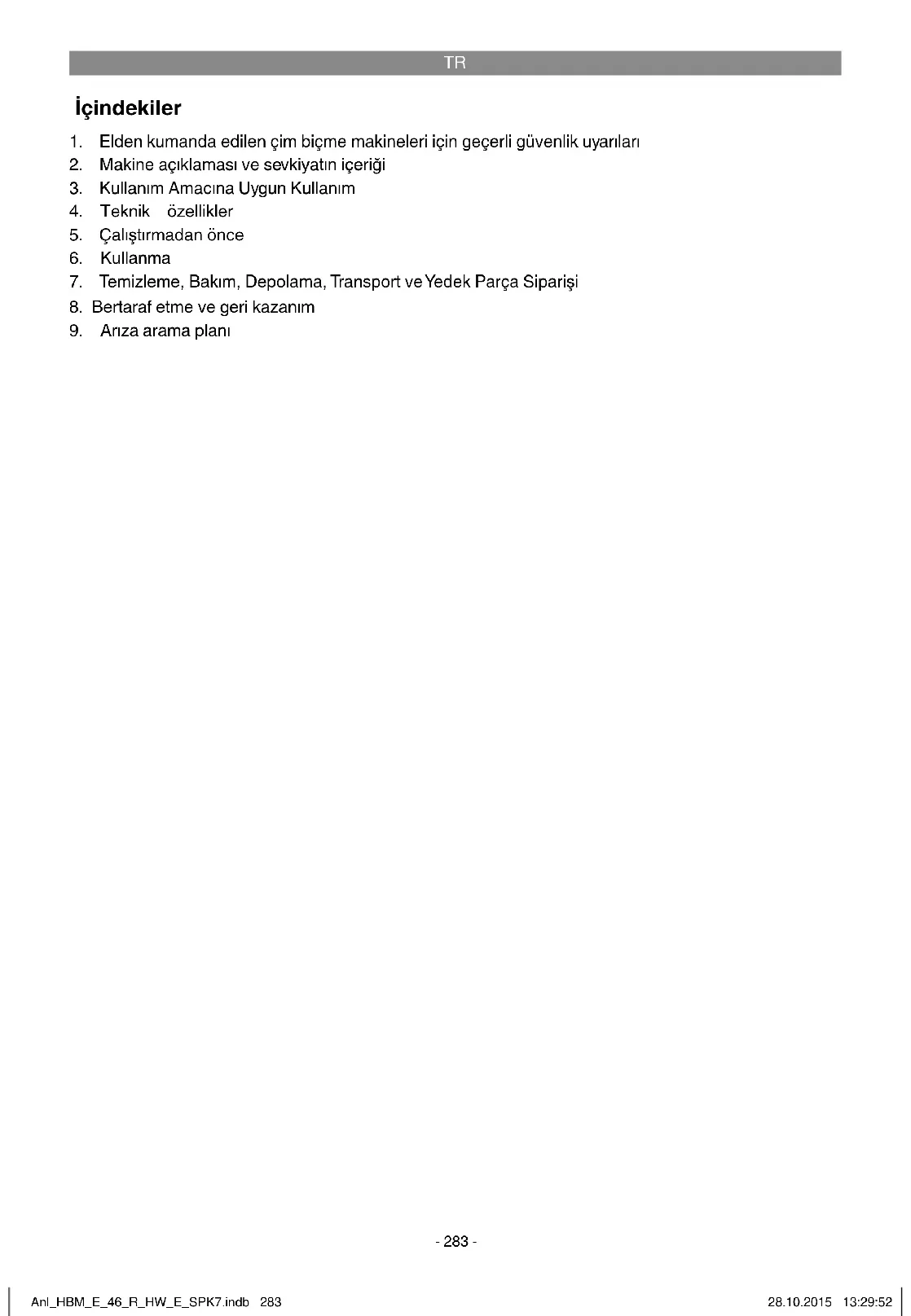 Transport ve Yedek Parça Siparişi Dikkat: Motor çalışırken ve ateşleme sisteminin akım geçiren bölümleri üzerinde kesinlikle çalışma yapmayın veya bu bölümlere temas etmey- in. Bütün bakım ve temizleme çalışmalarına başlamadan önce buji kablosu fi şini bujiden sö- kün. Makine çalışırken alet üzerinde hiçbir çalışma yapmayın. Bu Kullanma Talimatında açıklanmayan çalışmalar sadece yetkili servisler tarafından yeri- ne getirilecektir. Anl_HBM_E_46_R_HW_E_SPK7.indb 293Anl_HBM_E_46_R_HW_E_SPK7.indb 293 28.10.2015 13:29:5328.10.2015 13:29:53TR