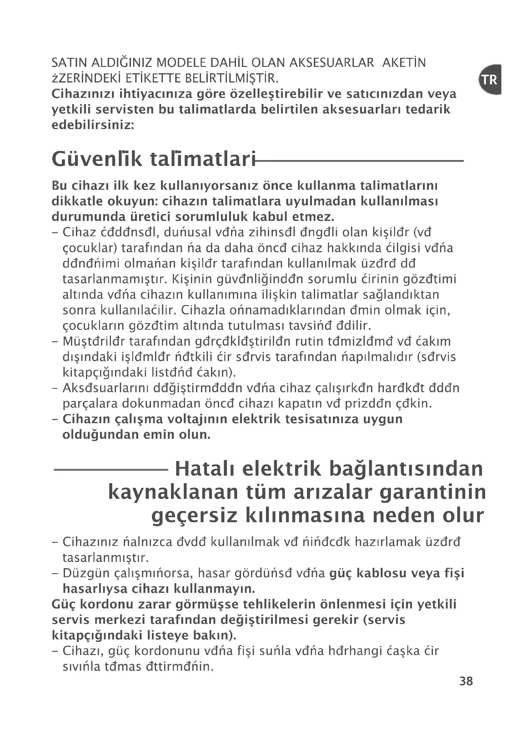 SATIN ALDIĞINIZ MODELE DAHİL OLAN AKSESUARLAR PAKETİN ÜZERİNDEKİ ETİKETTE BELİRTİLMİŞTİR. )(!9K.K9K)(3)8!#K.K9!'C1%C9%,,%S3)1%"),)15%2!3K#K.K9$!.5%8! 8%3+),)2%15)23%."43!,)-!3,!1$!"%,)13),%.!+2%24!1,!1K3%$!1)+ %$%"),)12).)9 F5%.,)o+3!,)o-!3,!1) 4#)(!9K),++%9+4,,!.K8/12!.K9C.#%+4,,!.-!3!,)-!3,!1K.K $)++!3,%/+484.#)(!9K.3!,)-!3,!1!484,-!$!.+4,,!.K,-!2K $414-4.$!F1%3)#)2/14-,4,4++!"4,%3-%9 - Cihaz bedensel, duyusal veya zihinsel engeli olan kişiler (ve çocuklar) tarafından ya da daha önce cihaz hakkında bilgisi veya deneyimi olmayan kişiler tarafından kullanılmak üzere de tasarlanmamıştır. Kişinin güvenliğinden sorumlu birinin gözetimi altında veya cihazın kullanımına ilişkin talimatlar sağlandıktan sonra kullanılabilir. Cihazla oynamadıklarından emin olmak için, çocukların gözetim altında tutulması tavsiye edilir. - Müşteriler tarafından gerçekleştirilen rutin temizleme ve bakım dışındaki işlemler yetkili bir servis tarafından yapılmalıdır (servis kitapçığındaki listeye bakın). - Aksesuarlarını değiştirmeden veya cihaz çalışırken hareket eden parçalara dokunmadan önce cihazı kapatın ve prizden çekin. - )(!9K.=!,KS-!5/,3!*K.K.%,%+31)+3%2)2!3K.K9!48'4. /,$4Q4.$!.%-)./,4. !3!,K%,%+31)+"!Q,!.3K2K.$!. +!8.!+,!.!.3F-!1K9!,!1'!1!.3).). '%=%12)9+K,K.-!2K.!.%$%./,41 - Cihazınız yalnızca evde kullanılmak ve yiyecek hazırlamak üzere tasarlanmıştır. - Düzgün çalışmıyorsa, hasar gördüyse veya 'F=+!",/245%8!&)S) (!2!1,K82!#)(!9K+4,,!.-!8K. F=+/1$/.49!1!1'C1-FS2%3%(,)+%,%1).C.,%.-%2))=).8%3+),) 2%15)2-%1+%9)3!1!&K.$!.$%Q)S3)1),-%2)'%1%+)12%15)2 +)3!0=KQK.$!+),)23%8%"!+K. - Cihazı, güç kordonunu veya fişi suyla veya herhangi başka bir sıvıyla temas ettirmeyin.- Güç kordonu çocukların erişebileceği yerlerden, cihazın ısınan parçalarından, herhangi bir ısı kaynağından ve sivri köşelerden uzak tutulmalıdır. - Güvenliğiniz için yalnızca cihazınıza uygun aksesuarlar ve yedek parçalar kullanın. - Besleme borusundaki yiyecekleri yönlendirmek için her zaman iticileri (b1, i1) kullanın, cihaz çalışır durumdayken hiçbir şekilde parmaklarınızı, çatal, kaşık, bıçak veya başka bir nesne kullanmayın. - Cihazınızı boşken çalıştırmayın. - Blender haznesini (h3) içinde malzeme olmadan, kapağı (h2) yokken veya içinde yalnızca kuru malzemeler varken çalıştırmayın ve içine kaynama derecesinde sıvılar koymayın. - Cihazınızı düz, temiz ve kuru bir yüzeyde kullanın. - Aksesuarları mikrodalga fırında kullanmayın ve sterilize etmeyin. - Çalışırken saç, eşarp, kravat veya herhangi başka bir şeyin aksesuarların üzerine sarkmasından kaçının. - Cihaz kullanılmadığı zamanlarda, temizlenirken veya elektrikler kesildiğinde prizden çıkarılmalıdır. - Metal bıçağı (d1), blender bıçağını (h), mini doğrayıcı (j), öğütücü (k) ve sebze doğrayıcı (e) diskleri tutarken dikkatli olun: son derece keskindirler. Hazne içindekileri boşaltmadan önce metal bıçağı (d1) iç kısımdaki çubuğun (c) üzerinden almanız gerekir. - Aksesuarları kap olarak kullanmayın (dondurma, pişirme veya sterilizasyon işlemleri için). - Katı meyve sıkacağının filtresi (i3) veya tabanı (i4) hasarlıysa bunları kullanmayın. - Mikseri (f2) veya çırpıcı diski (f1) sert hamur hazırlamak için kullanmayın. Temiozleme - Cihazı fişten çekin. - Daha kolay temizlemek için kullandıktan sonra aksesuarları durulayın. - Aksesuarları temizleyin ve kurulayın: Mikserin (f2) ve motor ünitesinin (a) haricindeki aksesuarlar bulaşık makinesinde, su içinde veya musluğun altında yıkanabilir. Bunları nemli bir süngerle silin.