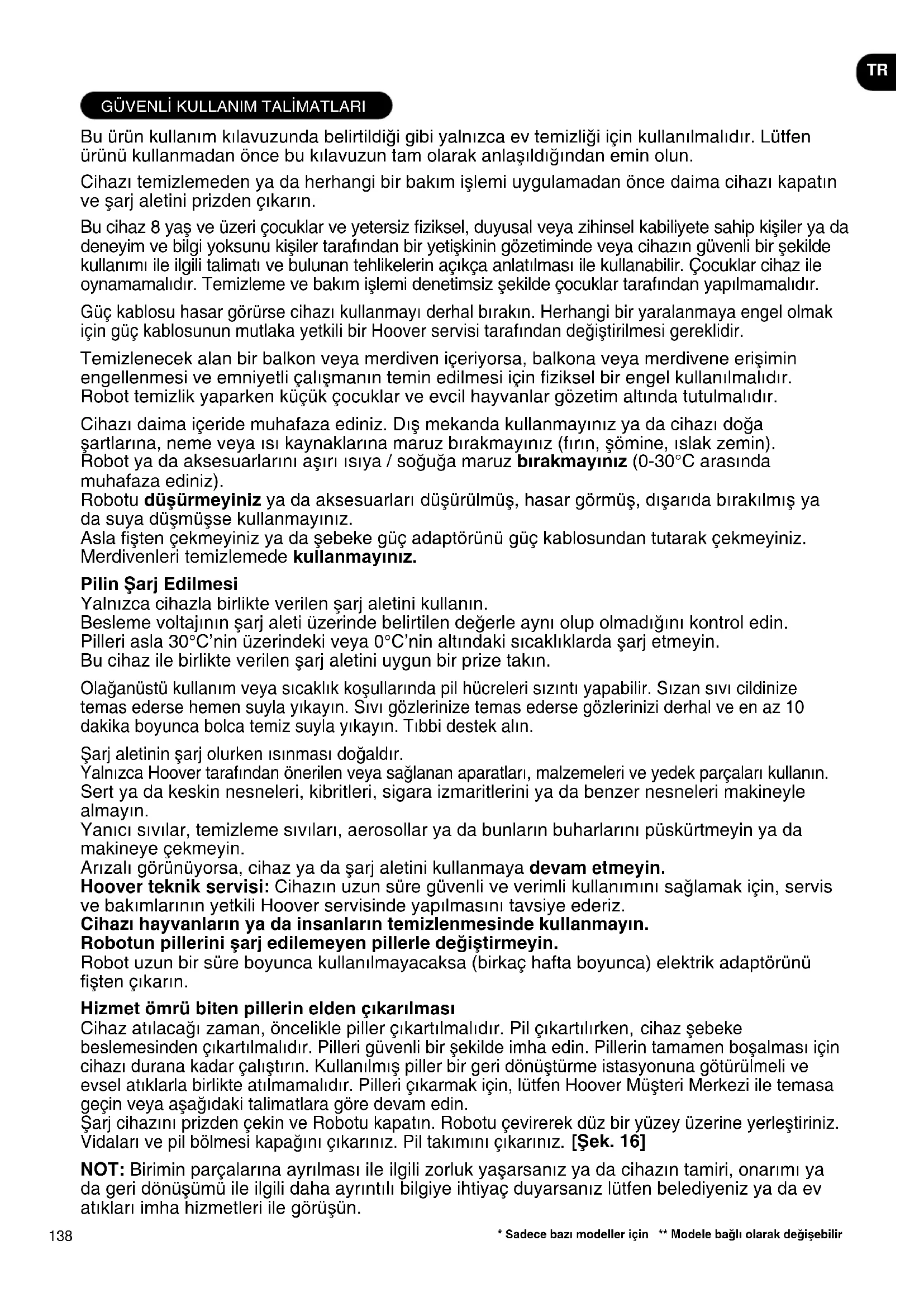 Bu ürün kullanım kılavuzunda belirtildiği gibi yalnızca ev temizliği için kullanılmalıdır. Lütfen ürünü kullanmadan önce bu kılavuzun tam olarak anlaşıldığından emin olun. Cihazı temizlemeden ya da herhangi bir bakım işlemi uygulamadan önce daima cihazı kapatın ve şarj aletini prizden çıkarın. Bu cihaz 8 yaş ve üzeri çocuklar ve yetersiz ziksel, duyusal veya zihinsel kabiliyete sahip kişiler ya da deneyim ve bilgi yoksunu kişiler tarafından bir yetişkinin gözetiminde veya cihazın güvenli bir şekilde kullanımı ile ilgili talimatı ve bulunan tehlikelerin açıkça anlatılması ile kullanabilir. Çocuklar cihaz ile oynamamalıdır. Temizleme ve bakım işlemi denetimsiz şekilde çocuklar tarafından yapılmamalıdır. Güç kablosu hasar görürse cihazı kullanmayı derhal bırakın. Herhangi bir yaralanmaya engel olmak için güç kablosunun mutlaka yetkili bir Hoover servisi tarafından değiştirilmesi gereklidir. Temizlenecek alan bir balkon veya merdiven içeriyorsa, balkona veya merdivene erişimin engellenmesi ve emniyetli çalışmanın temin edilmesi için ziksel bir engel kullanılmalıdır. Robot temizlik yaparken küçük çocuklar ve evcil hayvanlar gözetim altında tutulmalıdır. Cihazı daima içeride muhafaza ediniz. Dış mekanda kullanmayınız ya da cihazı doğa şartlarına, neme veya ısı kaynaklarına maruz bırakmayınız (fırın, şömine, ıslak zemin). Robot ya da aksesuarlarını aşırı ısıya / soğuğa maruz bırakmayınız (0-30°C arasında muhafaza ediniz). Robotu düşürmeyiniz ya da aksesuarları düşürülmüş, hasar görmüş, dışarıda bırakılmış ya da suya düşmüşse kullanmayınız. Asla şten çekmeyiniz ya da şebeke güç adaptörünü güç kablosundan tutarak çekmeyiniz. Merdivenleri temizlemede kullanmayınız. Pilin Şarj Edilmesi Yalnızca cihazla birlikte verilen şarj aletini kullanın. Besleme voltajının şarj aleti üzerinde belirtilen değerle aynı olup olmadığını kontrol edin. Pilleri asla 30°C’nin üzerindeki veya 0°C’nin altındaki sıcaklıklarda şarj etmeyin. Bu cihaz ile birlikte verilen şarj aletini uygun bir prize takın. Olağanüstü kullanım veya sıcaklık koşullarında pil hücreleri sızıntı yapabilir. Sızan sıvı cildinize temas ederse hemen suyla yıkayın. Sıvı gözlerinize temas ederse gözlerinizi derhal ve en az 10 dakika boyunca bolca temiz suyla yıkayın. Tıbbi destek alın. Şarj aletinin şarj olurken ısınması doğaldır. Yalnızca Hoover tarafından önerilen veya sağlanan aparatları, malzemeleri ve yedek parçaları kullanın. Sert ya da keskin nesneleri, kibritleri, sigara izmaritlerini ya da benzer nesneleri makineyle almayın. Yanıcı sıvılar, temizleme sıvıları, aerosollar ya da bunların buharlarını püskürtmeyin ya da makineye çekmeyin. Arızalı görünüyorsa, cihaz ya da şarj aletini kullanmaya devam etmeyin. Hoover teknik servisi: Cihazın uzun süre güvenli ve verimli kullanımını sağlamak için, servis ve bakımlarının yetkili Hoover servisinde yapılmasını tavsiye ederiz. Cihazı hayvanların ya da insanların temizlenmesinde kullanmayın. Robotun pillerini şarj edilemeyen pillerle değiştirmeyin. Robot uzun bir süre boyunca kullanılmayacaksa (birkaç hafta boyunca) elektrik adaptörünü şten çıkarın. Hizmet ömrü biten pillerin elden çıkarılması Cihaz atılacağı zaman, öncelikle piller çıkartılmalıdır. Pil çıkartılırken, cihaz şebeke beslemesinden çıkartılmalıdır. Pilleri güvenli bir şekilde imha edin. Pillerin tamamen boşalması için cihazı durana kadar çalıştırın. Kullanılmış piller bir geri dönüştürme istasyonuna götürülmeli ve evsel atıklarla birlikte atılmamalıdır. Pilleri çıkarmak için, lütfen Hoover Müşteri Merkezi ile temasa geçin veya aşağıdaki talimatlara göre devam edin. Şarj cihazını prizden çekin ve Robotu kapatın. Robotu çevirerek düz bir yüzey üzerine yerleştiriniz. Vidaları ve pil bölmesi kapağını çıkarınız. Pil takımını çıkarınız. [Şek. 16] NOT: Birimin parçalarına ayrılması ile ilgili zorluk yaşarsanız ya da cihazın tamiri, onarımı ya da geri dönüşümü ile ilgili daha ayrıntılı bilgiye ihtiyaç duyarsanız lütfen belediyeniz ya da ev atıkları imha hizmetleri ile görüşün.