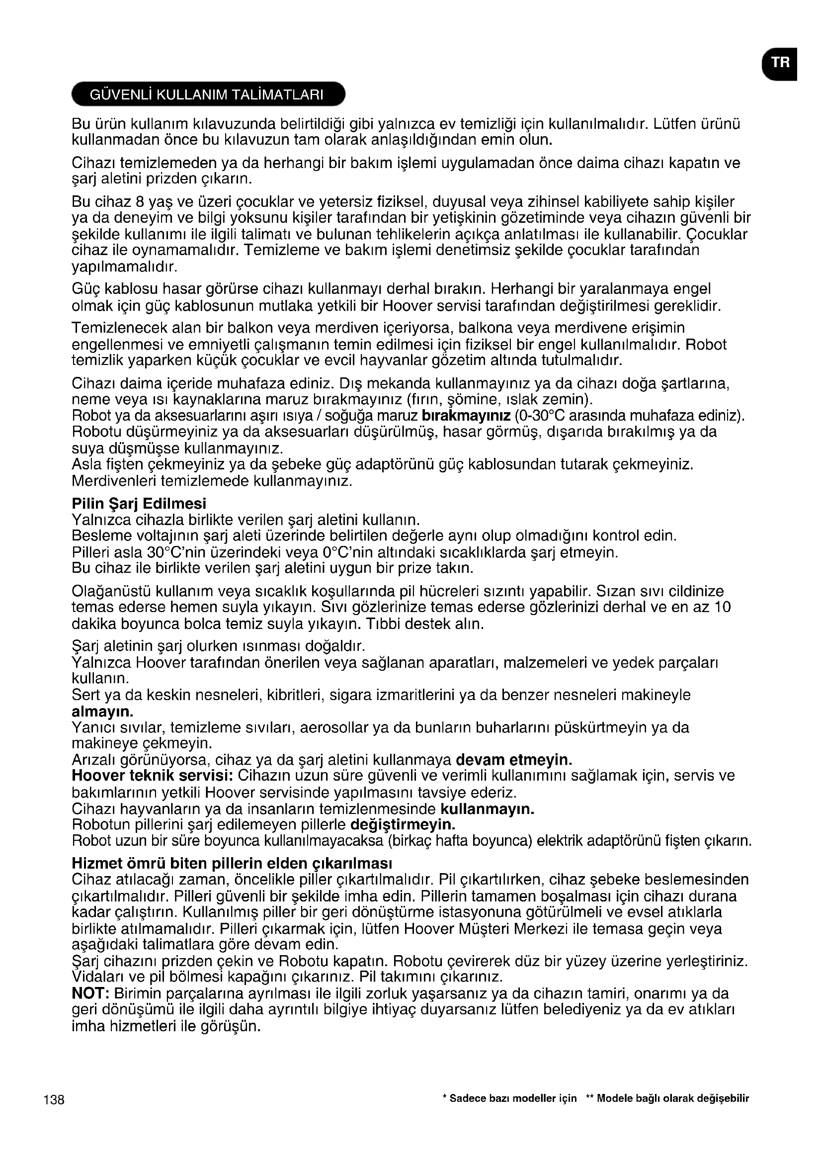 Bu ürün kullanım kılavuzunda belirtildiği gibi yalnızca ev temizliği için kullanılmalıdır. Lütfen ürünü kullanmadan önce bu kılavuzun tam olarak anlaşıldığından emin olun. Cihazı temizlemeden ya da herhangi bir bakım işlemi uygulamadan önce daima cihazı kapatın ve şarj aletini prizden çıkarın. Bu cihaz 8 yaş ve üzeri çocuklar ve yetersiz ziksel, duyusal veya zihinsel kabiliyete sahip kişiler ya da deneyim ve bilgi yoksunu kişiler tarafından bir yetişkinin gözetiminde veya cihazın güvenli bir şekilde kullanımı ile ilgili talimatı ve bulunan tehlikelerin açıkça anlatılması ile kullanabilir. Çocuklar cihaz ile oynamamalıdır. Temizleme ve bakım işlemi denetimsiz şekilde çocuklar tarafından yapılmamalıdır. Güç kablosu hasar görürse cihazı kullanmayı derhal bırakın. Herhangi bir yaralanmaya engel olmak için güç kablosunun mutlaka yetkili bir Hoover servisi tarafından değiştirilmesi gereklidir. Temizlenecek alan bir balkon veya merdiven içeriyorsa, balkona veya merdivene erişimin engellenmesi ve emniyetli çalışmanın temin edilmesi için ziksel bir engel kullanılmalıdır. Robot temizlik yaparken küçük çocuklar ve evcil hayvanlar gözetim altında tutulmalıdır. Cihazı daima içeride muhafaza ediniz. Dış mekanda kullanmayınız ya da cihazı doğa şartlarına, neme veya ısı kaynaklarına maruz bırakmayınız (fırın, şömine, ıslak zemin). Robot ya da aksesuarlarını aşırı ısıya / soğuğa maruz bırakmayınız (0-30°C arasında muhafaza ediniz). Robotu düşürmeyiniz ya da aksesuarları düşürülmüş, hasar görmüş, dışarıda bırakılmış ya da suya düşmüşse kullanmayınız. Asla şten çekmeyiniz ya da şebeke güç adaptörünü güç kablosundan tutarak çekmeyiniz. Merdivenleri temizlemede kullanmayınız. Pilin Şarj Edilmesi Yalnızca cihazla birlikte verilen şarj aletini kullanın. Besleme voltajının şarj aleti üzerinde belirtilen değerle aynı olup olmadığını kontrol edin. Pilleri asla 30°C’nin üzerindeki veya 0°C’nin altındaki sıcaklıklarda şarj etmeyin. Bu cihaz ile birlikte verilen şarj aletini uygun bir prize takın. Olağanüstü kullanım veya sıcaklık koşullarında pil hücreleri sızıntı yapabilir. Sızan sıvı cildinize temas ederse hemen suyla yıkayın. Sıvı gözlerinize temas ederse gözlerinizi derhal ve en az 10 dakika boyunca bolca temiz suyla yıkayın. Tıbbi destek alın. Şarj aletinin şarj olurken ısınması doğaldır. Yalnızca Hoover tarafından önerilen veya sağlanan aparatları, malzemeleri ve yedek parçaları kullanın. Sert ya da keskin nesneleri, kibritleri, sigara izmaritlerini ya da benzer nesneleri makineyle almayın. Yanıcı sıvılar, temizleme sıvıları, aerosollar ya da bunların buharlarını püskürtmeyin ya da makineye çekmeyin. Arızalı görünüyorsa, cihaz ya da şarj aletini kullanmaya devam etmeyin. Hoover teknik servisi: Cihazın uzun süre güvenli ve verimli kullanımını sağlamak için, servis ve bakımlarının yetkili Hoover servisinde yapılmasını tavsiye ederiz. Cihazı hayvanların ya da insanların temizlenmesinde kullanmayın. Robotun pillerini şarj edilemeyen pillerle değiştirmeyin. Robot uzun bir süre boyunca kullanılmayacaksa (birkaç hafta boyunca) elektrik adaptörünü şten çıkarın. Hizmet ömrü biten pillerin elden çıkarılması Cihaz atılacağı zaman, öncelikle piller çıkartılmalıdır. Pil çıkartılırken, cihaz şebeke beslemesinden çıkartılmalıdır. Pilleri güvenli bir şekilde imha edin. Pillerin tamamen boşalması için cihazı durana kadar çalıştırın. Kullanılmış piller bir geri dönüştürme istasyonuna götürülmeli ve evsel atıklarla birlikte atılmamalıdır. Pilleri çıkarmak için, lütfen Hoover Müşteri Merkezi ile temasa geçin veya aşağıdaki talimatlara göre devam edin. Şarj cihazını prizden çekin ve Robotu kapatın. Robotu çevirerek düz bir yüzey üzerine yerleştiriniz. Vidaları ve pil bölmesi kapağını çıkarınız. Pil takımını çıkarınız. NOT: Birimin parçalarına ayrılması ile ilgili zorluk yaşarsanız ya da cihazın tamiri, onarımı ya da geri dönüşümü ile ilgili daha ayrıntılı bilgiye ihtiyaç duyarsanız lütfen belediyeniz ya da ev atıkları imha hizmetleri ile görüşün.