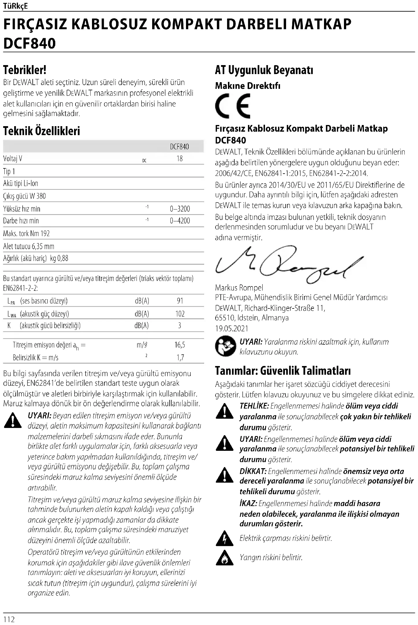 UYARI: Beyan edilen titreşim emisyon ve/veya gürültü düzeyi, aletin maksimum kapasitesini kullanarak bağlantı malzemelerini darbeli sıkmasını ifade eder. Bununla birlikte alet farklı uygulamalar için, farklı aksesuarla veya yeterince bakım yapılmadan kullanıldığında, titreşim ve/ veya gürültü emisyonu değişebilir. Bu, toplam çalışma süresindeki maruz kalma seviyesini önemli ölçüde artırabilir. Titreşim ve/veya gürültü maruz kalma seviyesine ilişkin bir tahminde bulunurken aletin kapalı kaldığı veya çalıştığı ancak gerçekte işi yapmadığı zamanlar da dikkate alınmalıdır. Bu, toplam çalışma süresindeki maruziyet düzeyini önemli ölçüde azaltabilir. Operatörü titreşim ve/veya gürültünün etkilerinden korumak için aşağıdakiler gibi ilave güvenlik önlemleri tanımlayın: aleti ve aksesuarları iyi koruyun, ellerinizi sıcak tutun (titreşim için uygundur), çalışma sürelerini iyi organize edin. AT Uygunluk Beyanatı Makıne Dırektıfı Fırçasız Kablosuz Kompakt Darbeli Matkap DCF840 DeWALT, Teknik Özellikleri bölümünde açıklanan bu ürünlerin aşağıda belirtilen yönergelere uygun olduğunu beyan eder: 2006/42/CE, EN62841-1:2015, EN62841-2-2:2014. Bu ürünler ayrıca 2014/30/EU ve 2011/65/EU Direktiflerine de uygundur. Daha ayrıntılı bilgi için, lütfen aşağıdaki adresten DeWALT ile temas kurun veya kılavuzun arka kapağınabakın. Bu belge altında imzası bulunan yetkili, teknik dosyanın derlenmesinden sorumludur ve bu beyanı DeWALT adınavermiştir. Markus Rompel PTE-Avrupa, Mühendislik Birimi Genel Müdür Yardımcısı DeWALT, Richard-Klinger-Straße 11, 65510, Idstein, Almanya