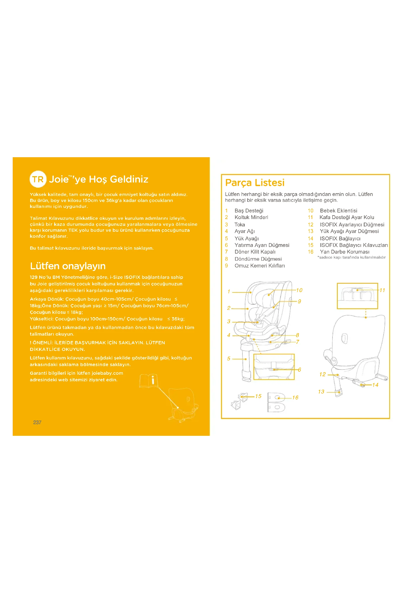 18kg;Öne Dönük: Çocuğun yaşı 15m/ Çocuğun boyu 76cm-105cm/ Çocuğun kilosu 18kg; Yükseltici: Çocuğun boyu 100cm-150cm/ Çocuğun kilosu 36kg;Lütfen ürünü takmadan ya da kullanmadan önce bu kılavuzdaki tüm talimatları okuyun.! ÖNEMLİ: İLERİDE BAŞVURMAK İÇİN SAKLAYIN. LÜTFEN DİKKATLİCE OKUYUN.Lütfen kullanım kılavuzunu﹐ sağdaki şekilde gösterildiği gibi﹐ koltuğun arkasındaki saklama bölmesinde saklayın. Garanti bilgileri için lütfen joiebaby.com adresindeki web sitemizi ziyaret edin. Parça Listesi 1 BaşDesteği2 KoltukMinderi3 Toka4 AyarAğı5 YükAyağı6 YatırmaAyarıDüğmesi7 DönerKilitKapalı8 DöndürmeDüğmesi9 OmuzKemeriKılıfları10 BebekEklentisi11 KafaDesteğiAyarKolu12 ISOFIXAyarlayıcıDüğmesi13 YükAyağıAyarDüğmesi14 ISOFIXBağlayıcı15 ISOFIXBağlayıcıKılavuzları16 YanDarbeKoruması*sadecekapıtarafındakullanılmalıdırLütfenherhangibireksikparçaolmadığındaneminolun.Lütfenherhangibireksikvarsasatıcıylailetişimegeçin.