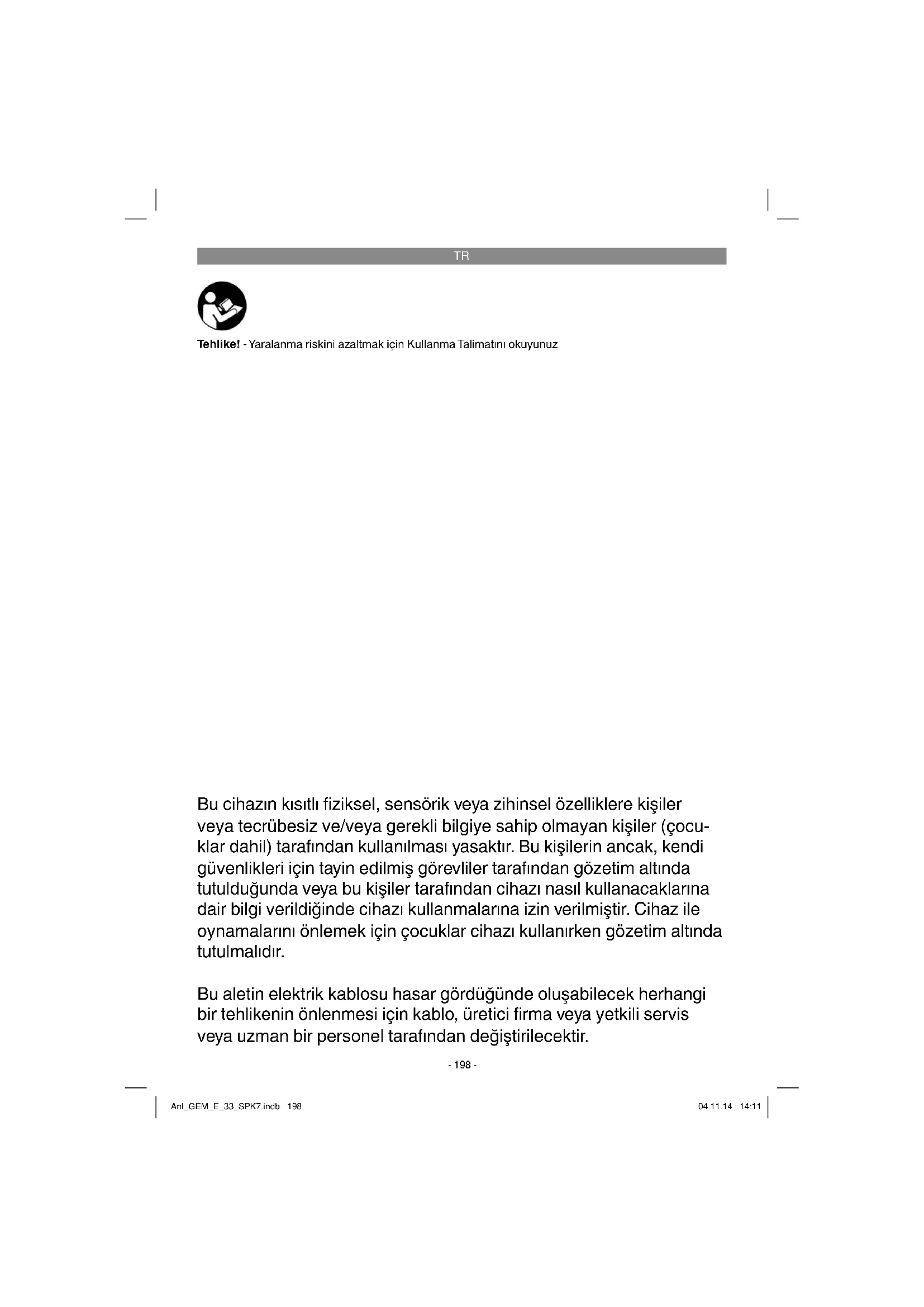 Tehlike! - Yaralanma riskini azaltmak için Kullanma Talimatını okuyunuz Bu cihazın kısıtlı fi ziksel, sensörik veya zihinsel özelliklere kişiler veya tecrübesiz ve/veya gerekli bilgiye sahip olmayan kişiler (çocu- klar dahil) tarafından kullanılması yasaktır. Bu kişilerin ancak, kendi güvenlikleri için tayin edilmiş görevliler tarafından gözetim altında tutulduğunda veya bu kişiler tarafından cihazı nasıl kullanacaklarına dair bilgi verildiğinde cihazı kullanmalarına izin verilmiştir. Cihaz ile oynamalarını önlemek için çocuklar cihazı kullanırken gözetim altında tutulmalıdır. Bu aletin elektrik kablosu hasar gördüğünde oluşabilecek herhangi bir tehlikenin önlenmesi için kablo, üretici fi rma veya yetkili servis veya uzman bir personel tarafından değiştirilecektir. Anl_GEM_E_33_SPK7.indb 198Anl_GEM_E_33_SPK7.indb 198 04.11.14 14:1104.11.14 14:11TR