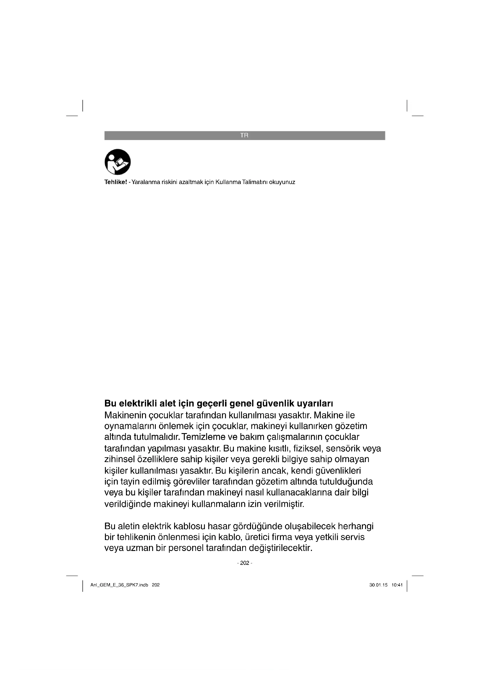 Tehlike! - Yaralanma riskini azaltmak için Kullanma Talimatını okuyunuz Bu elektrikli alet için geçerli genel güvenlik uyarıları Makinenin çocuklar tarafından kullanılması yasaktır. Makine ile oynamalarını önlemek için çocuklar, makineyi kullanırken gözetim altında tutulmalıdır. Temizleme ve bakım çalışmalarının çocuklar tarafından yapılması yasaktır. Bu makine kısıtlı, fi ziksel, sensörik veya zihinsel özelliklere sahip kişiler veya gerekli bilgiye sahip olmayan kişiler kullanılması yasaktır. Bu kişilerin ancak, kendi güvenlikleri için tayin edilmiş görevliler tarafından gözetim altında tutulduğunda veya bu kişiler tarafından makineyi nasıl kullanacaklarına dair bilgi verildiğinde makineyi kullanmaların izin verilmiştir. Bu aletin elektrik kablosu hasar gördüğünde oluşabilecek herhangi bir tehlikenin önlenmesi için kablo, üretici fi rma veya yetkili servis veya uzman bir personel taraf ından değiştirilecektir. Anl_GEM_E_36_SPK7.indb 202Anl_GEM_E_36_SPK7.indb 202 30.01.15 10:4130.01.15 10:41TR