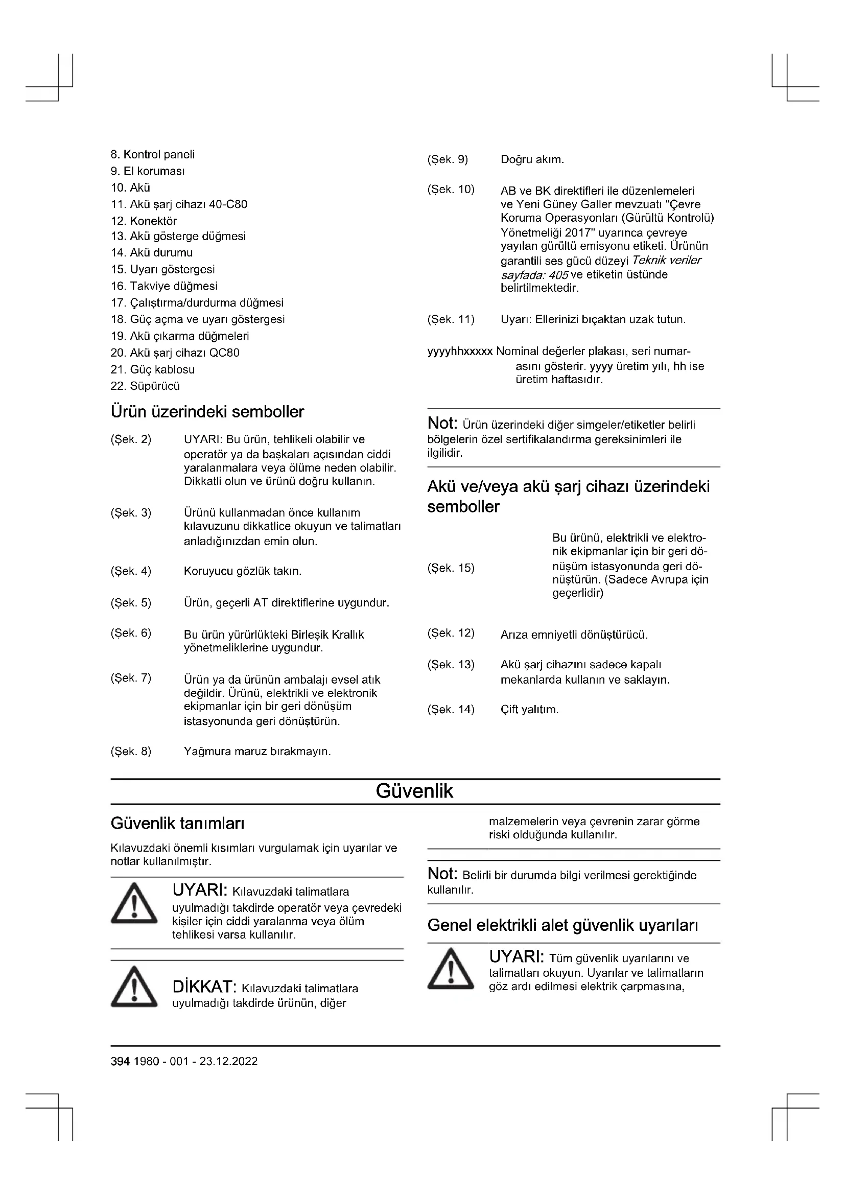 Ürün üzerindeki semboller (Şek. 2) UYARI: Bu ürün, tehlikeli olabilir ve operatör ya da başkaları açısından ciddi yaralanmalara veya ölüme neden olabilir. Dikkatli olun ve ürünü doğru kullanın. (Şek. 3) Ürünü kullanmadan önce kullanım kılavuzunu dikkatlice okuyun ve talimatları anladığınızdan emin olun. (Şek. 4) Koruyucu gözlük takın. (Şek. 5) Ürün, geçerli AT direktiflerine uygundur. (Şek. 6) Bu ürün yürürlükteki Birleşik Krallık yönetmeliklerine uygundur. (Şek. 7) Ürün ya da ürünün ambalajı evsel atık değildir. Ürünü, elektrikli ve elektronik ekipmanlar için bir geri dönüşüm istasyonunda geri dönüştürün. (Şek. 8) Yağmura maruz bırakmayın. (Şek. 9) Doğru akım. (Şek. 10) AB ve BK direktifleri ile düzenlemeleri ve Yeni Güney Galler mevzuatı "Çevre Koruma Operasyonları (Gürültü Kontrolü) Yönetmeliği 2017" uyarınca çevreye yayılan gürültü emisyonu etiketi. Ürünün garantili ses gücü düzeyi Teknik veriler sayfada: 405 ve etiketin üstünde belirtilmektedir. (Şek. 11) Uyarı: Ellerinizi bıçaktan uzak tutun. yyyyhhxxxxx Nominal değerler plakası, seri numar- asını gösterir. yyyy üretim yılı, hh ise üretim haftasıdır. Not: Ürün üzerindeki diğer simgeler/etiketler belirli bölgelerin özel sertifikalandırma gereksinimleri ile ilgilidir. Akü ve/veya akü şarj cihazı üzerindeki semboller (Şek. 15) Bu ürünü, elektrikli ve elektro- nik ekipmanlar için bir geri dö- nüşüm istasyonunda geri dö- nüştürün. (Sadece Avrupa için geçerlidir) (Şek. 12) Arıza emniyetli dönüştürücü. (Şek. 13) Akü şarj cihazını sadece kapalı mekanlarda kullanın ve saklayın. (Şek. 14) Çift yalıtım. Güvenlik Güvenlik tanımları Kılavuzdaki önemli kısımları vurgulamak için uyarılar ve notlar kullanılmıştır. UYARI: Kılavuzdaki talimatlara uyulmadığı takdirde operatör veya çevredeki kişiler için ciddi yaralanma veya ölüm tehlikesi varsa kullanılır. DİKKAT: Kılavuzdaki talimatlara uyulmadığı takdirde ürünün, diğer malzemelerin veya çevrenin zarar görme riski olduğunda kullanılır. Not: Belirli bir durumda bilgi verilmesi gerektiğinde kullanılır. Genel elektrikli alet güvenlik uyarıları UYARI: Tüm güvenlik uyarılarını ve talimatları okuyun. Uyarılar ve talimatların göz ardı edilmesi elektrik çarpmasına, 394 1980 - 001 - 23.12.2022yangına ve/veya ciddi yaralanmaya neden olabilir. Not: Tüm uyarı ve talimatları ilerde başvurmak üzere saklayın. Uyarılardaki "elektrikli alet" ifadesi, şebeke akımıyla çalışan (kablolu) elektrikli aletinizi veya aküyle çalışan (kablosuz) elektrikli aletinizi belirtmektedir. Çalışma alanı güvenliği