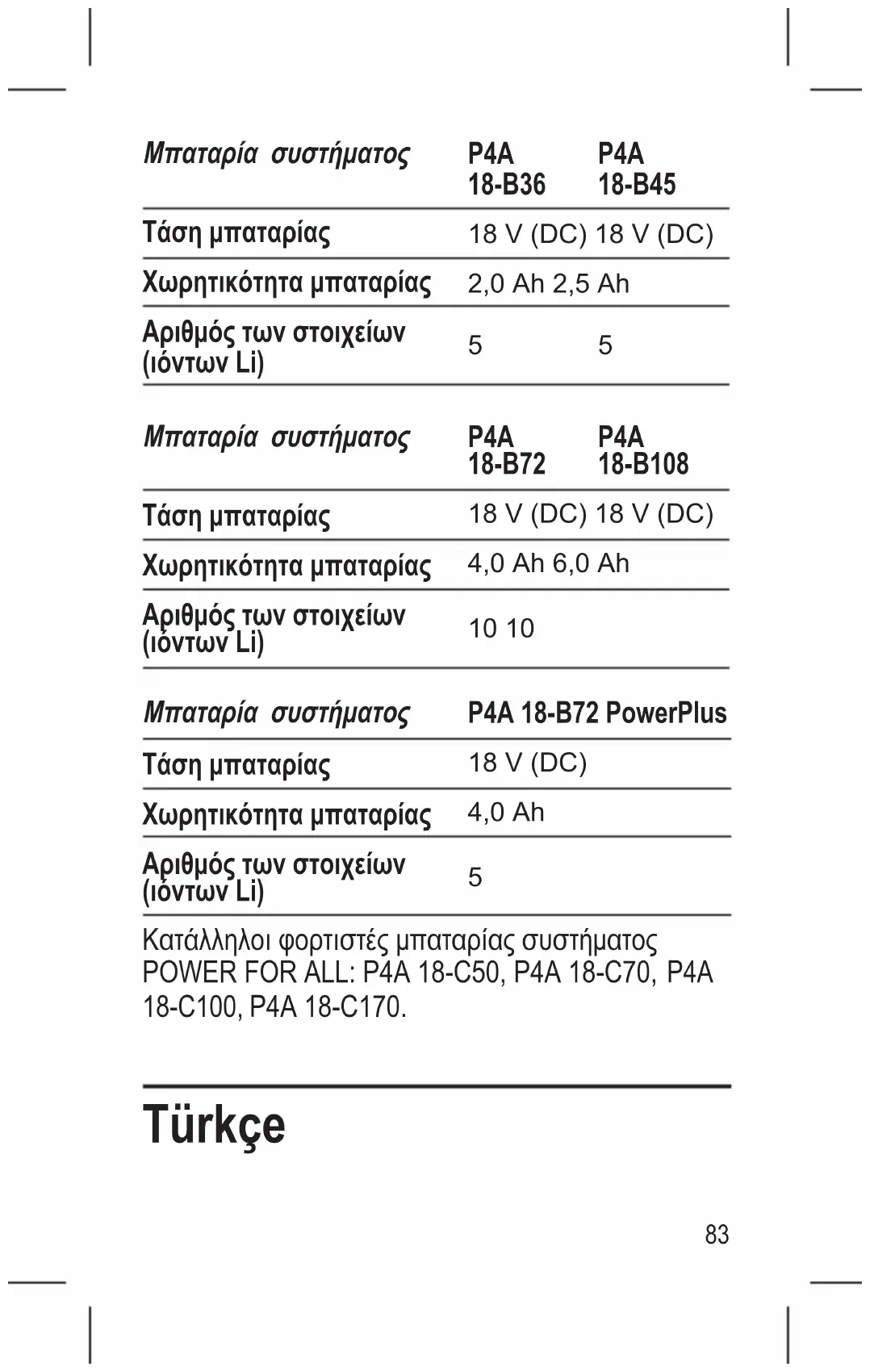 Κατάλληλοιφορτιστέςμπαταρίαςσυστήματος POWER FOR ALL: P4A 18-C50, P4A 18-C70, P4A 18-C100, P4A 18-C170. Türkçe 83Güvenliktalimatı Bütüngüvenlikuyarılarınıve talimatlarıokuyun. Güvenlik uyarılarınavetalimatlarauyulmadığı takdirdeelektrikçarpmasına,yangına ve/veya ciddi yaralanmalara neden olunabilir. Bütüngüvenlikuyarılarınıvetalimat hükümleriniileridekullanmaküzeresaklayın.