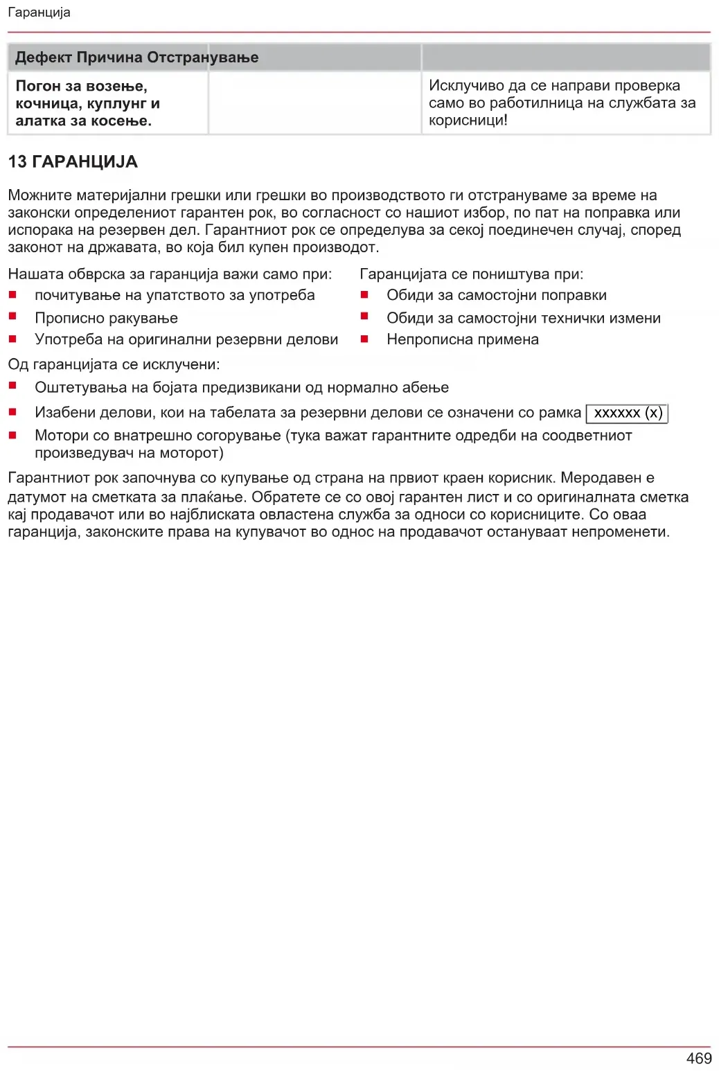 İçten yanmalı motorlar (burada ilgili motor üreticilerinin garanti hükümleri geçerlidir) Garanti süresi, ilk nihai alıcının satın alımı ile başlar. Tarih ve satın alma belgesi belirleyicidir. Bu be- yan ve orijinal satın alma belgesiyle beraber satıcınıza veya en yakın yetkili servis merkezine başvu- run. Satın alan kişinin, satıcıya karşı ayıplı maldan doğan hakları bu beyan tarafından etkilenmez.