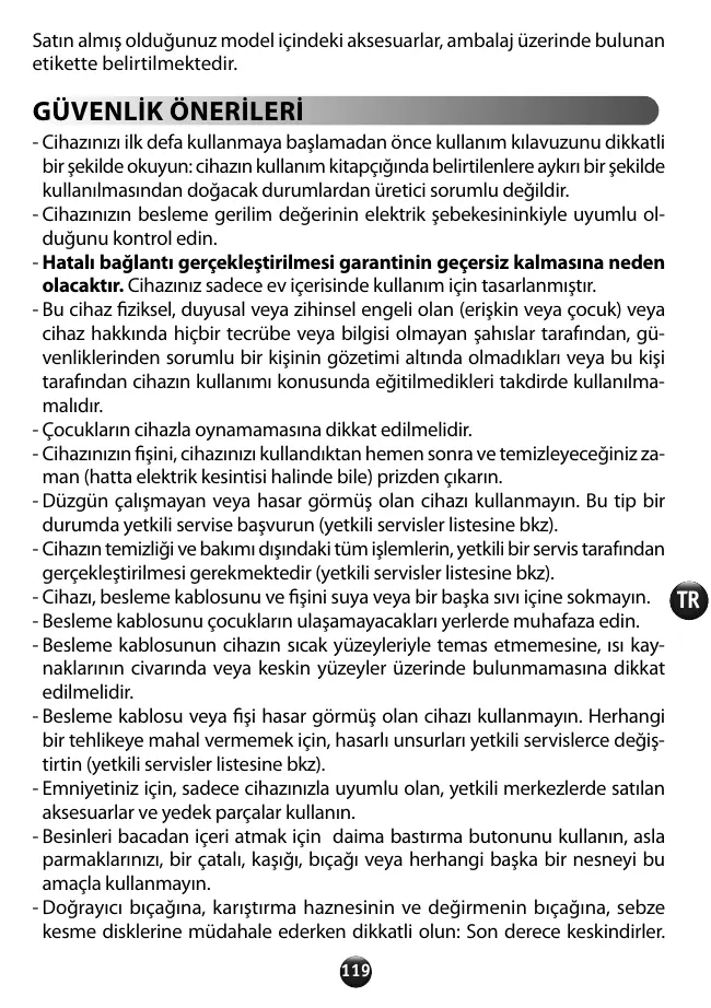 GÜVENLİK ÖNERİLERİ - Cihazınızı ilk defa kullanmaya başlamadan önce kullanım kılavuzunu dikkatli bir şekilde okuyun: cihazın kullanım kitapçığında belirtilenlere aykırı bir şekilde kullanılmasından doğacak durumlardan üretici sorumlu değildir. - Cihazınızın besleme gerilim değerinin elektrik şebekesininkiyle uyumlu olduğunu kontrol edin. - Hatalı bağlantı gerçekleştirilmesi garantinin geçersiz kalmasına neden olacaktır. Cihazınız sadece ev içerisinde kullanım için tasarlanmıştır. - Bu cihaz fiziksel, duyusal veya zihinsel engeli olan (erişkin veya çocuk) veya cihaz hakkında hiçbir tecrübe veya bilgisi olmayan şahıslar tarafından, güvenliklerinden sorumlu bir kişinin gözetimi altında olmadıkları veya bu kişi tarafından cihazın kullanımı konusunda eğitilmedikleri takdirde kullanılmamalıdır. - Çocukların cihazla oynamamasına dikkat edilmelidir. - Cihazınızın fişini, cihazınızı kullandıktan hemen sonra ve temizleyeceğiniz zaman (hatta elektrik kesintisi halinde bile) prizden çıkarın. - Düzgün çalışmayan veya hasar görmüş olan cihazı kullanmayın. Bu tip bir durumda yetkili servise başvurun (yetkili servisler listesine bkz). - Cihazın temizliği ve bakımı dışındaki tüm işlemlerin, yetkili bir servis tarafından gerçekleştirilmesi gerekmektedir (yetkili servisler listesine bkz). - Cihazı, besleme kablosunu ve fişini suya veya bir başka sıvı içine sokmayın. - Besleme kablosunu çocukların ulaşamayacakları yerlerde muhafaza edin. - Besleme kablosunun cihazın sıcak yüzeyleriyle temas etmemesine, ısı kaynaklarının civarında veya keskin yüzeyler üzerinde bulunmamasına dikkat edilmelidir. - Besleme kablosu veya fişi hasar görmüş olan cihazı kullanmayın. Herhangi bir tehlikeye mahal vermemek için, hasarlı unsurları yetkili servislerce değiştirtin (yetkili servisler listesine bkz). - Emniyetiniz için, sadece cihazınızla uyumlu olan, yetkili merkezlerde satılan aksesuarlar ve yedek parçalar kullanın. - Besinleri bacadan içeri atmak için daima bastırma butonunu kullanın, asla parmaklarınızı, bir çatalı, kaşığı, bıçağı veya herhangi başka bir nesneyi bu amaçla kullanmayın. - Doğrayıcı bıçağına, karıştırma haznesinin ve değirmenin bıçağına, sebze kesme disklerine müdahale ederken dikkatli olun: Son derece keskindirler. 119