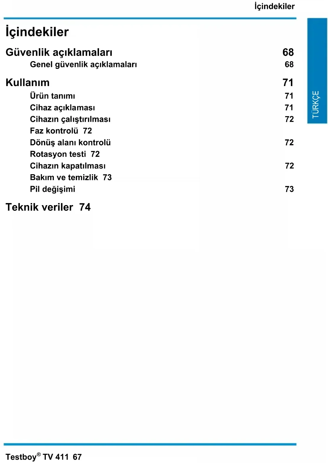 RKÇE İçindekiler Güvenlik açıklamaları 68 Genel güvenlik açıklamaları 68 Kullanım 71 Ürün tanımı 71 Cihaz açıklaması 71 Cihazın çalıştırılması 72 Faz kontrolü 72 Dönüş alanı kontrolü 72 Rotasyon testi 72 Cihazın kapatılması 72 Bakım ve temizlik 73 Pil değişimi 73 Teknik veriler 74Güvenlik açıklamaları 68 Testboy