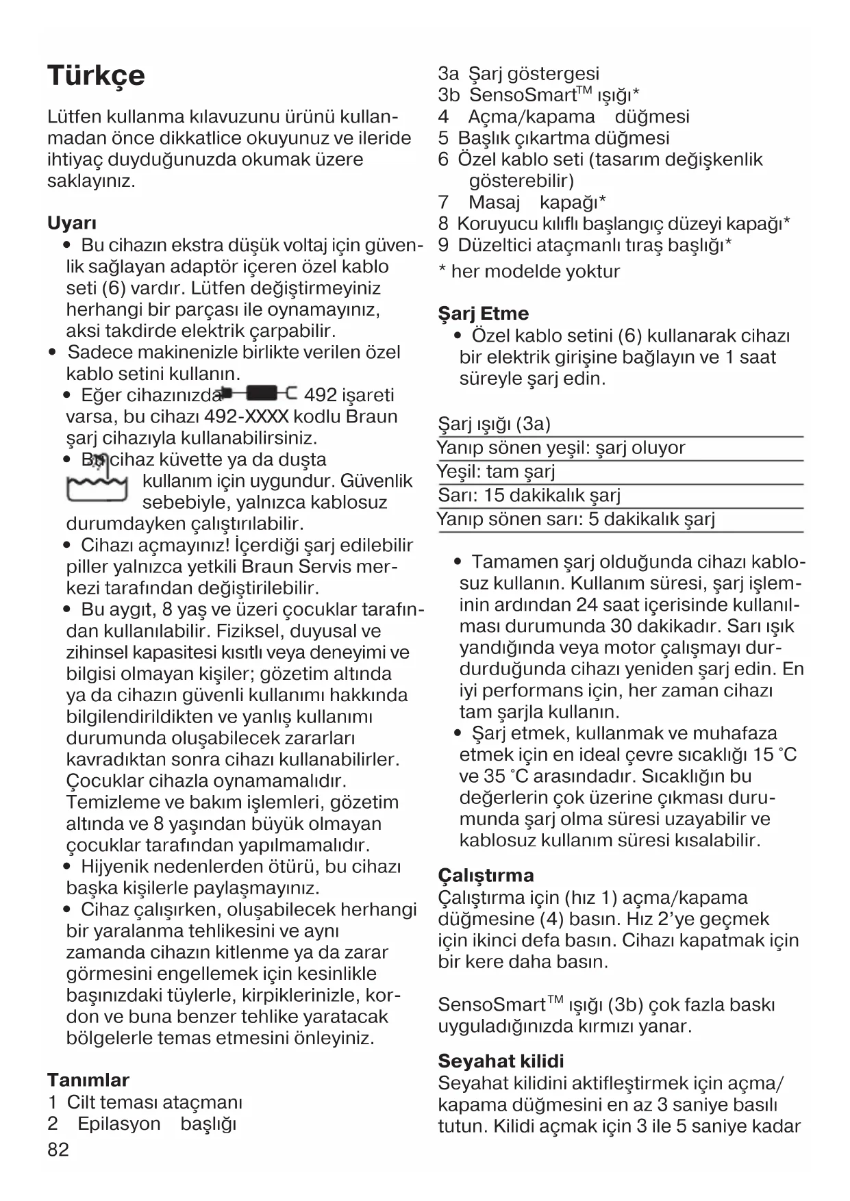 - Eğer cihazınızda 492 işareti varsa, bu cihazı 492-XXXX kodlu Braun şarj cihazıyla kullanabilirsiniz.