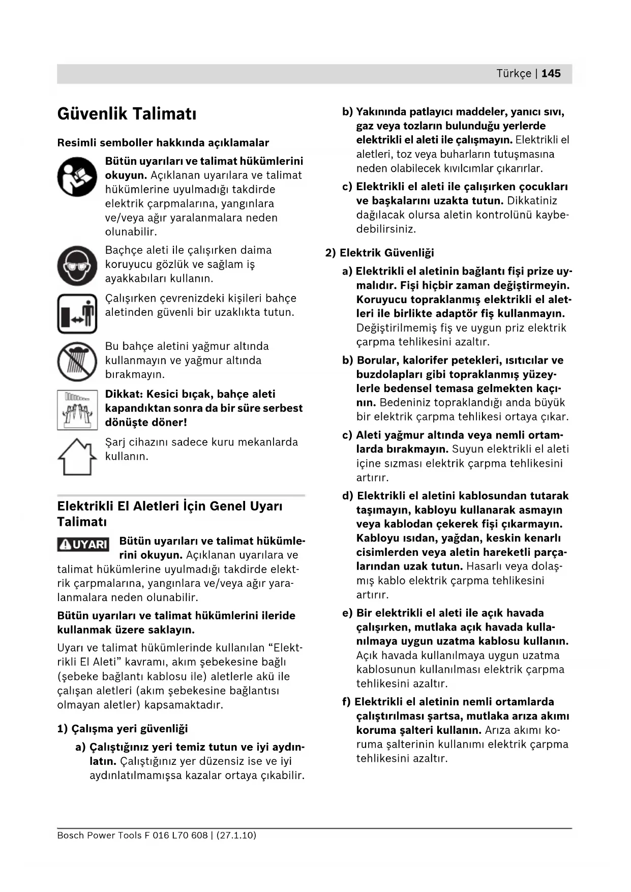 a) Elektrikli el aletinin bağlant fişi prize uy- maldr. Fişi hiçbir zaman değiştirmeyin. Koruyucu topraklanmş elektrikli el alet- leri ile birlikte adaptör fiş kullanmayn. Değiştirilmemiş fiş ve uygun priz elektrik çarpma tehlikesini azaltr. b) Borular, kalorifer petekleri, stclar ve buzdolaplar gibi topraklanmş yüzey- lerle bedensel temasa gelmekten kaç- nn. Bedeniniz topraklandğ anda büyük bir elektrik çarpma tehlikesi ortaya çkar. c) Aleti yağmur altnda veya nemli ortam- larda brakmayn. Suyun elektrikli el aleti içine szmas elektrik çarpma tehlikesini artrr. d) Elektrikli el aletini kablosundan tutarak taşmayn, kabloyu kullanarak asmayn veya kablodan çekerek fişi çkarmayn. Kabloyu sdan, yağdan, keskin kenarl cisimlerden veya aletin hareketli parça- larndan uzak tutun. Hasarl veya dolaş- mş kablo elektrik çarpma tehlikesini artrr. e) Bir elektrikli el aleti ile açk havada çalşrken, mutlaka açk havada kulla- nlmaya uygun uzatma kablosu kullann. Açk havada kullanlmaya uygun uzatma kablosunun kullanlmas elektrik çarpma tehlikesini azaltr. f) Elektrikli el aletinin nemli ortamlarda çalştrlmas şartsa, mutlaka arza akm koruma şalteri kullann. Arza akm ko- ruma şalterinin kullanm elektrik çarpma tehlikesini azaltr. UYARI OBJ_BUCH-1077-002.book Page 145 Wednesday, January 27, 2010 4:40 PM146 | Türkçe F 016 L70 608 | (27.1.10) Bosch Power Tools