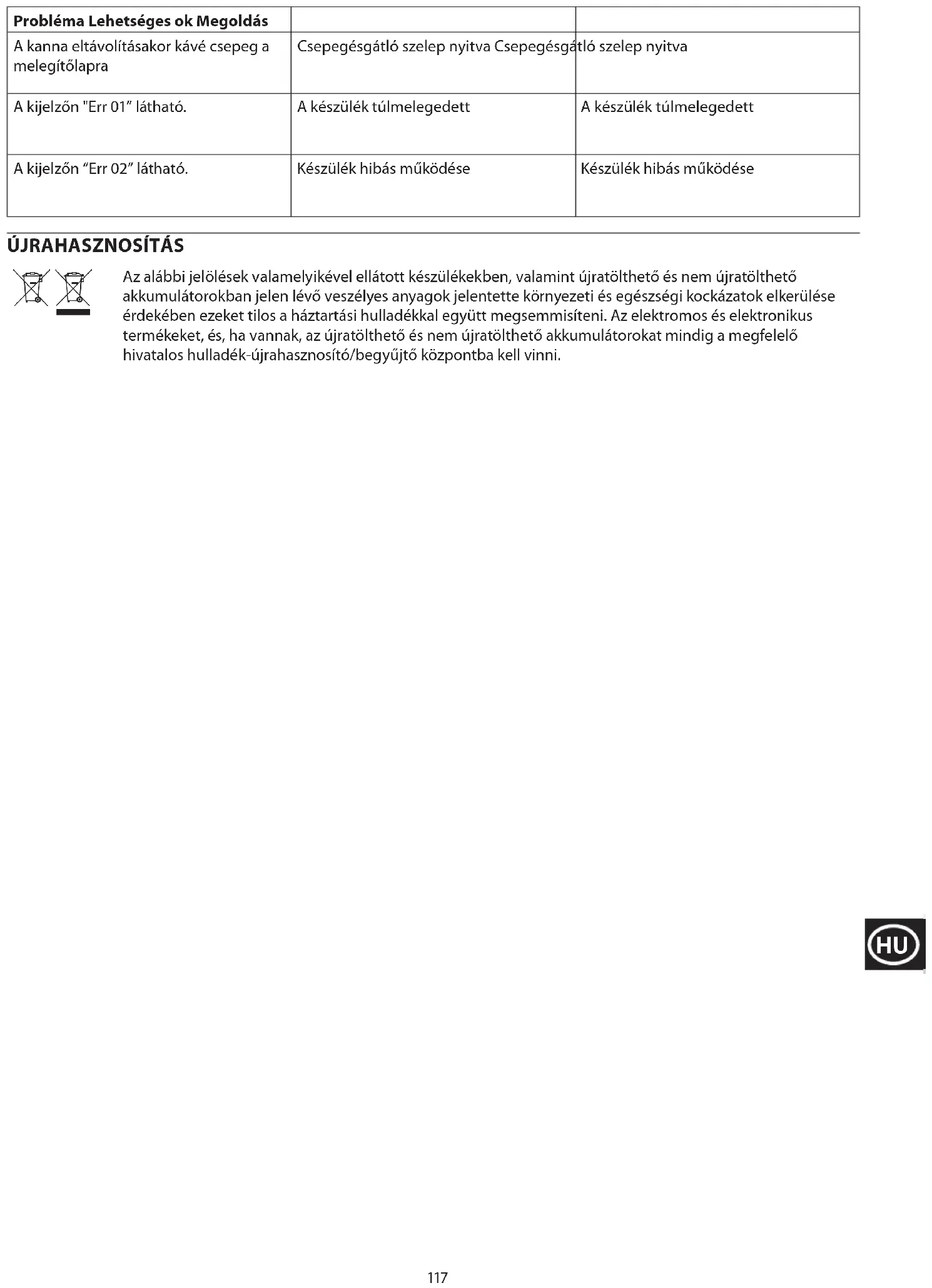 Sorun Olası Neden Çözüm Kahve yapılmıyor Su deposu boş Su deposunu doldurun Damlama önleyici kol, kapalı konumda Damlama önleyici kolu sağa hareket ettirin Aşırı buhar üretiliyor Kireç birikimi Kireçlenmeyi gidermek için, temizleme işlevini kireç çözücü bir ürünle çalıştırın Kahve zayıf veya miktar yanlış görünüyor Kireç birikimi Kireçlenmeyi gidermek için, temizleme işlevini kireç çözücü bir ürünle çalıştırın Kontrol paneli dokunmaya yanıt vermiyor Kontrol paneli kirli Kontrol panelini nemli bir bezle silin ve ardından iyice kurulayın Sürahi çıkarıldığında ısıtma plakasına kahve damlıyor Damlamayı önleme valfi açık Valfi kapatmak için kolu sola hareket ettirin123