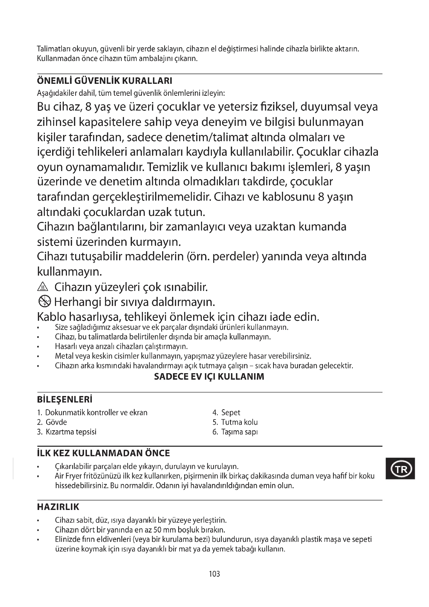 - Air Fryer fritözünüzü ilk kez kullanırken, pişirmenin ilk birkaç dakikasında duman veya hafif bir koku hissedebilirsiniz. Bu normaldir. Odanın iyi havalandırıldığından emin olun. HAZIRLIK