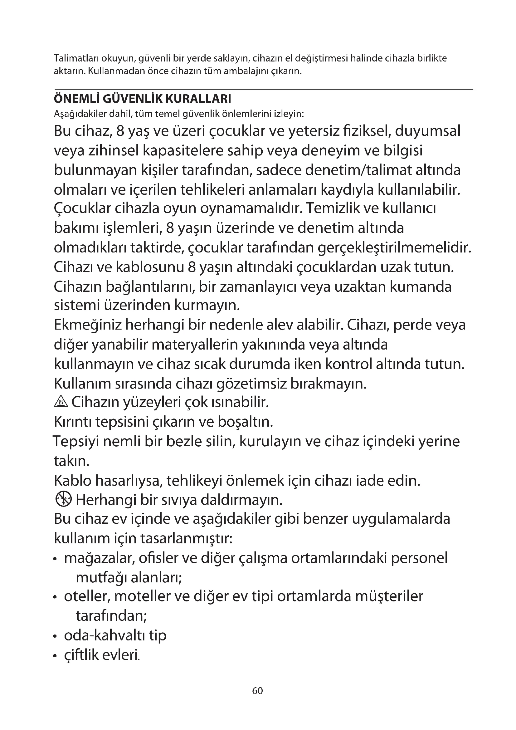 Aşağıdakiler dahil, tüm temel güvenlik önlemlerini izleyin: Bu cihaz, 8 yaş ve üzeri çocuklar ve yetersiz fiziksel, duyumsal veya zihinsel kapasitelere sahip veya deneyim ve bilgisi bulunmayan kişiler tarafından, sadece denetim/talimat altında olmaları ve içerilen tehlikeleri anlamaları kaydıyla kullanılabilir. Çocuklar cihazla oyun oynamamalıdır. Temizlik ve kullanıcı bakımı işlemleri, 8 yaşın üzerinde ve denetim altında olmadıkları taktirde, çocuklar tarafından gerçekleştirilmemelidir. Cihazı ve kablosunu 8 yaşın altındaki çocuklardan uzak tutun. Cihazın bağlantılarını, bir zamanlayıcı veya uzaktan kumanda sistemi üzerinden kurmayın. Ekmeğiniz herhangi bir nedenle alev alabilir. Cihazı, perde veya diğer yanabilir materyallerin yakınında veya altında kullanmayın ve cihaz sıcak durumda iken kontrol altında tutun. Kullanım sırasında cihazı gözetimsiz bırakmayın. h Cihazın yüzeyleri çok ısınabilir. Kırıntı tepsisini çıkarın ve boşaltın. Tepsiyi nemli bir bezle silin, kurulayın ve cihaz içindeki yerine takın. Kablo hasarlıysa, tehlikeyi önlemek için cihazı iade edin. i Herhangi bir sıvıya daldırmayın. Bu cihaz ev içinde ve aşağıdakiler gibi benzer uygulamalarda kullanım için tasarlanmıştır: