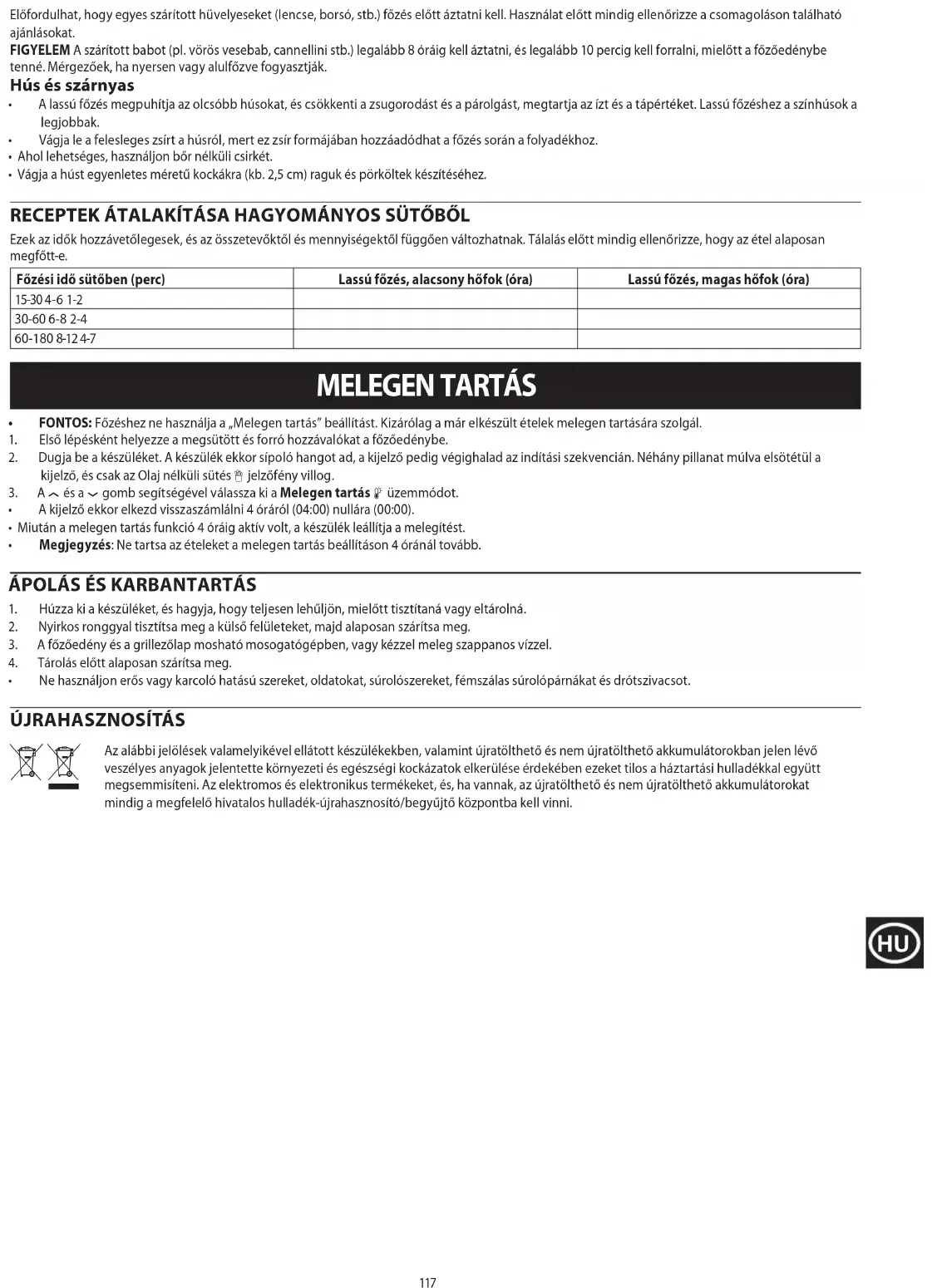 - Güveçler ve yahniler için, eti eşit boyutlu küpler (yaklaşık 2,5 cm) halinde kesin. GELENEKSEL BİR FIRIN TARİFİNİ DÖNÜŞTÜRME Bunlar yaklaşık sürelerdir ve malzemelere ve miktarlara bağlı olarak farklılık gösterebilir. Servis yapmadan önce yemeğin iyi piştiğini her zaman kontrol edin. Fırında pişirme süresi (dakika) Yavaş Pişirme Düşük için süre (saat) Yavaş Pişirme Yüksek için süre (saat) 15-30 4-6 1-230-60 6-8 2-460-180 8-12 4-7 SICAK TUTMA