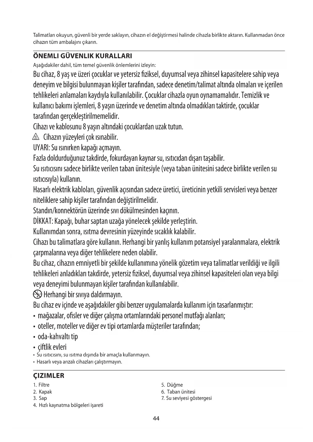 Aşağıdakiler dahil, tüm temel güvenlik önlemlerini izleyin: Bu cihaz, 8 yaş ve üzeri çocuklar ve yetersiz fiziksel, duyumsal veya zihinsel kapasitelere sahip veya deneyim ve bilgisi bulunmayan kişiler tarafından, sadece denetim/talimat altında olmaları ve içerilen tehlikeleri anlamaları kaydıyla kullanılabilir. Çocuklar cihazla oyun oynamamalıdır. Temizlik ve kullanıcı bakımı işlemleri, 8 yaşın üzerinde ve denetim altında olmadıkları taktirde, çocuklar tarafından gerçekleştirilmemelidir. Cihazı ve kablosunu 8 yaşın altındaki çocuklardan uzak tutun. h Cihazın yüzeyleri çok ısınabilir. UYARI: Su ısınırken kapağı açmayın. Fazla doldurduğunuz takdirde, fokurdayan kaynar su, ısıtıcıdan dışarı taşabilir. Su ısıtıcısını sadece birlikte verilen taban ünitesiyle (veya taban ünitesini sadece birlikte verilen su ısıtıcısıyla) kullanın. Hasarlı elektrik kabloları, güvenlik açısından sadece üretici, üreticinin yetkili servisleri veya benzer niteliklere sahip kişiler tarafından değiştirilmelidir. Standın/konnektörün üzerinde sıvı dökülmesinden kaçının. DİKKAT: Kapağı, buhar saptan uzağa yönelecek şekilde yerleştirin. Kullanımdan sonra, ısıtma devresinin yüzeyinde sıcaklık kalabilir. Cihazı bu talimatlara göre kullanın. Herhangi bir yanlış kullanım potansiyel yaralanmalara, elektrik çarpmalarına veya diğer tehlikelere neden olabilir. Bu cihaz, cihazın emniyetli bir şekilde kullanımına yönelik gözetim veya talimatlar verildiği ve ilgili tehlikeleri anladıkları takdirde, yetersiz fiziksel, duyumsal veya zihinsel kapasiteleri olan veya bilgi veya deneyimi bulunmayan kişiler tarafından kullanılabilir.