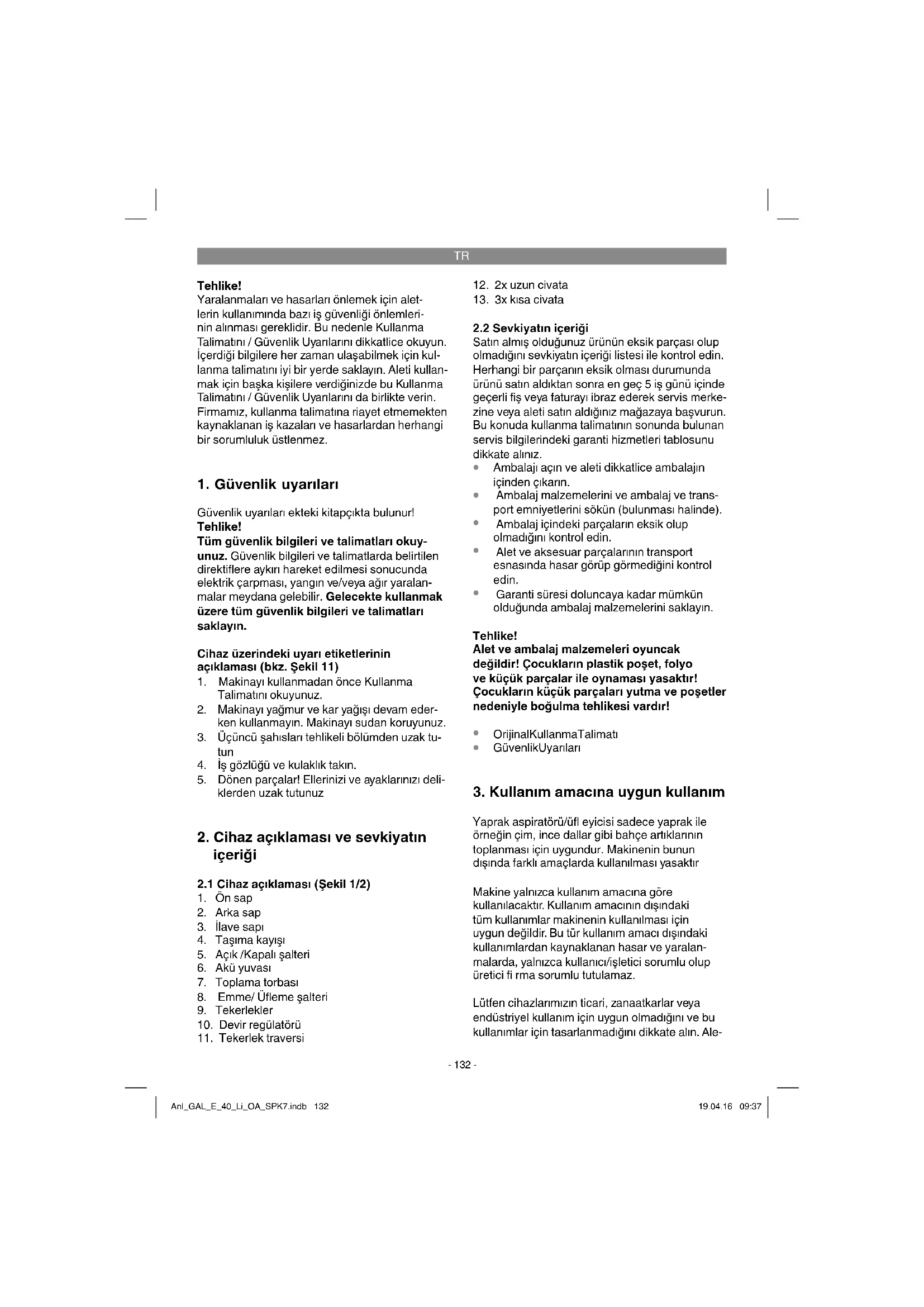 Yaprak aspiratörü/üfl eyicisi sadece yaprak ile örneğin çim, ince dallar gibi bahçe artıklarının toplanması için uygundur. Makinenin bunun dışında farklı amaçlarda kullanılması yasaktır Makine yalnızca kullanı m amacına göre kullanılacaktır. Kullanım amacının dışındaki tüm kullanımlar makinenin kullanılması için uygun değildir. Bu tür kullanım amacı dışındaki kullanımlardan kaynaklanan hasar ve yaralan- malarda, yalnızca kullanıcı/işletici sorumlu olup üretici fi rma sorumlu tutulamaz. Lütfen cihazlarımızın ticari, zanaatkarlar veya endüstriyel kullanım için uygun olmadığını ve bu kullanımlar için tasarlanmadığını dikkate alın. Ale- Anl_GAL_E_40_Li_OA_SPK7.indb 132Anl_GAL_E_40_Li_OA_SPK7.indb 132 19.04.16 09:3719.04.16 09:37TR
