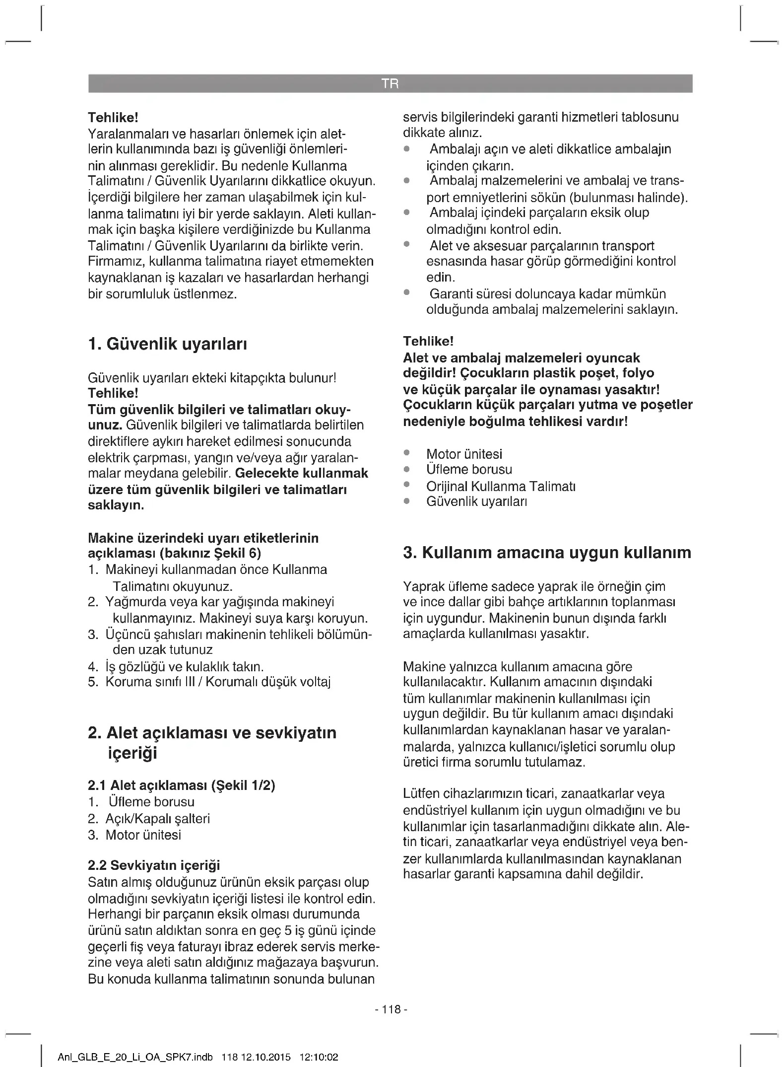 Yaprak üeme sadece yaprak ile örneğin çim ve ince dallar gibi bahçe artıklarının toplanması için uygundur. Makinenin bunun dışında farklı amaçlarda kullanılması yasaktır. Makine yalnızca kullanım amacına göre kullanılacaktır. Kullanım amacının dışındaki tüm kullanımlar makinenin kullanılması için uygun değildir. Bu tür kullanım amacı dışındaki kullanımlardan kaynaklanan hasar ve yaralan- malarda, yalnızca kullanıcı/işletici sorumlu olup üretici rma sorumlu tutulamaz. Lütfen cihazlarımızın ticari, zanaatkarlar veya endüstriyel kullanım için uygun olmadığını ve bu kullanımlar için tasarlanmadığını dikkate alın. Ale- tin ticari, zanaatkarlar veya endüstriyel veya ben- zer kullanımlarda kullanılmasından kaynaklanan hasarlar garanti kapsamına dahil değildir. Anl_GLB_E_20_Li_OA_SPK7.indb 118 12.10.2015 12:10:02TR