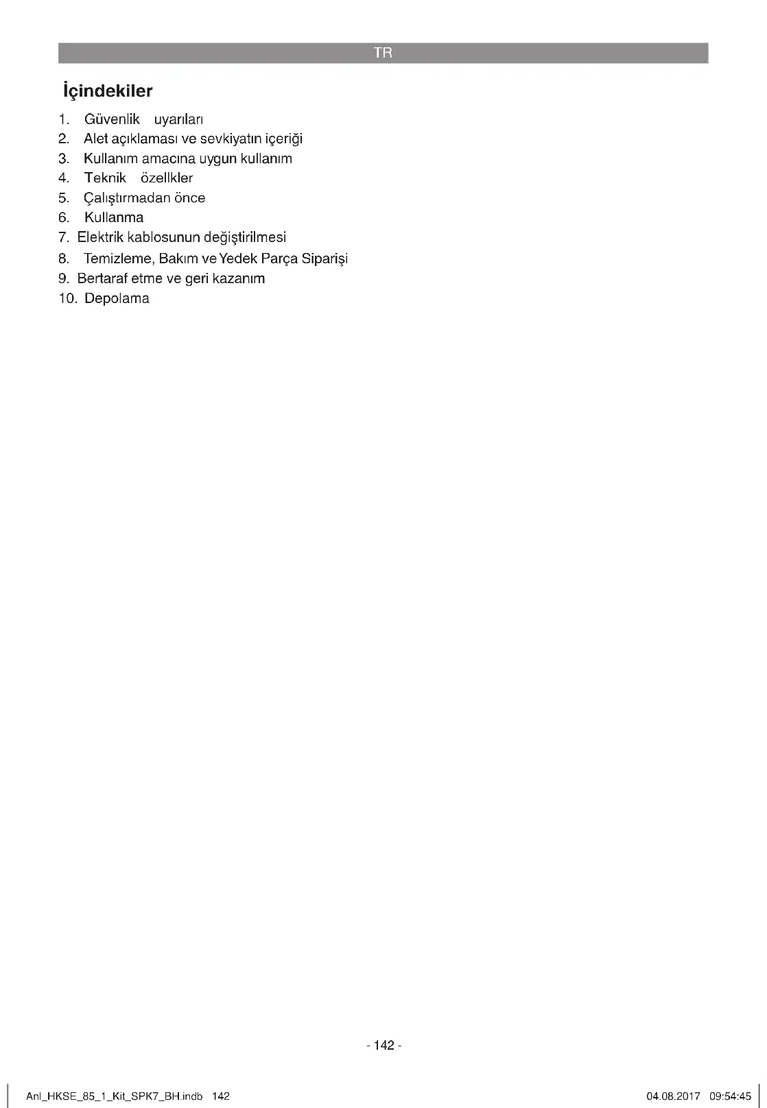 Sadece AB Ülkeleri İçin Geçerlidir Elektrikli cihazları çöpe atmayınız. Elektrikli ve elektronik aletler ile ilgili 2012/19/AB nolu Avrupa Yönetmeliğince ve ilgili yönetmeliğin ulusal normlara uyarlanması sonucunda kullanılmış elektrikli aletler ayrıştırılmış olarak toplanacak ve çevreye zarar vermeyecek şekilde geri kazanım sistemlerine teslim edilecektir. Kullanılmış Cihazların İadesi Yerine Uygulanacak Geri Dönüşüm Alternatifi : Kullanılmış elektrikli alet ve cihaz sahipleri bu eşyalarını iade etme yerine alternatif olarak, yönetmelikle- re uygun olarak çalışan geri dönüşüm merkezlerine vermekle yükümlüdür. Bunun için kullanılmış cihaz, ulusal dönüşüm ekonomisi ve atık kanununa göre atıkların arıtılmasını sağlayan kullanılmış cihaz teslim alma yerine teslim edilecektir. Kullanılmış alet ve cihazlara eklenen ve elektrikli sistemi bulunmayan ak- sesuar ile yardı mcı malzemeler bu düzenlemeden muaf tutulur. Ürünlerinin dokümantasyonu ve evraklarının kısmen olsa dahi kopyalanması veya başka şekilde çoğaltılması, yalnızca iSC GmbH fi rmasının özel onayı alınmak şartıyla serbesttir. Teknik değişiklikler olabilir Anl_HKSE_85_1_Kit_SPK7_BH.indb 148Anl_HKSE_85_1_Kit_SPK7_BH.indb 148 04.08.2017 09:54:4704.08.2017 09:54:47TR