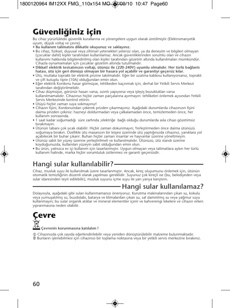 Güvenli¤iniz için Bu cihaz yürürlükteki güvenlik kurallar›na ve yönergelere uygun olarak üretilmifltir (Elektromanyetik uyum, düflük voltaj ve çevre). • Bu kullan›m talimat›n› dikkatle okuyunuz ve saklay›n›z. • Bu cihaz, fiziksel, duyusal veya zihinsel yetenekleri yetersiz olan, ya da deneyim ve bilgileri olmayan (çocuklar dahil) kifliler taraf›ndan kullan›lamaz. Ancak güvenliklerinden sorumlu olan ve cihaz›n kullan›m› hakk›nda bilgilendirilmifl olan kifliler taraf›ndan gözetim alt›nda kullan›lmalar› mümkündür. Cihazla oynamamalar› için çocuklar gözetim alt›nda tutulmal›d›r. • Dikkat! elektrik tesisat›n›z›n voltaj›, ütünüz ile (220-240V) uyumlu olmal›d›r. Her türlü ba¤lant› hatas›, ütü için geri dönüflü olmayan bir hasara yol açabilir ve garantiyi geçersiz k›lar. • Ütü, mutlaka toprakl› bir elektrik prizine tak›lmal›d›r. E¤er bir uzatma kablosu kullan›yorsan›z, toprakl› ve çift kutuplu tipte (10A) oldu¤undan emin olun. • E¤er elektrik Kordonu hasar görmüflse, tehlikeden kaç›nmak için, derhal bir Yetkili Servis Merkezi taraf›ndan de¤ifltirilmelidir. • Cihaz düflmüflse, görünür hasar› varsa, s›z›nt› yap›yorsa veya iflleyifl bozukluklar› varsa kullan›lmamal›d›r. Cihaz›n›z› hiçbir zaman parçalar›na ay›rmay›n: tehlikeleri önlemek aç›s›ndan Yetkili Servis Merkezinde kontrol ettirin. • Ütüyü hiçbir zaman suya sokmay›n›z! • Cihaz›n fiflini, Kordonundan çekerek prizden ç›karmay›n›z. Afla¤›daki durumlarda cihaz›n›z›n fiflini daima prizden çekiniz: hazneyi doldurmadan veya çalkalamadan önce, temizlemeden önce, her kullan›m sonras›nda. • 1 saat kadar so¤umadı¤ı süre zarfında ;elektri¤e ba¤lı oldu¤u durumlarda asla cihaz› gözetimsiz b›rakmay›n. • Ütünün taban› çok s›cak olabilir: Hiçbir zaman dokunmay›n; Yerlefltirmeden önce daima ütünüzü so¤umaya b›rak›n. Özellikle ütü masan›z›n bir köflesi üzerinde ütü yapt›¤›n›zda cihaz›n›z, yan›klara yol açabilecek bir buhar ç›kar›r. Buhar› hiçbir zaman insanlar ve hayvanlar üzerine yöneltmeyin. • Ütünüz sabit bir yüzey üzerine yerlefltirilmeli ve kullan›lmal›d›r. Ütünüzü, ütü stand› üzerine koydu¤unuzda, kullan›lan yüzeyin sabit oldu¤undan emin olun. • Bu ürün, yaln›zca ev içi kullan›m için tasarlanm›flt›r. Uygun olmayan veya talimatlara ayk›r› her türlü kullan›m halinde, marka hiçbir sorumluluk üstlenmez ve garanti geçersizdir.