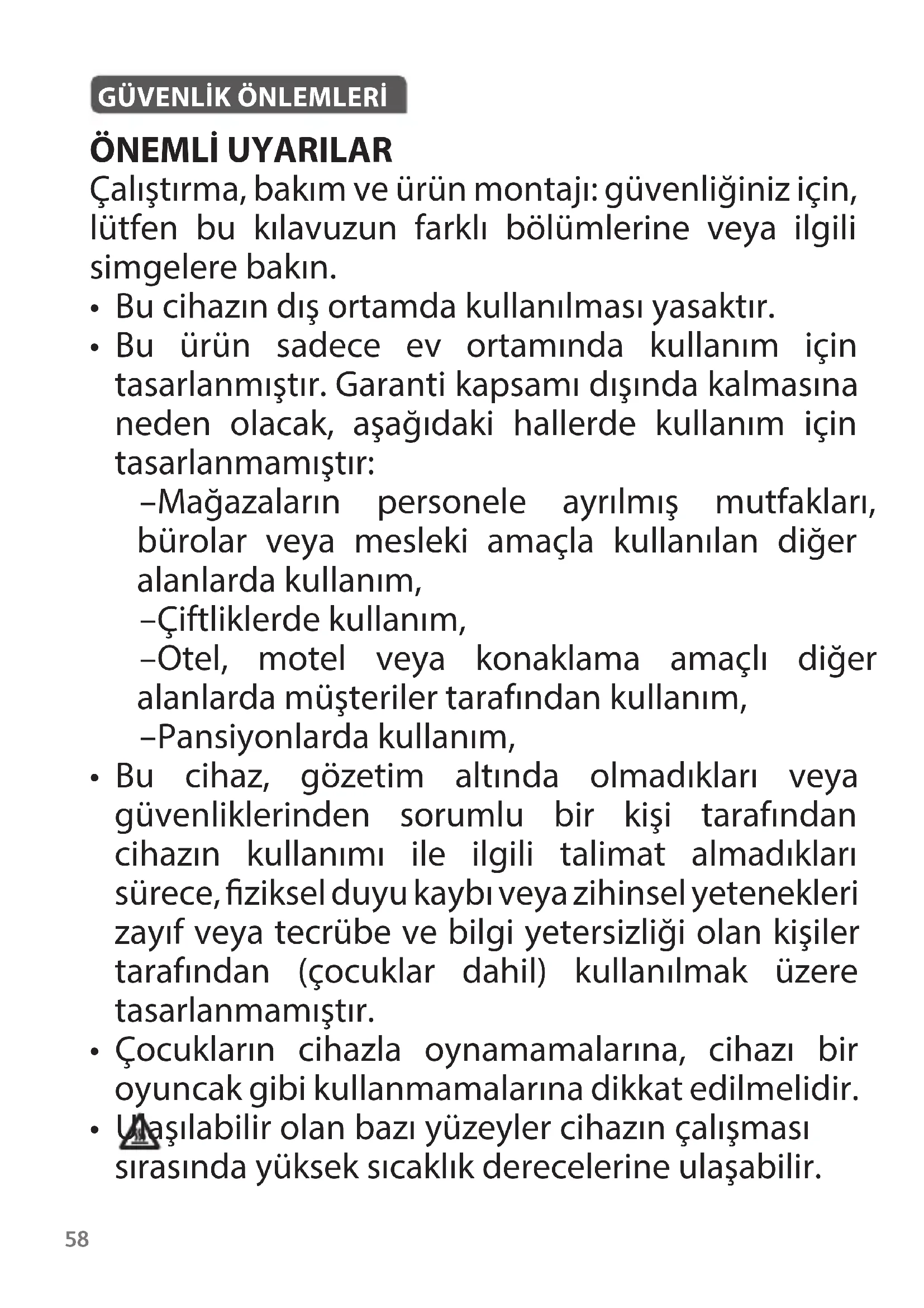 - Ulaşılabilir olan bazı yüzeyler cihazın çalışması sırasında yüksek sıcaklık derecelerine ulaşabilir.