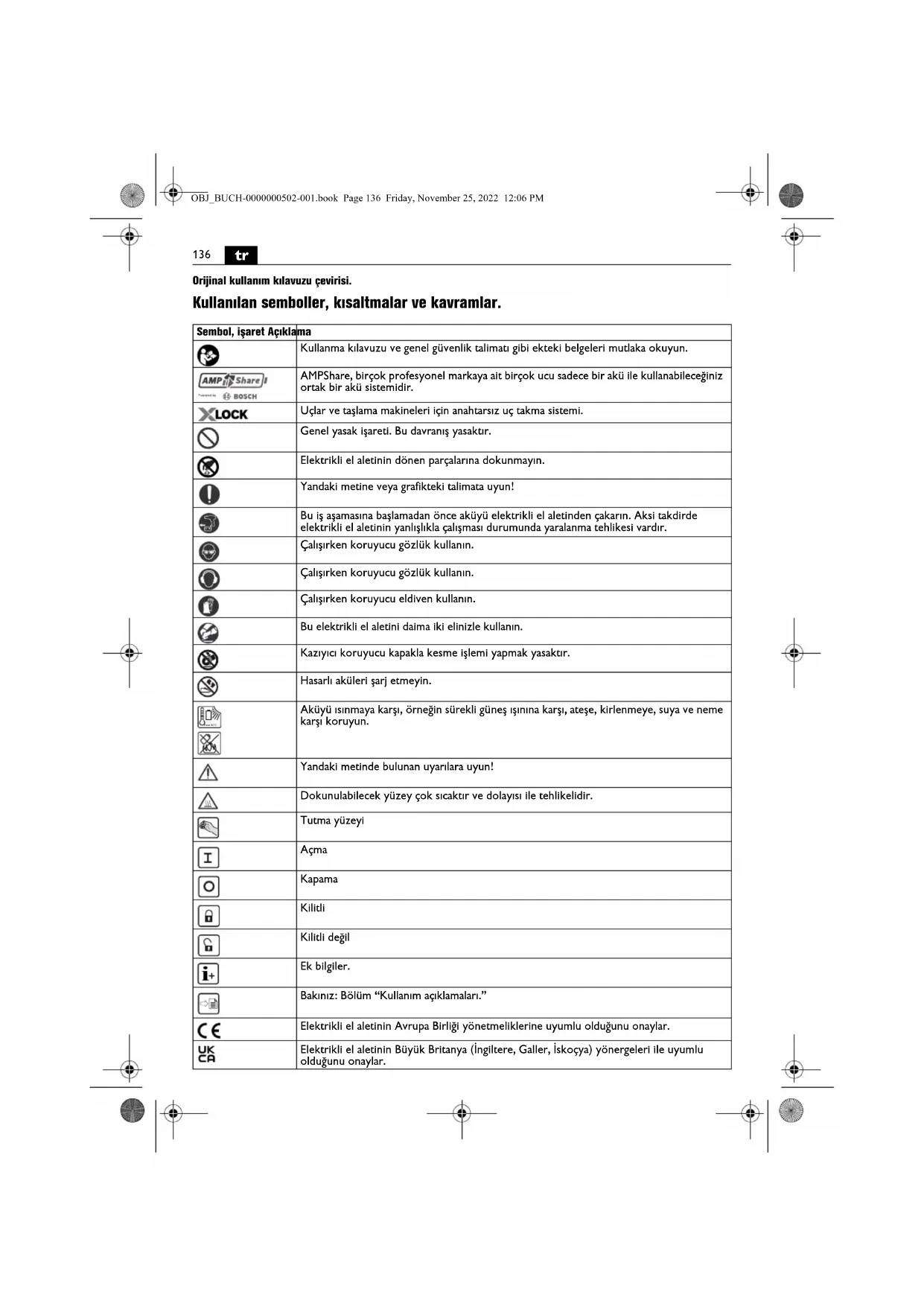 Orijinal kullanım kılavuzu çevirisi. Kullanılan semboller, kısaltmalar ve kavramlar. Sembol, işaret Açıklama Kullanma kılavuzu ve genel güvenlik talimatı gibi ekteki belgeleri mutlaka okuyun. AMPShare, birçok profesyonel markaya ait birçok ucu sadece bir akü ile kullanabileceğiniz ortak bir akü sistemidir. Uçlar ve taşlama makineleri için anahtarsız uç takma sistemi. Genel yasak işareti. Bu davranış yasaktır. Elektrikli el aletinin dönen parçalarına dokunmayın. Yandaki metine veya grafikteki talimata uyun! Bu iş aşamasına başlamadan önce aküyü elektrikli el aletinden çakarın. Aksi takdirde elektrikli el aletinin yanlışlıkla çalışması durumunda yaralanma tehlikesi vardır. Çalışırken koruyucu gözlük kullanın. Çalışırken koruyucu gözlük kullanın. Çalışırken koruyucu eldiven kullanın. Bu elektrikli el aletini daima iki elinizle kullanın. Kazıyıcı koruyucu kapakla kesme işlemi yapmak yasaktır. Hasarlı aküleri şarj etmeyin. Aküyü ısınmaya karşı, örneğin sürekli güneş ışınına karşı, ateşe, kirlenmeye, suya ve neme karşı koruyun. Yandaki metinde bulunan uyarılara uyun! Dokunulabilecek yüzey çok sıcaktır ve dolayısı ile tehlikelidir. Tutma yüzeyi Açma Kapama Kilitli Kilitli değil Ek bilgiler. Bakınız: Bölüm “Kullanım açıklamaları.” Elektrikli el aletinin Avrupa Birliği yönetmeliklerine uyumlu olduğunu onaylar. Elektrikli el aletinin Büyük Britanya (İngiltere, Galler, İskoçya) yönergeleri ile uyumlu olduğunu onaylar. max.50°C OBJ_BUCH-0000000502-001.book Page 136 Friday, November 25, 2022 12:06 PM137