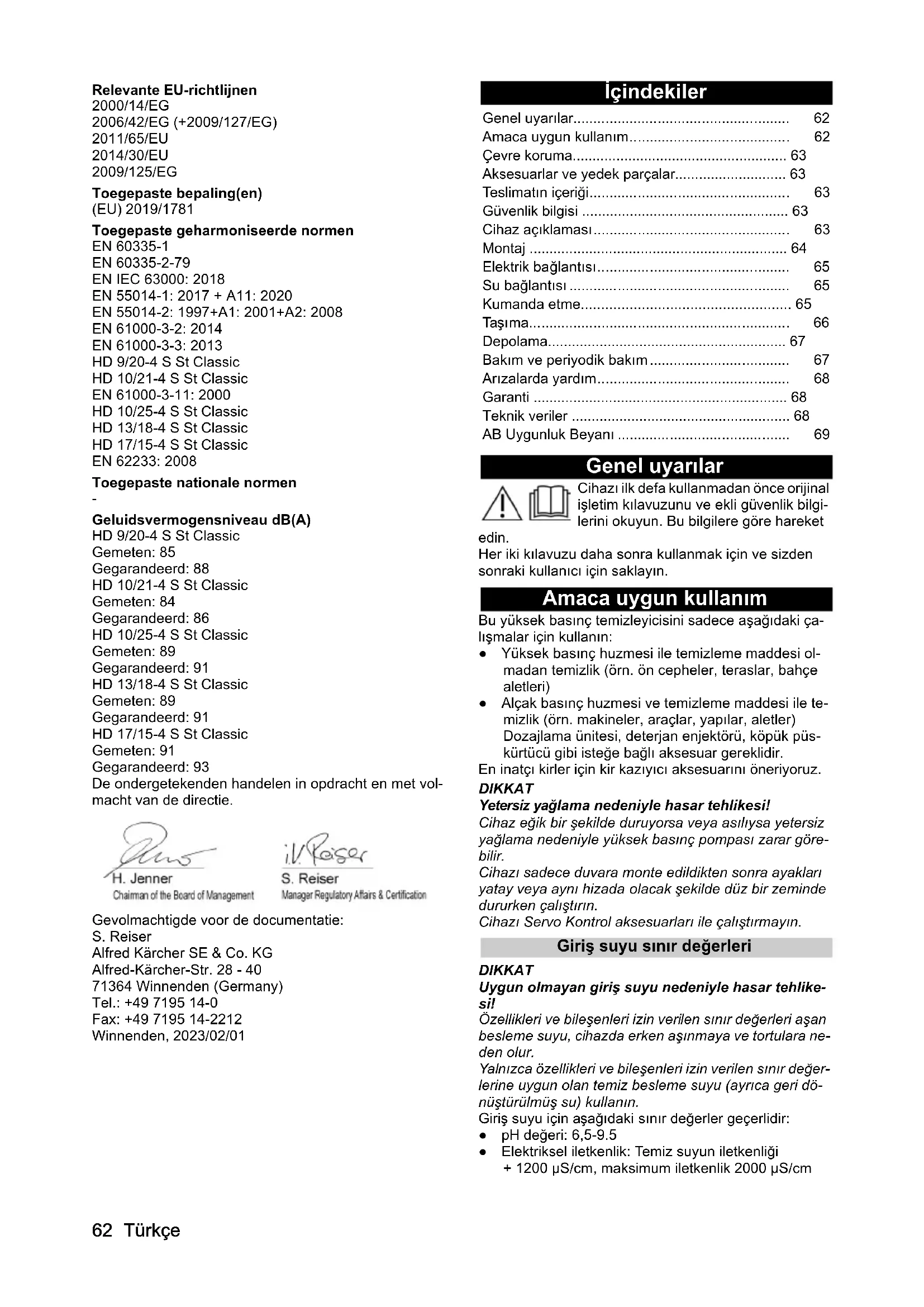 - Geluidsvermogensniveau dB(A) HD 9/20-4 S St Classic Gemeten: 85 Gegarandeerd: 88 HD 10/21-4 S St Classic Gemeten: 84 Gegarandeerd: 86 HD 10/25-4 S St Classic Gemeten: 89 Gegarandeerd: 91 HD 13/18-4 S St Classic Gemeten: 89 Gegarandeerd: 91 HD 17/15-4 S St Classic Gemeten: 91 Gegarandeerd: 93 De ondergetekenden handelen in opdracht en met vol- macht van de directie. Gevolmachtigde voor de documentatie: S. Reiser Alfred Kärcher SE & Co. KG Alfred-Kärcher-Str. 28 - 40 71364 Winnenden (Germany) Tel.: +49 7195 14-0 Fax: +49 7195 14-2212 Winnenden, 2023/02/01 İçindekiler Genel uyarılar Cihazı ilk defa kullanmadan önce orijinal işletim kılavuzunu ve ekli güvenlik bilgi- lerini okuyun. Bu bilgilere göre hareket edin. Her iki kılavuzu daha sonra kullanmak için ve sizden sonraki kullanıcı için saklayın. Amaca uygun kullanım Bu yüksek basınç temizleyicisini sadece aşağıdaki ça- lışmalar için kullanın: ● Yüksek basınç huzmesi ile temizleme maddesi ol- madan temizlik (örn. ön cepheler, teraslar, bahçe aletleri) ● Alçak basınç huzmesi ve temizleme maddesi ile te- mizlik (örn. makineler, araçlar, yapılar, aletler) Dozajlama ünitesi, deterjan enjektörü, köpük püs- kürtücü gibi isteğe bağlı aksesuar gereklidir. En inatçı kirler için kir kazıyıcı aksesuarını öneriyoruz. DIKKAT Yetersiz yağlama nedeniyle hasar tehlikesi! Cihaz eğik bir şekilde duruyorsa veya asılıysa yetersiz yağlama nedeniyle yüksek basınç pompası zarar göre- bilir. Cihazı sadece duvara monte edildikten sonra ayakları yatay veya aynı hizada olacak şekilde düz bir zeminde dururken çalıştırın. Cihazı Servo Kontrol aksesuarları ile çalıştırmayın. Giriş suyu sınır değerleri DIKKAT Uygun olmayan giriş suyu nedeniyle hasar tehlike- si! Özellikleri ve bileşenleri izin verilen sınır değerleri aşan besleme suyu, cihazda erken aşınmaya ve tortulara ne- den olur. Yalnızca özellikleri ve bileşenleri izin verilen sınır değer- lerine uygun olan temiz besleme suyu (ayrıca geri dö- nüştürülmüş su) kullanın. Giriş suyu için aşağıdaki sınır değerler geçerlidir: ● pH değeri: 6,5-9.5 ● Elektriksel iletkenlik: Temiz suyun iletkenliği + 1200 µS/cm, maksimum iletkenlik 2000 µS/cm Genel uyarılar p. 62