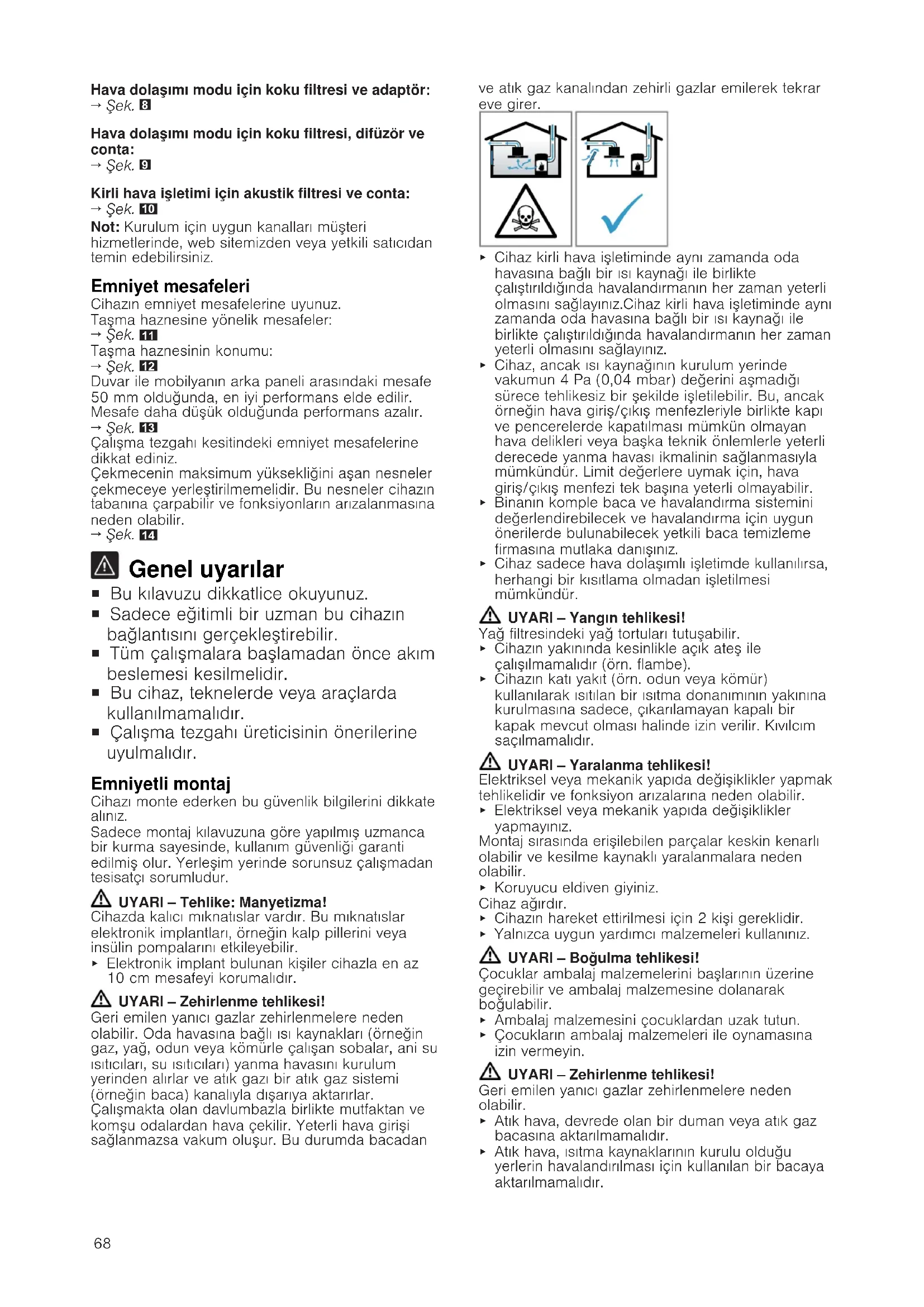 Genel uyarılar ¡ Bu kılavuzu dikkatlice okuyunuz. ¡ Sadece eğitimli bir uzman bu cihazın bağlantısını gerçekleştirebilir. ¡ Tüm çalışmalara başlamadan önce akım beslemesi kesilmelidir. ¡ Bu cihaz, teknelerde veya araçlarda kullanılmamalıdır. ¡ Çalışma tezgahı üreticisinin önerilerine uyulmalıdır. Emniyetli montaj Cihazı monte ederken bu güvenlik bilgilerini dikkate alınız. Sadece montaj kılavuzuna göre yapılmış uzmanca bir kurma sayesinde, kullanım güvenliği garanti edilmiş olur. Yerleşim yerinde sorunsuz çalışmadan tesisatçı sorumludur. UYARI‒Tehlike: Manyetizma! Cihazda kalıcı mıknatıslar vardır. Bu mıknatıslar elektronik implantları, örneğin kalp pillerini veya insülin pompalarını etkileyebilir. ▶ Elektronik implant bulunan kişiler cihazla en az 10cm mesafeyi korumalıdır. UYARI‒Zehirlenme tehlikesi! Geri emilen yanıcı gazlar zehirlenmelere neden olabilir. Oda havasına bağlı ısı kaynakları (örneğin gaz, yağ, odun veya kömürle çalışan sobalar, ani su ısıtıcıları, su ısıtıcıları) yanma havasını kurulum yerinden alırlar ve atık gazı bir atık gaz sistemi (örneğin baca) kanalıyla dışarıya aktarırlar. Çalışmakta olan davlumbazla birlikte mutfaktan ve komşu odalardan hava çekilir. Yeterli hava girişi sağlanmazsa vakum oluşur. Bu durumda bacadan ve atık gaz kanalından zehirli gazlar emilerek tekrar eve girer. ▶ Cihaz kirli hava işletiminde aynı zamanda oda havasına bağlı bir ısı kaynağı ile birlikte çalıştırıldığında havalandırmanın her zaman yeterli olmasını sağlayınız.Cihaz kirli hava işletiminde aynı zamanda oda havasına bağlı bir ısı kaynağı ile birlikte çalıştırıldığında havalandırmanın her zaman yeterli olmasını sağlayınız. ▶ Cihaz, ancak ısı kaynağının kurulum yerinde vakumun 4Pa(0,04mbar) değerini aşmadığı sürece tehlikesiz bir şekilde işletilebilir. Bu, ancak örneğin hava giriş/çıkış menfezleriyle birlikte kapı ve pencerelerde kapatılması mümkün olmayan hava delikleri veya başka teknik önlemlerle yeterli derecede yanma havası ikmalinin sağlanmasıyla mümkündür. Limit değerlere uymak için, hava giriş/çıkış menfezi tek başına yeterli olmayabilir. ▶ Binanın komple baca ve havalandırma sistemini değerlendirebilecek ve havalandırma için uygun önerilerde bulunabilecek yetkili baca temizleme firmasına mutlaka danışınız. ▶ Cihaz sadece hava dolaşımlı işletimde kullanılırsa, herhangi bir kısıtlama olmadan işletilmesi mümkündür. UYARI‒Yangın tehlikesi! Yağ filtresindeki yağ tortuları tutuşabilir. ▶ Cihazın yakınında kesinlikle açık ateş ile çalışılmamalıdır (örn.flambe). ▶ Cihazın katı yakıt (örn. odun veya kömür) kullanılarak ısıtılan bir ısıtma donanımının yakınına kurulmasına sadece, çıkarılamayan kapalı bir kapak mevcut olması halinde izin verilir. Kıvılcım saçılmamalıdır. UYARI‒Yaralanma tehlikesi! Elektriksel veya mekanik yapıda değişiklikler yapmak tehlikelidir ve fonksiyon arızalarına neden olabilir. ▶ Elektriksel veya mekanik yapıda değişiklikler yapmayınız. Montaj sırasında erişilebilen parçalar keskin kenarlı olabilir ve kesilme kaynaklı yaralanmalara neden olabilir. ▶ Koruyucu eldiven giyiniz. Cihaz ağırdır. ▶ Cihazın hareket ettirilmesi için 2 kişi gereklidir. ▶ Yalnızca uygun yardımcı malzemeleri kullanınız. UYARI‒Boğulma tehlikesi! Çocuklar ambalaj malzemelerini başlarının üzerine geçirebilir ve ambalaj malzemesine dolanarak boğulabilir. ▶ Ambalaj malzemesini çocuklardan uzak tutun. ▶ Çocukların ambalaj malzemeleri ile oynamasına izin vermeyin. UYARI‒Zehirlenme tehlikesi! Geri emilen yanıcı gazlar zehirlenmelere neden olabilir. ▶ Atık hava, devrede olan bir duman veya atık gaz bacasına aktarılmamalıdır. ▶ Atık hava, ısıtma kaynaklarının kurulu olduğu yerlerin havalandırılması için kullanılan bir bacaya aktarılmamalıdır.69 ▶ Atık havanın devrede olmayan bir duman veya atık gaz bacasına aktarılması isteniyorsa yetkili baca temizleme ustasının iznini almanız gerekir. Geri emilen yanıcı gazlar zehirlenmelere neden olabilir. ▶ Aspiratör oda havasına bağlı bir ısı kaynağı ile birlikte kurulduğunda, aspiratörün elektrik beslemesine uygun bir emniyet şalteri takılmalıdır. Elektrik bağlantısına ilişkin bilgiler Cihazın elektrik bağlantısının güvenli şekilde sağlanması için bu bilgileri dikkate alınız. UYARI‒Elektrik çarpması tehlikesi! Cihazın elektrik şebekesinden ayrılması her zaman mümkün olmalıdır. Cihaz sadece kurallara uygun olarak monte edilmiş prize takılmalıdır. ▶ Sabit döşenen elektrik tesisatına aşırı gerilimden koruma kategorisi III koşullarına ve kurulum yönetmeliklerine uygun olarak çok kutuplu bir kesme tertibatı takılmalıdır. ▶ Sabit elektrik tesisatının sadece bir elektrik teknisyeni tarafından gerçekleştirmesi gerekir. Güç kaynağının akım devresine kaçak akım koruma şalteri (RCD) montajı yapmanızı öneririz. ¡ Bağlantı kablosu katlanmamalı veya sıkıştırılmamalı ve keskin cisimlerden uzak tutulmalıdır. ¡ Bağlantı kablosu, sıcak cihaz gövdelerine temas etmeyecek şekilde döşenmelidir. ¡ Sadece cihazla teslim edilen veya teknik müşteri hizmetlerinden tedarik edilen bağlantı kablosu kullanılmalıdır. ¡ Bu cihaz, AB parazitlenme giderme yönetmeliklerine uygundur. ¡ Cihaz koruma sınıfı 1'e aittir. Bu nedenle yalnızca topraklama kablosu bağlantısı kullanılmalıdır. ¡ Hatalı bir elektrik tesisatından kaynaklanan işletme arızaları veya olası hasarlarda üretici hiçbir şekilde sorumluluk kabul etmez. Elektrik bağlantısının hazırlanması Gereklilik:Yalnızca ilgili eğitimi almış müşteri hizmetleri personeli, cihazın iç kısmındaki çalışmaları yapabil