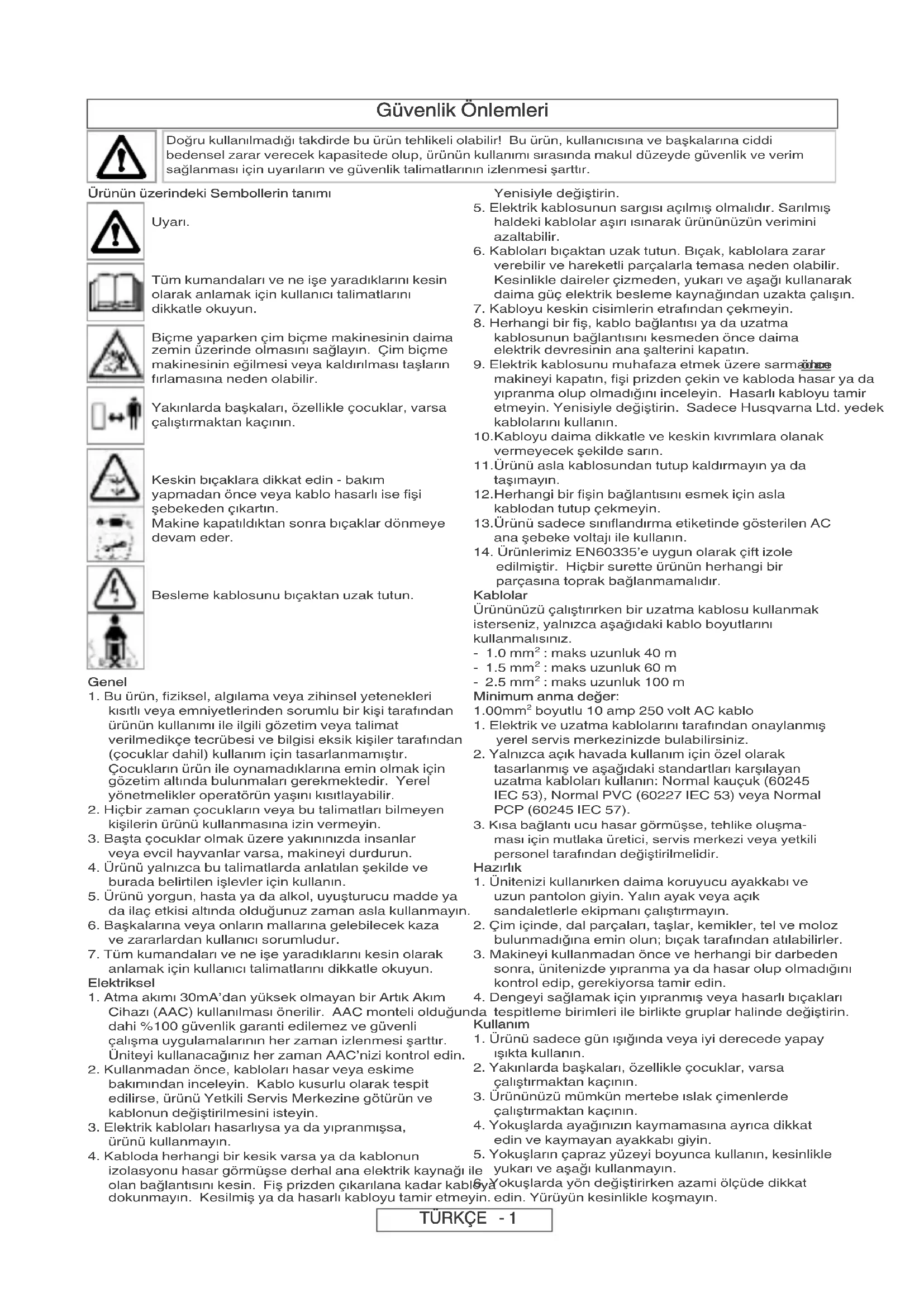 önce makineyi kapatın, fişi prizden çekin ve kabloda hasar ya da yıpranma olup olmadığını inceleyin. Hasarlı kabloyu tamir etmeyin. Yenisiyle değiştirin. Sadece Husqvarna Ltd. yedek kablolarını kullanın. 10.Kabloyu daima dikkatle ve keskin kıvrımlara olanak vermeyecek şekilde sarın. 11.Ürünü asla kablosundan tutup kaldırmayın ya da taşımayın. 12.Herhangi bir fişin bağlantısını esmek için asla kablodan tutup çekmeyin. 13.Ürünü sadece sınıflandırma etiketinde gösterilen AC ana şebeke voltajı ile kullanın.