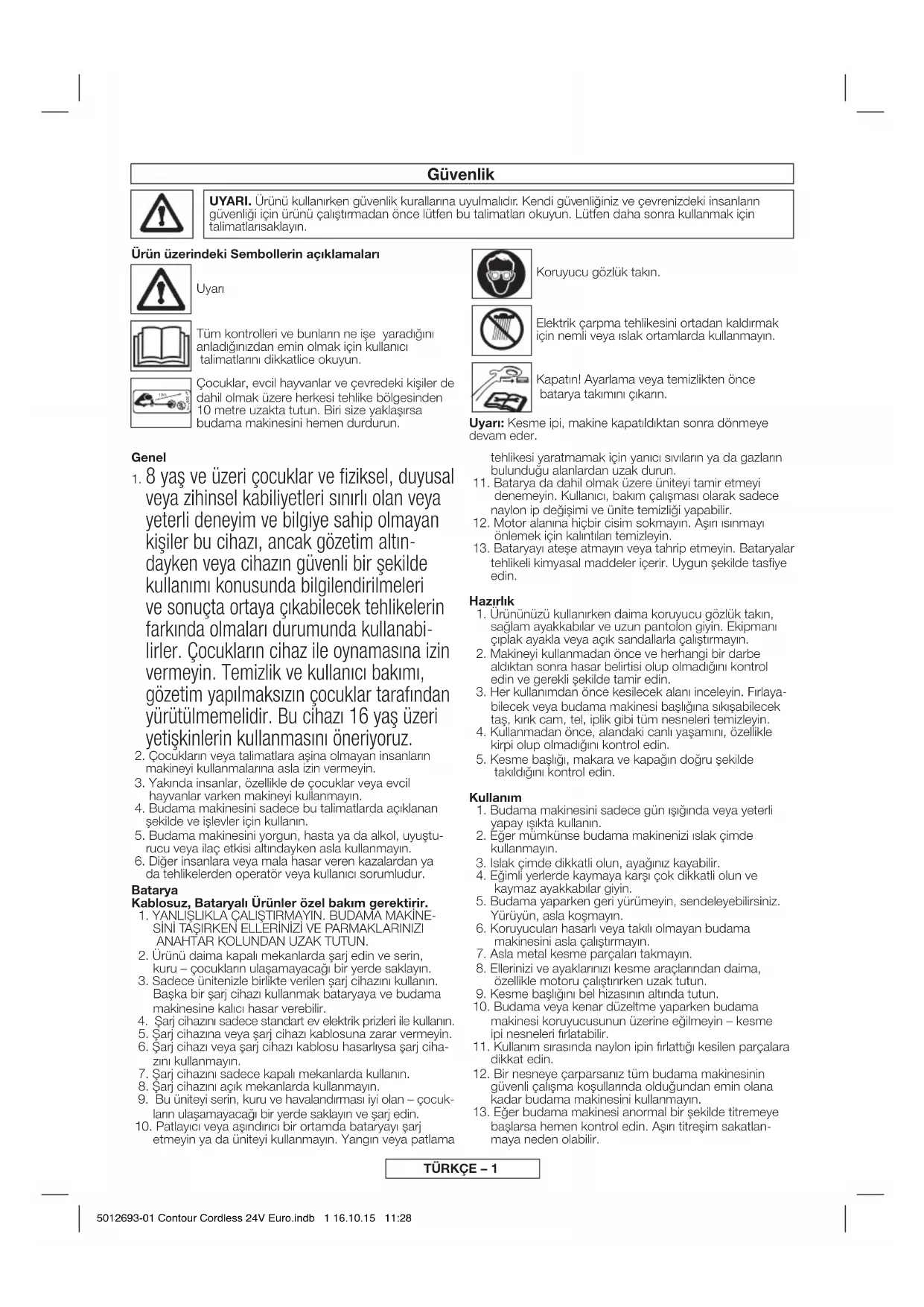 ) 1,5 Βάρος (Kg) 3,2 5012693-01 Contour Cordless 24V Euro.indb 6 16.10.15 11:28TÜRKÇE – 1 Güvenlik UYARI. Ürünü kullanırken güvenlik kurallarına uyulmalıdır. Kendi güvenliğiniz ve çevrenizdeki insanların güvenliği için ürünü çalıştırmadan önce lütfen bu talimatları okuyun. Lütfen daha sonra kullanmak için talimatları saklayın. Ürün üzerindeki Sembollerin açıklamaları Uyarı Tüm kontrolleri ve bunların ne işe yaradığını anladığınızdan emin olmak için kullanıcı talimatlarını dikkatlice okuyun. Çocuklar, evcil hayvanlar ve çevredeki kişiler de dahil olmak üzere herkesi tehlike bölgesinden 10 metre uzakta tutun. Biri size yaklaşırsa budama makinesini hemen durdurun. Koruyucu gözlük takın. Elektrik çarpma tehlikesini ortadan kaldırmak için nemli veya ıslak ortamlarda kullanmayın. Kapatın! Ayarlama veya temizlikten önce batarya takımını çıkarın. Uyarı: Kesme ipi, makine kapatıldıktan sonra dönmeye devam eder. 360º 10m Genel