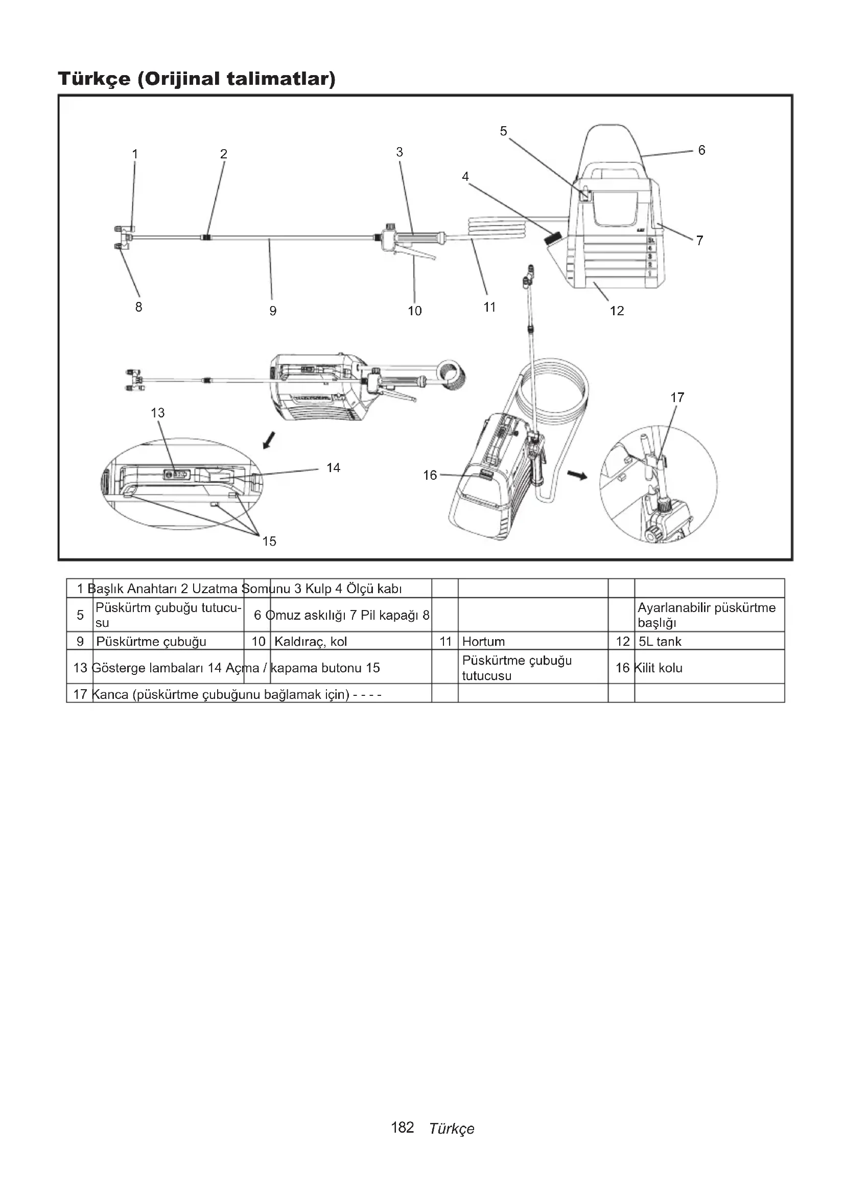 6 Omuz askılığı 7 Pil kapağı 8 Ayarlanabilir püskürtme başlığı 9 Püskürtme çubuğu 10 Kaldıraç, kol 11 Hortum 12 5L tank 13 Gösterge lambaları 14 Açma / kapama butonu 15 Püskürtme çubuğu tutucusu 16 Kilit kolu 17 Kanca (püskürtme çubuğunu bağlamak için) - - - -