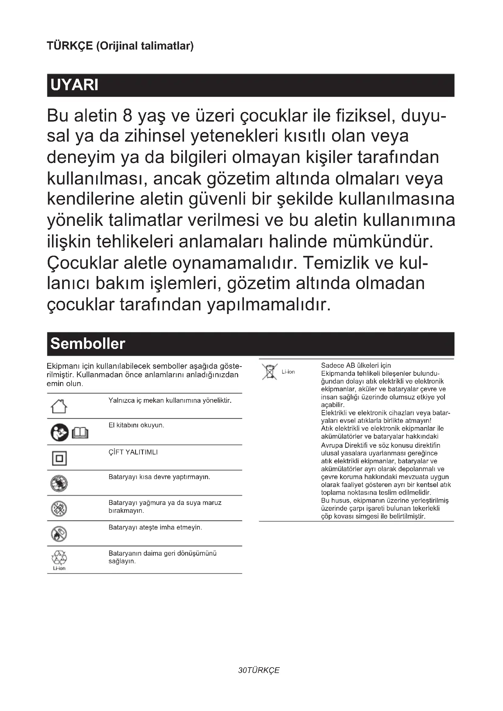 talimatları ve (1) batarya şarj aleti, (2) batarya ve (3) bataryayı kullanan ürün üzerindeki tüm uyarı işaretlerini okuyun.