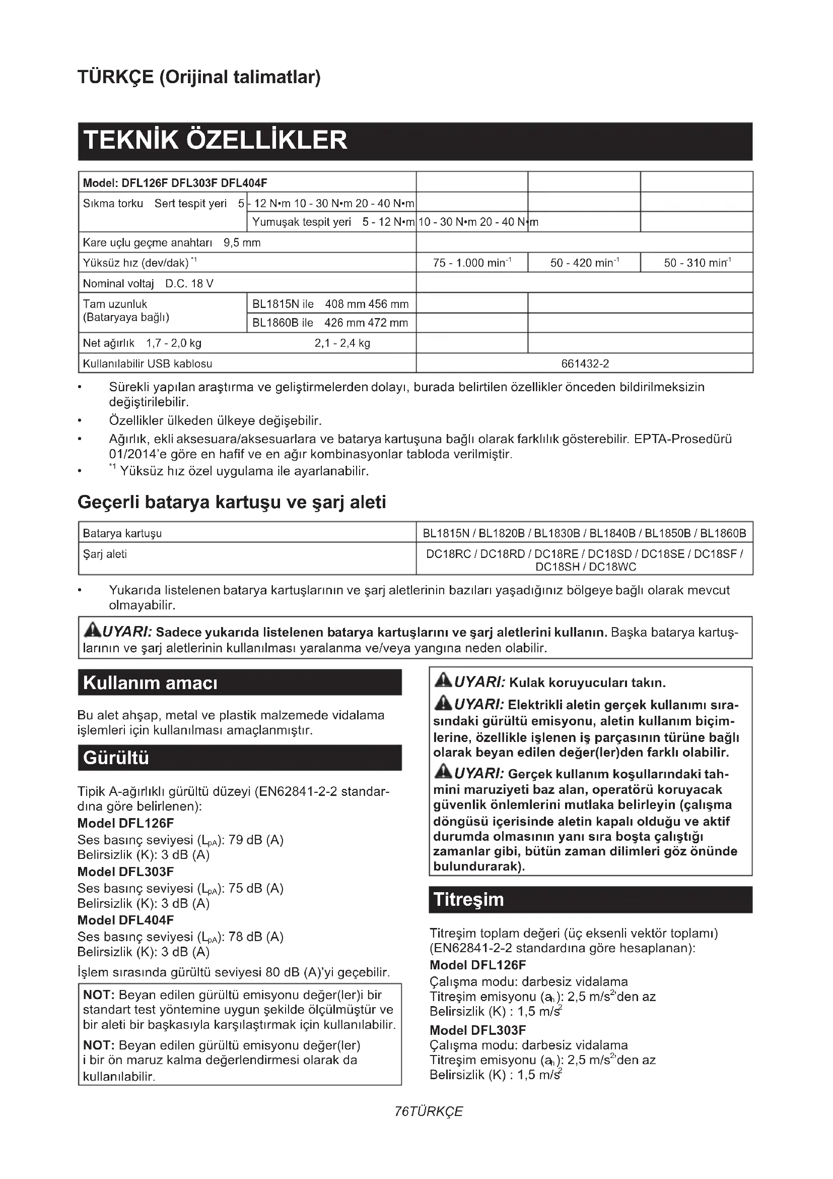 - Yukarıdalistelenenbataryakartuşlarınınveşarjaletlerininbazılarıyaşadığınızbölgeyebağlıolarakmevcut olmayabilir. UYARI: Sadece yukarıda listelenen batarya kartuşlarını ve şarj aletlerini kullanın.Başkabataryakartuş- larınınveşarjaletlerininkullanılmasıyaralanmave/veyayangınanedenolabilir. Kullanım amacı Bualetahşap,metalveplastikmalzemedevidalama işlemleriiçinkullanılmasıamaçlanmıştır. Gürültü TipikA-ağırlıklıgürültüdüzeyi(EN62841-2-2standar- dınagörebelirlenen): Model DFL126F Sesbasınçseviyesi(L