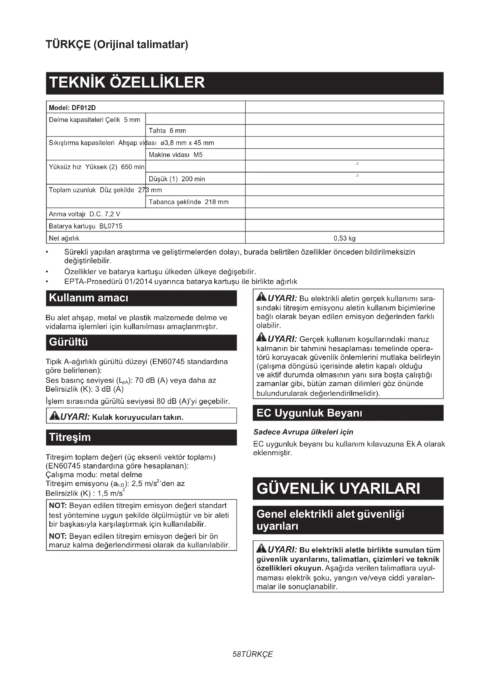 Ön lambanın yakılması DİKKAT: Işığa bakmayın ya da ışık kaynağını doğrudan görmeyin. Lambayıyakmakiçin,lambaanahtarınıAkonumuna kaydırın.Lambayıkapatmakiçin,lambaanahtarınıB konumunakaydırın. Lambayıaçıkbıraksanızbile,5dakikasonralamba otomatikolarakkapanır. ►Şek.6: 1.Lambaanahtarı2.Lamba NOT:Kullanımsırasındabataryagücütükenmek üzereyken,lambayanıpsönerekuyarıverir. Budurumda,bataryayıyenidenşarjedinveyatam şarjlıbaşkabirbataryailedeğiştirin. MONTAJ DİKKAT: Alet üzerinde herhangi bir iş yap- madan önce aletin kapalı ve batarya kartuşunun ayrılmış olduğundan daima emin olun. Tornavida ucunun/lokma ucunun takılması ya da çıkarılması ►Şek.7 Sadeceşekildegösterilentakmakısımlarıolantorna- vidaucunu/lokmaucunukullanın.Başkaherhangibir tornavida/lokmaucukullanmayın.62 TÜRKÇE Tornavida ucu takma deliği sığ olan alet için A=12mm B=9mm Sadecebutiptornavida uçlarınıkullanın.1no.lu prosedürünüizleyin.(Not)Uç ekigereklideğildir. Tornavida ucu takma deliği derin olan alet için A=17mm B=14mm Butüruçlarıtakmakiçin1 no.luprosedürükullanın. A=12mm B=9mm Butüruçlarıtakmakiçin2 no.luprosedürükullanın. (Not)Ucutakmakiçinuçeki gereklidir. 1 No.lu Prosedür ►Şek.8: 1.Tornavidaucu2. Kovan Tornavidaucunutakmakiçin,kovanıokyönündeçekin vetornavidaucunugirebildiğikadarkovanageçirin. Sonratornavidaucunusabitlemekiçinkovanıserbest bırakın. 2 No.lu Prosedür Yukarıdabelirtilen1 no.lu prosedüreekolarak,uç ekinisivriucuiçeribakacakşekildemanşonayerleştirin. ►Şek.9: 1.Tornavidaucu2. Uç eki 3. Kovan Ucuçıkarmakiçin,kovanıokyönündeçekinvetorna- vidaucunudışarıçekin. NOT:Eğertornavidaucukovanıniçineyeterince derinsokulmazsakovanorijinalkonumunadönmez veuçsabitlenmez.Budurumda,ucuyukarıdakitali- matlaragöreyenidentakmayaçalışın. NOT:Tornavidaucunutaktıktansonra,sıkışekilde sabitlendiğindeneminolun.Eğerdışarıçıkıyorsa,ucu kullanmayın. KULLANIM DİKKAT: Aleti tabanca şeklinde kullanmak için bükerken ya da düz şekilde kullanmak için düz- leştirirken, aletin bükülebilir kısmından tutmayın. Aksitakdirde,elinizyadaparmaklarınızbukısımın arasınasıkışıpyaralanabilir. Bualetikişekildekullanılabilir;işyerivevidalamakoşul- larınagöreseçilebilenbirdüzşekilvebirtabancaşekli. ►Şek.10: 1.Düzşekil2.Tabancaşekli Vidalama işlemi DİKKAT: Ayarlama halkasını yaptığınız iş için uygun olan tork seviyesine ayarlayın. DİKKAT: Tornavida ucunun vida başına düz- gün olarak girdiğinden emin olun, aksi takdirde vida ve/veya tornavida ucu hasar görebilir. Matkapucunuvidabaşınayerleştirinvealetebasınç uygulayın.Aletiyavaşhızdabaşlatın,hızıdereceli olarakartırın.Ambreyajdevreyegirergirmezanahtar tetiğibırakın. ►Şek.11 NOT:Ahşapvidalarlaçalışırken,öncevidaçapının 2/3’übüyüklüğündebirpilotdelikdelin.Buişlem, vidalamayıkolaylaştırırveişparçasınınparçalanma- sınıönler. Delme işlemi Önce,ayarlamahalkasınıok işaretinebakacak şekildedöndürün.Ardından,aşağıdabelirtilenşekilde işlemedevamedin. Tahta delerken Tahtadelerken,kılavuzvidalıtahtauçlarıylaeniyi sonuçlareldeedilir.Kılavuzvida,matkapucunuişpar- çasınaçekmeksuretiyledelmeişleminikolaylaştırır. Metal delerken Delikdelmeyebaşlarken,matkapucununkaymasını engellemekiçinzımbaveçekiçyardımıiledelikaçıla- caknoktayaçentikaçın.Çentiküstünematkapucunu yerleştiripdelmeyebaşlayın. Metaldelerkenkesmesoğutucususıvıyıkullanın.Ancak demirveçelikistisnaolupkuruolarakdelinmelidir. DİKKAT: Alete aşırı baskı yapıldığında delme işlemi hızlanmayacaktır.Aşırıbaskımatkapucunun yıpranmasına,aletperformansınındüşmesineve aletinkullanımömrününkısalmasınayolaçacaktır. DİKKAT: Matkap ucu, iş parçasını delip çık- maya başladığında aleti sıkı tutun ve dikkat sarf edin.Deliğinaçılmasısırasındaalet/matkapucu üzerineçokbüyükgüçuygulanır. DİKKAT: Sıkışan bir matkap ucu, aleti ters yöne döndürerek kolayca çıkartılabilir. Fakat bu durumda aleti sıkıca tutmak gerekir, aksi halde alet darbe ile aniden elden çıkabilir. DİKKAT: İş parçalarını daima bir mengene ya da benzer sıkıştırma aygıtlarıyla sabitleyin. DİKKAT: Alet, batarya kartuşu bitene kadar sürekli olarak kullanılmışsa, yeni bir batarya takıp devam etmeden önce 15 dakika dinlenin. Aletin manüel bir tornavida olarak kullanılması ►Şek.12 Aletikapatın. Kilitlemekolunukilitlikonuma getirin. Aletidöndürün. ÖNEMLİ NOT:Aleti5N•m(50Kgf•cm)’dendüşük birsıkmatorkuylakullanın. ÖNEMLİ NOT:Aleti,M6cıvatalarıyadaM6’dan dahabüyükcıvatalarısıkmakyadapaslıvidaları çıkarmakgibiaşırıgüçgerektirenişlerdekullanmayın. NOT:Bukullanım,vidalarınsıkılığınıkontroletmek içinuygundur.63 TÜRKÇE BAKIM DİKKAT: Muayene ya da bakım yapmadan önce aletin kapalı ve batarya kartuşunun çıkartıl- mış olduğundan daima emin olun. ÖNEMLİ NOT: Benzin, tiner, alkol ve benzeri maddeleri kesinlikle kullanmayın. Renk değişimi, deformasyon veya çatlaklar oluşabilir. AletiEMNİYETLİveÇALIŞMAYAHAZIRdurumda tutmakiçinonarımlar,başkahertürlübakımveayar- lamalardaimaMakitayedekparçalarıkullanılarak MakitayetkiliservismerkezleriveyaFabrikanınServis Merkezleritarafındanyapılmalıdır.