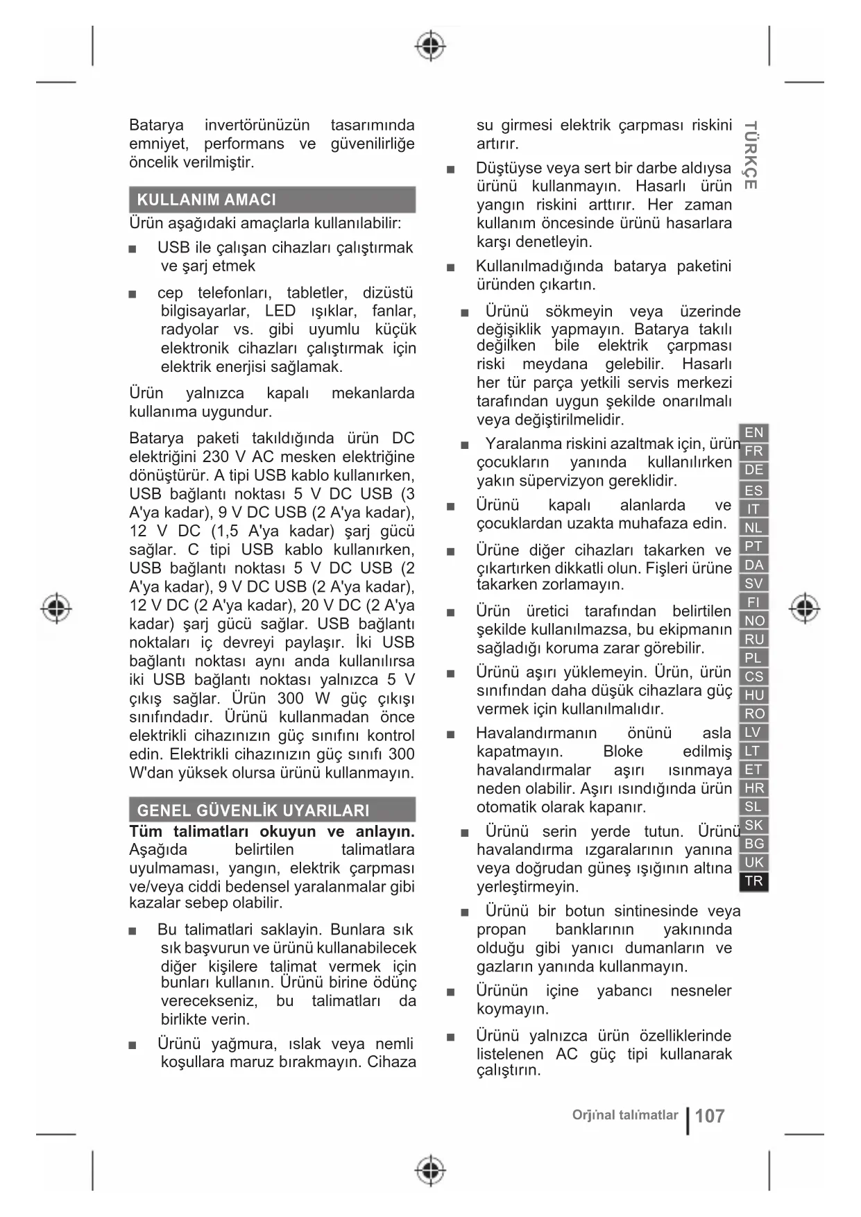 Tüm talimatları okuyun ve anlayın. Aşağıda belirtilen talimatlara uyulmaması, yangın, elektrik çarpması ve/veya ciddi bedensel yaralanmalar gibi kazalar sebep olabilir. ■ Bu talimatlari saklayin. Bunlara sık sık başvurun ve ürünü kullanabilecek diğer kişilere talimat vermek için bunları kullanın. Ürünü birine ödünç verecekseniz, bu talimatları da birlikte verin. ■ Ürünü yağmura, ıslak veya nemli koşullara maruz bırakmayın. Cihaza su girmesi elektrik çarpması riskini artırır. ■ Düştüyse veya sert bir darbe aldıysa ürünü kullanmayın. Hasarlı ürün yangın riskini arttırır. Her zaman kullanım öncesinde ürünü hasarlara karşı denetleyin. ■ Kullanılmadığında batarya paketini üründen çıkartın. ■ Ürünü sökmeyin veya üzerinde değişiklik yapmayın. Batarya takılı değilken bile elektrik çarpması riski meydana gelebilir. Hasarlı her tür parça yetkili servis merkezi tarafından uygun şekilde onarılmalı veya değiştirilmelidir. ■ Yaralanma riskini azaltmak için, ürün çocukların yanında kullanılırken yakın süpervizyon gereklidir. ■ Ürünü kapalı alanlarda ve çocuklardan uzakta muhafaza edin. ■ Ürüne diğer cihazları takarken ve çıkartırken dikkatli olun. Fişleri ürüne takarken zorlamayın. ■ Ürün üretici tarafından belirtilen şekilde kullanılmazsa, bu ekipmanın sağladığı koruma zarar görebilir. ■ Ürünü aşırı yüklemeyin. Ürün, ürün sınıfından daha düşük cihazlara güç vermek için kullanılmalıdır. ■ Havalandırmanın önünü asla kapatmayın. Bloke edilmiş havalandırmalar aşırı ısınmaya neden olabilir. Aşırı ısındığında ürün otomatik olarak kapanır. ■ Ürünü serin yerde tutun. Ürünü havalandırma ızgaralarının yanına veya doğrudan güneş ışığının altına yerleştirmeyin. ■ Ürünü bir botun sintinesinde veya propan banklarının yakınında olduğu gibi yanıcı dumanların ve gazların yanında kullanmayın. ■ Ürünün içine yabancı nesneler koymayın. ■ Ürünü yalnızca ürün özelliklerinde listelenen AC güç tipi kullanarak çalıştırın.