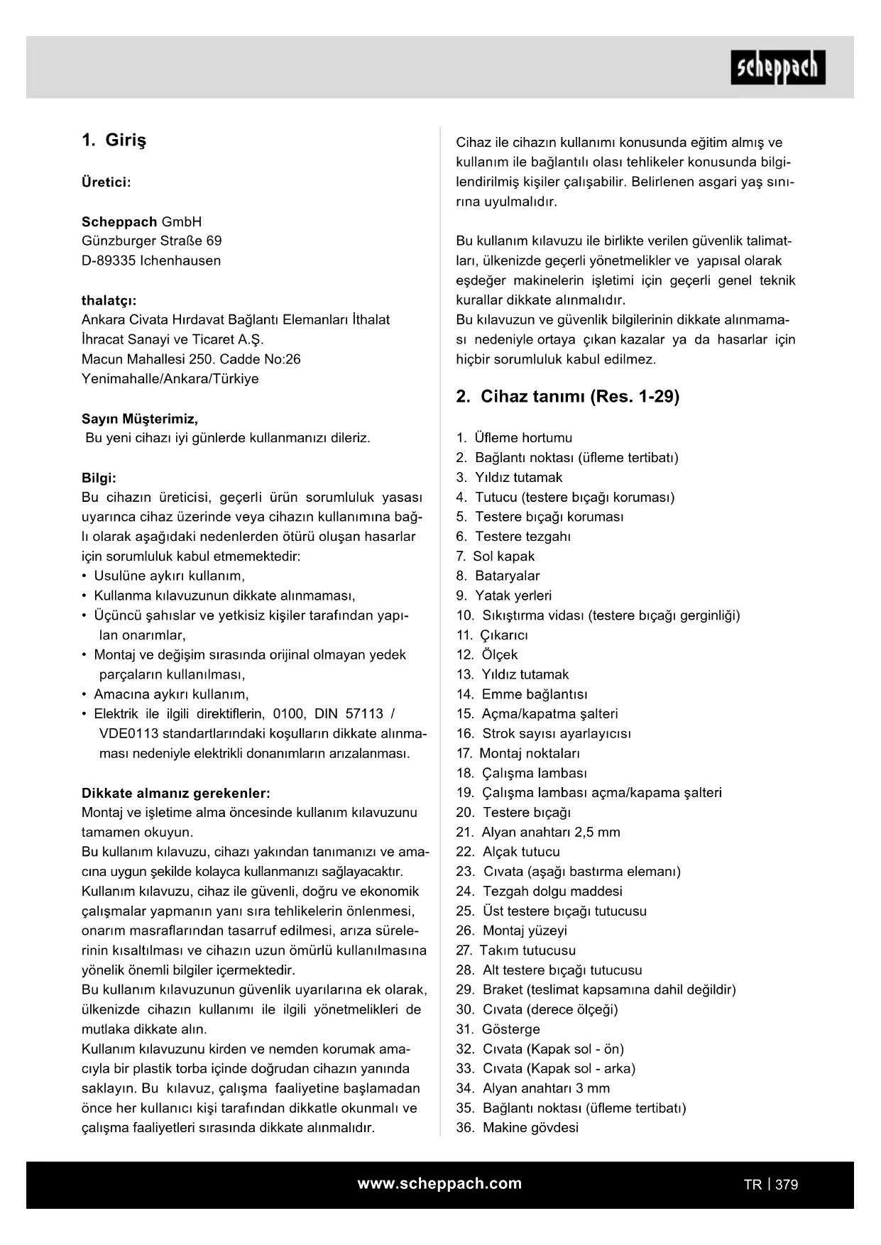 - Amacına uygun kullanıma, güvenlik uyarılarının, montaj kılavuzunun ve kullanım kılavuzundaki işle- tim uyarılarının dikkate alınması da dahildir.www.scheppach.com